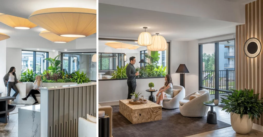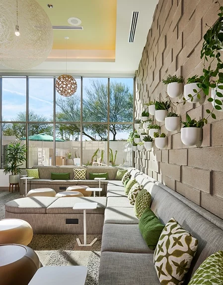 Surrounded by a lush canopy of foliage, at Lyra by Radius we were tasked with emphasizing the natural surroundings by considering the views from every angle of the building. The goal was to highlight the ever-present greenery of the landscaping or the central amenity pool deck. To do so, we utilized interior planters and glazing partitions as a way for the spaces to feel divided yet connected.