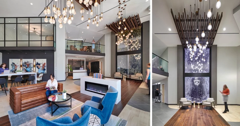 Attractive water features can increase the value of a space, along with the length of tenant stay. Water features can provide a gathering space for conversation, a separate area for working, or the perfect backdrop for a social media post. Water also contributes to the wellness of the space by improving air quality once the water evaporates. The sound of water can provide a sense of calm by masking distracting sounds.