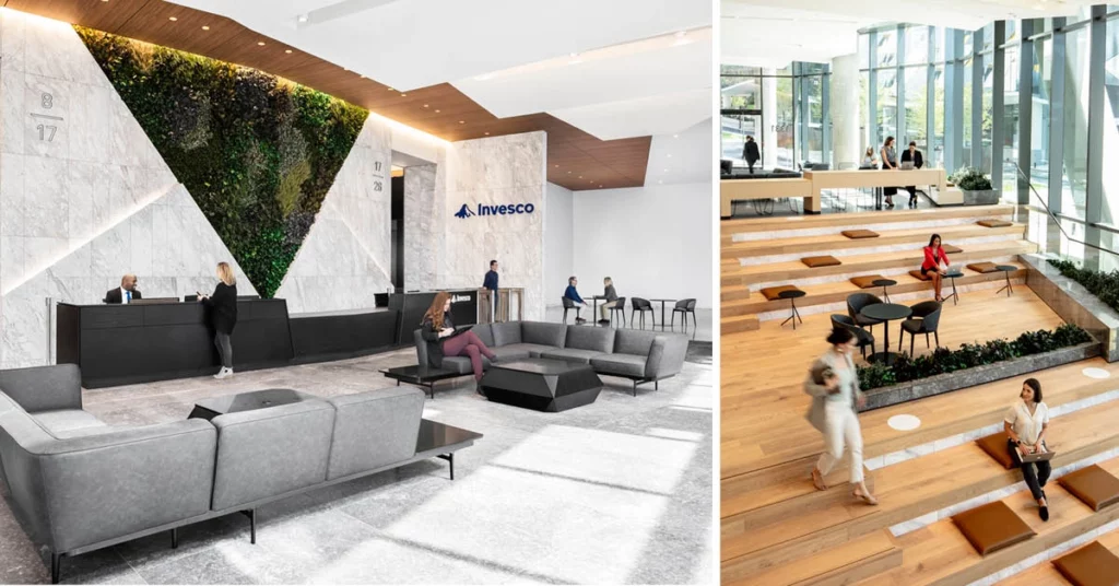 We used preserved plants at Midtown Union to reflect Atlanta’s nickname, The City in the Forest. The arrival experience features a massive triangle-shaped preserved plant display behind the reception desk. The split-level lobby is connected by a staircase and platform seating that can be used to host large speaking engagements, or as a flexible working and lounge space throughout the day. Interior greenery mimics the exterior landscape and surrounds the seating. Check out our LinkedIn for more details on this project.