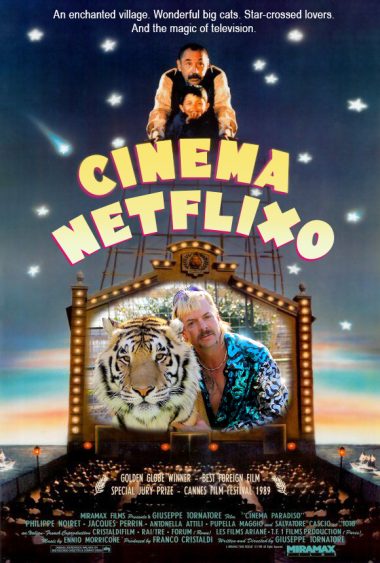 Cinema Paradiso: We changed this Oscar-winning movie to Cinema Netflixo, since none of us can go to the movies right now. The screen features an image from “Tiger King: Murder, Mayhem and Madness,” the Netflix documentary that has already been viewed by more than 34 million people while they entertain themselves at home.