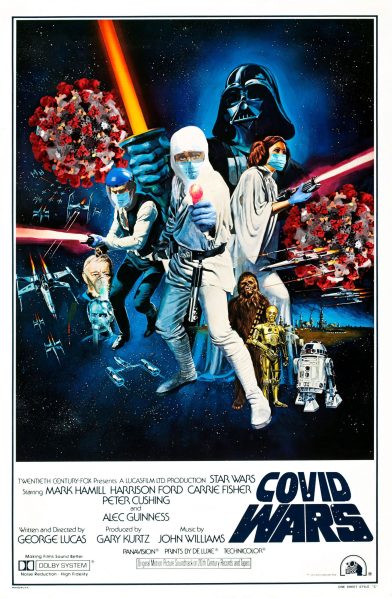 Star Wars: Han, Luke and Leia, here representing our heroic frontline healthcare workers, are fighting off the red-spiked image symbolizing coronavirus that was designed by the CDC. (original poster designed by Tom Chantrell)