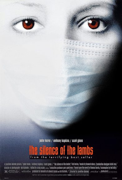 The Silence of the Lambs: We replaced the death’s head hawkmoth covering the lips of lead actress Jodie Foster with today’s ubiquitous face mask. (original poster by Dawn Baillie)