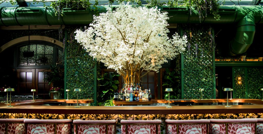 Art also plays a leading role and connects the 3,070-square-foot, enclosed terrace with Atlas Restaurant, designed by The Johnson Studio at Cooper Carry in 2019 and known for its premier art collection. A prominent feature in The Garden Room is a mural made in Italy with hand-cut glass tiles reinterpreting one of Gustav Klimt’s portraits of Ria Munk. This takes center stage in the outdoor area, adding to the dramatic effect.