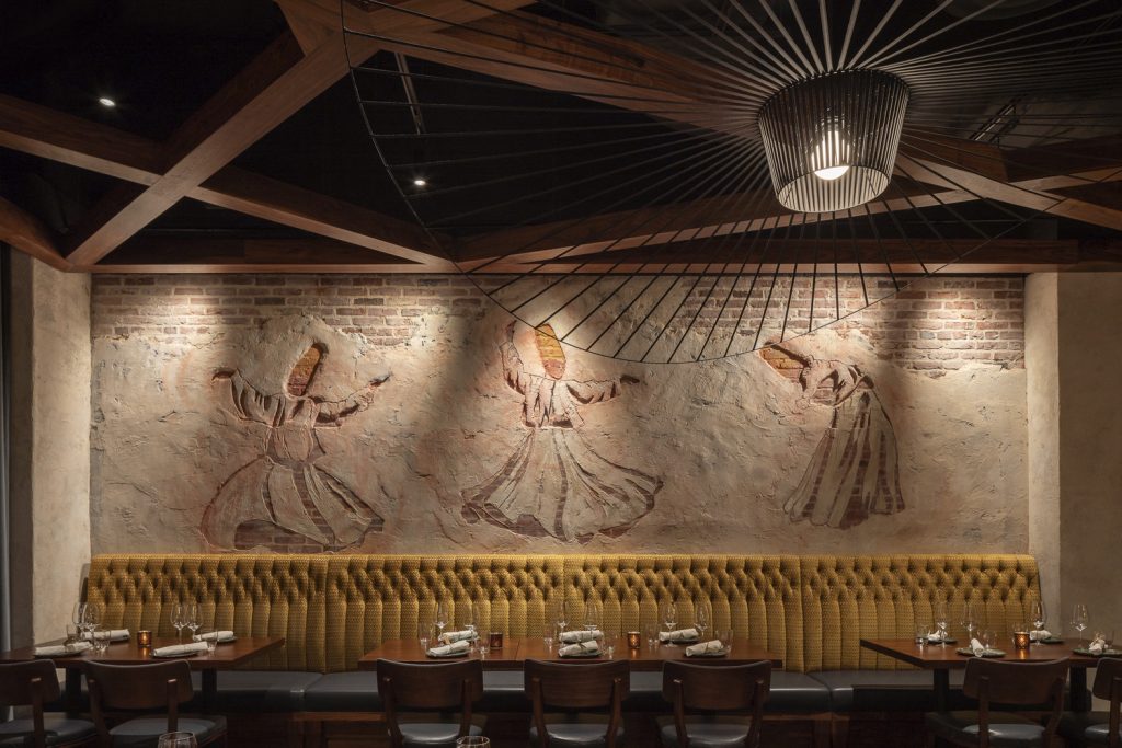 The movement of whirling dervishes, Persian calligraphy, and rustic old-world architectural elements inspired the design. Murals carved into the walls create a focal point in the dining room, while chandeliers jut across the walnut ceilings, mimicking the dancers. Traditional gold and Persian blue incorporated throughout imbue the warmth and history of the cuisine, which is on display in the blue tile-clad expo kitchen with Tandoor ovens.