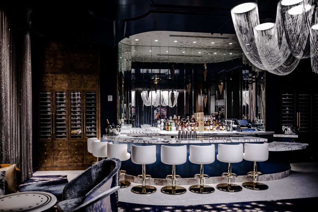 Guests enter from inside the restaurant via a hallway of sparkling wallpaper or from a secret outside entrance. The glittering space opens up to small bar with a large custom-designed lighting feature mimicking the movement of sparkling wine. Sequined drapery dresses the walls, while the light fixture illuminates the vintage ice buckets and crystal decanters. The contemporary pop art throughout the space was carefully curated to offer a contrast from the shiny décor and mirrored surfaces. Many of it was provided by local artists.