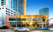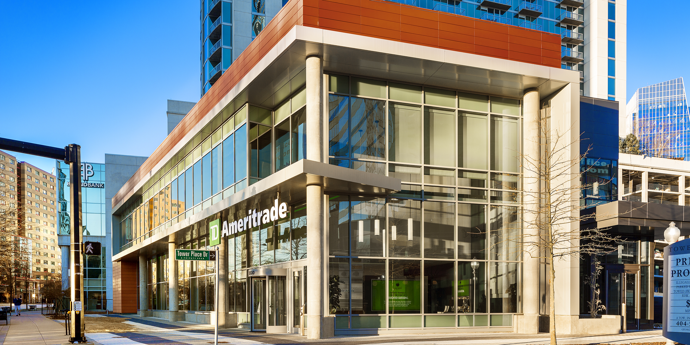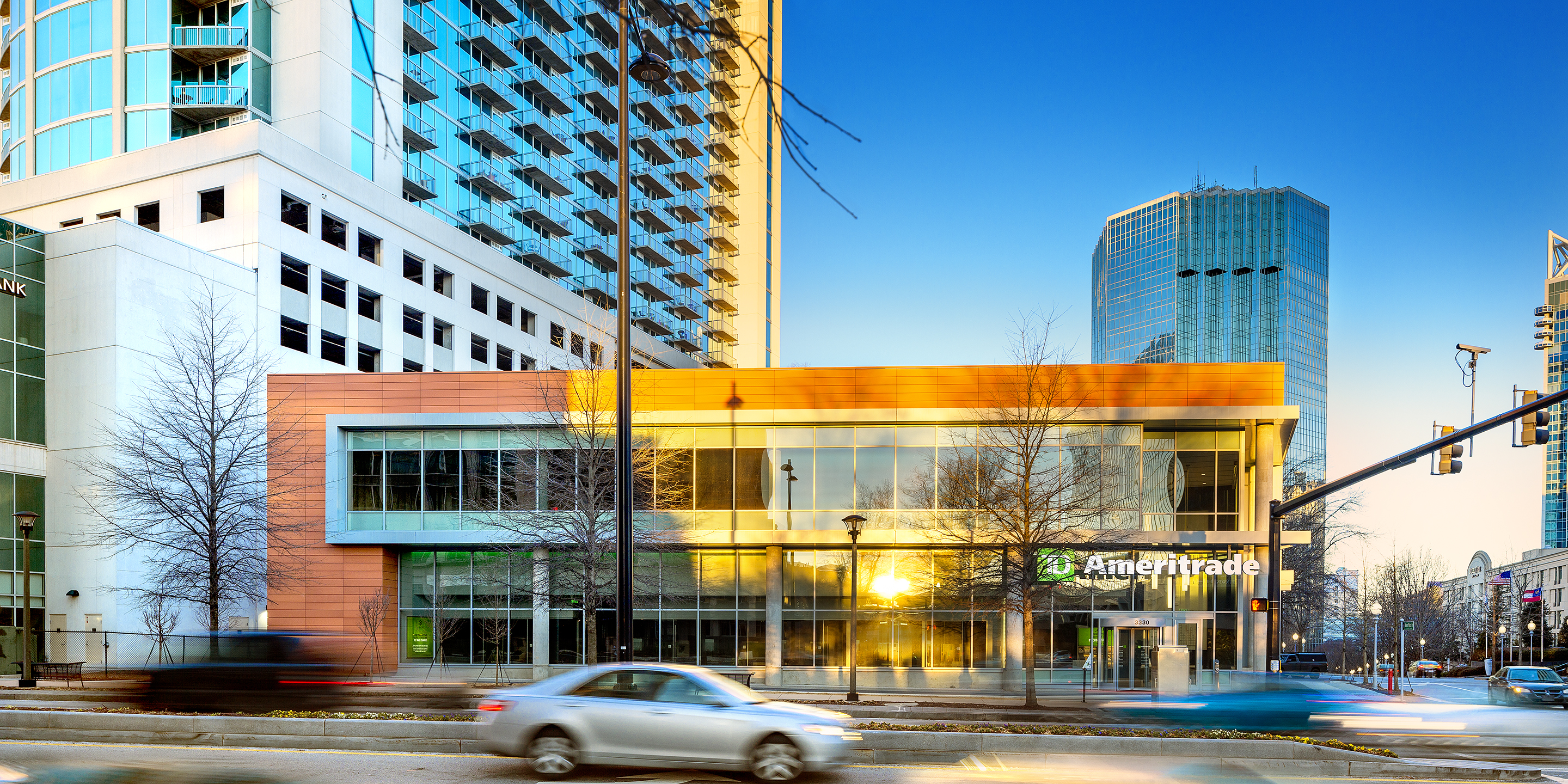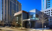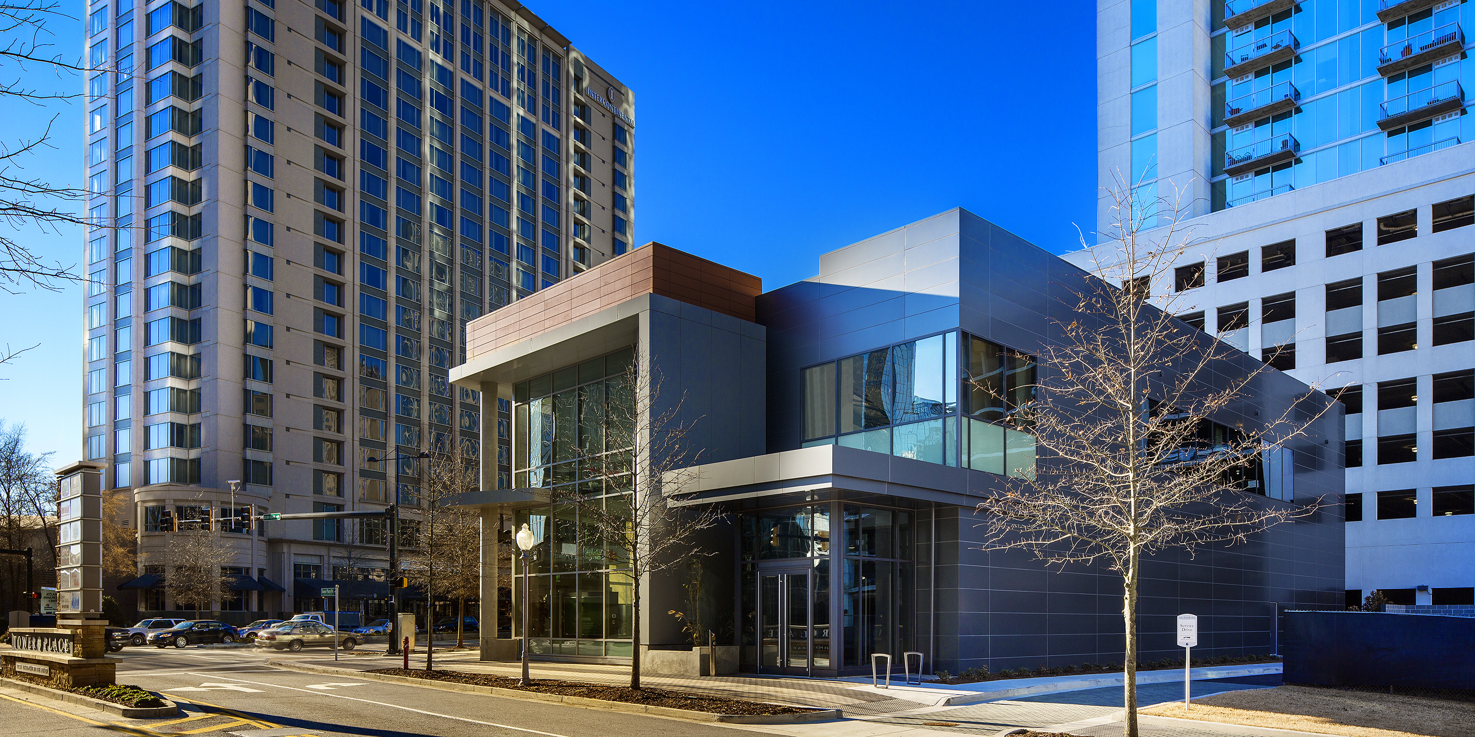 The 3330 Peachtree Road building is a contemporary two-level retail/professional office building fronting on Peachtree Road at the entrance to the Tower Place Mixed-Use Development. The two-story building is designed for ground level retail/office space in accordance with the current street-frontage zoning requirements of the Buckhead SPI-12 overlay zoning district, and incorporates a speculative second floor office space with an independent tenant lobby element fronting on Tower Place Drive. The contemporary massing of the building incorporates a “ribbon” element clad in architectural composite metal cladding systems that implies movement and frames the aluminum glazing systems that compose the primary project frontages. The ACM clad ribbon element works in composition with Terra-Cotta rainscreen cladding and ACM metal wall panels to provide a crisp, modern addition to the progressive Buckhead street-level retail scene.