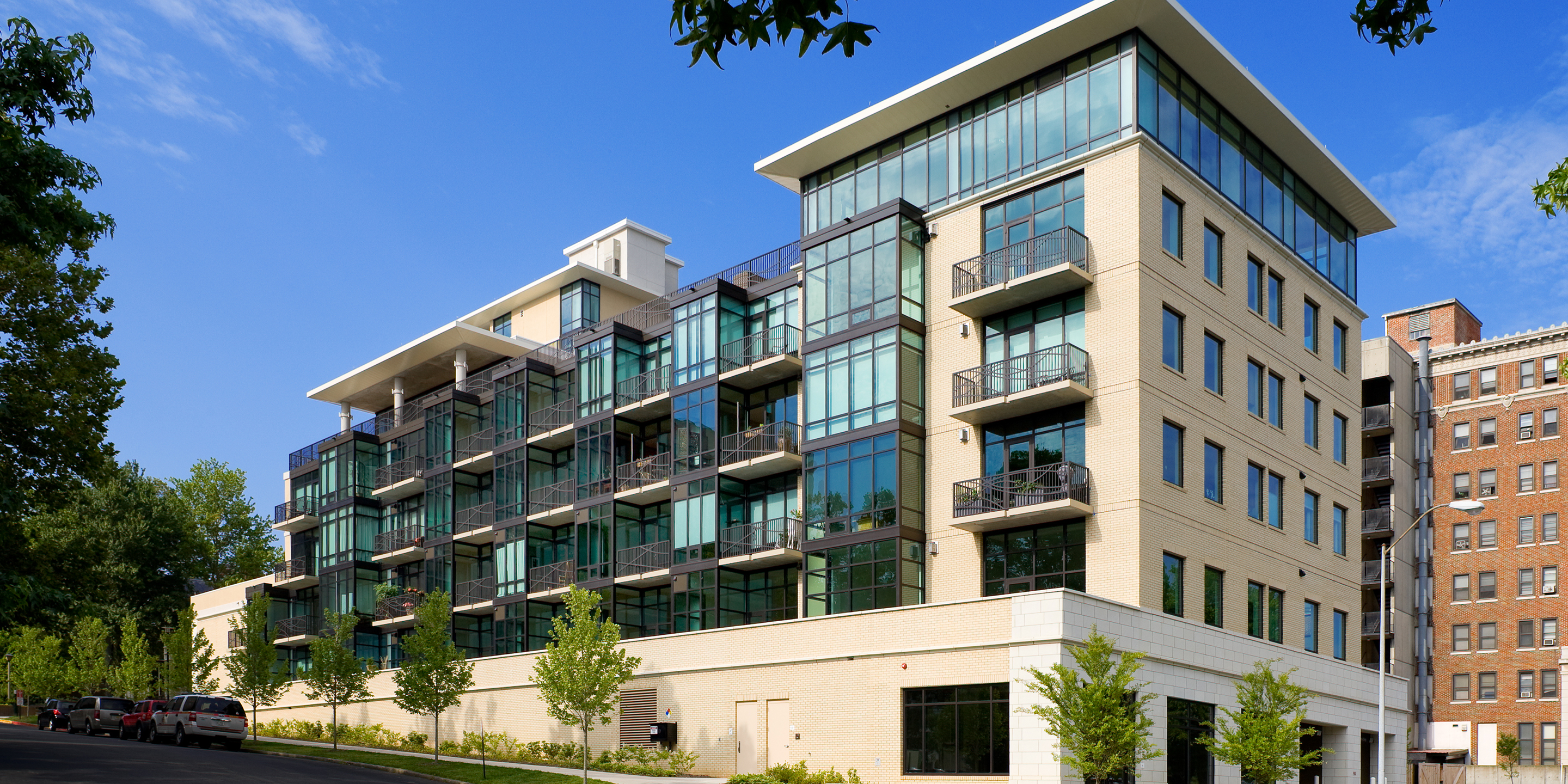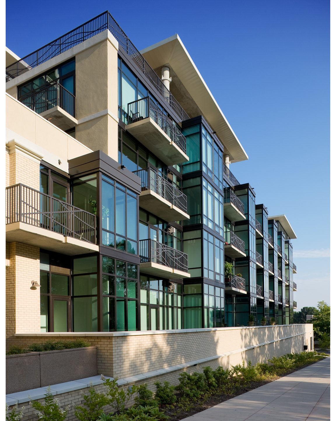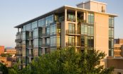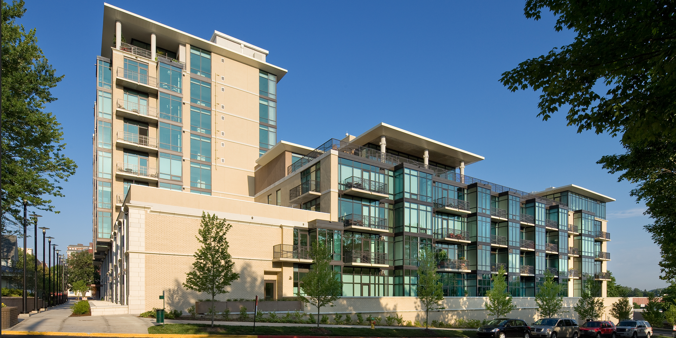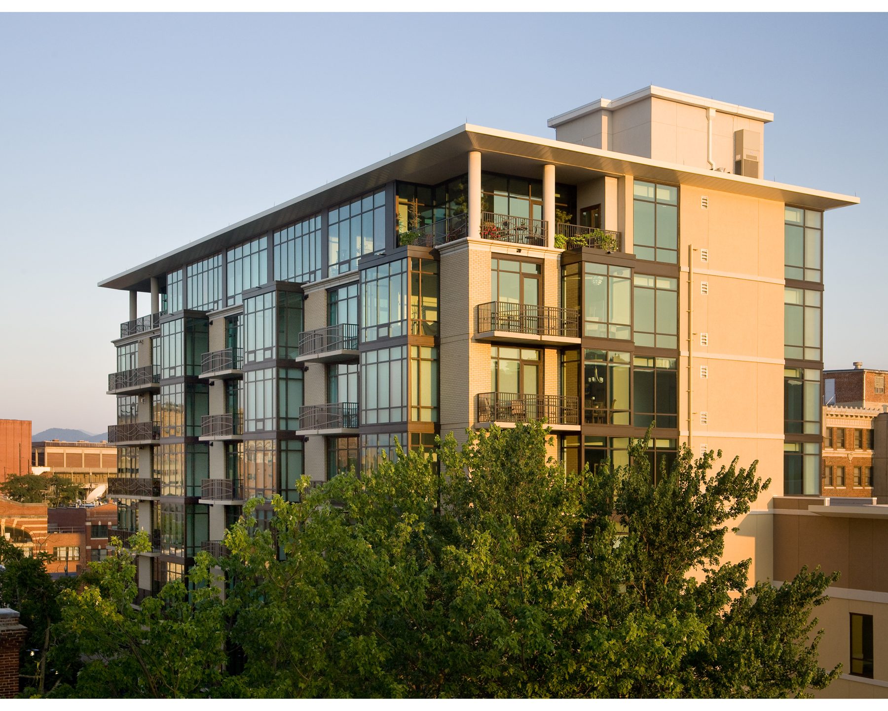 60 North Market Street is a mixed-use development in downtown Asheville, North Carolina, in the heart of the Blue Ridge Mountains. Located two and a half blocks north of Pack Square, it is accessible to downtown shopping and dining while affording fine views of the mountains to the north and northeast of town. The site spans through mid-block, connecting Market and Woodfin Streets, and shares a landscaped alley with the Thomas Wolfe Home and Visitor’s Center. Ground floor retail space is available on both street fronts with dedicated sidewalk entrances and access to parking in the building. The residential building is comprised of nine floors and seventy-five units in studio, one, and two bedroom configurations with two separate penthouse wings. The residential building entry lobby is on Market Street, and nine ground floor town home units enjoy private entrances along the landscaped alley. Private and public parking is provided in a two-story garage under the building with a private elevator connecting the residential parking areas to every occupied floor.