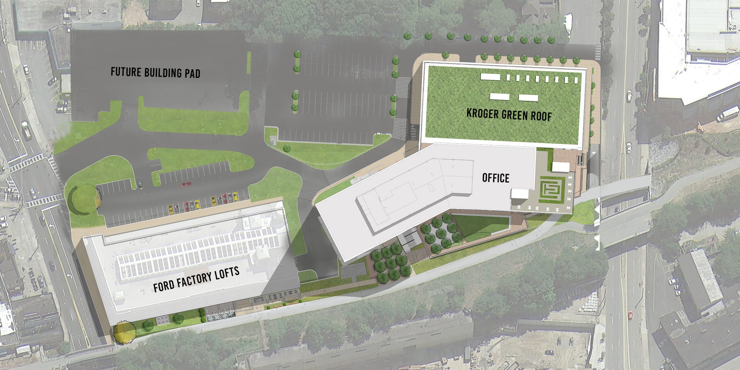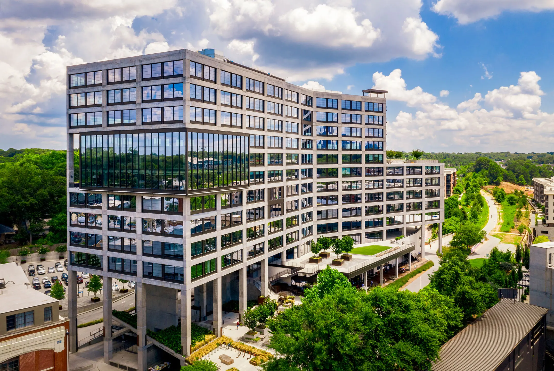 The pedestrian-oriented site includes a new 60,000 SF Kroger grocery store and 12-story office building with 370,000 SF of modern industrial office space designed to complement the surrounding historic buildings. The offices have amenity terraces overlooking Historic Fourth Ward Park, while the building lobby and retail space have direct access to the BeltLine through a terraced landscape.
