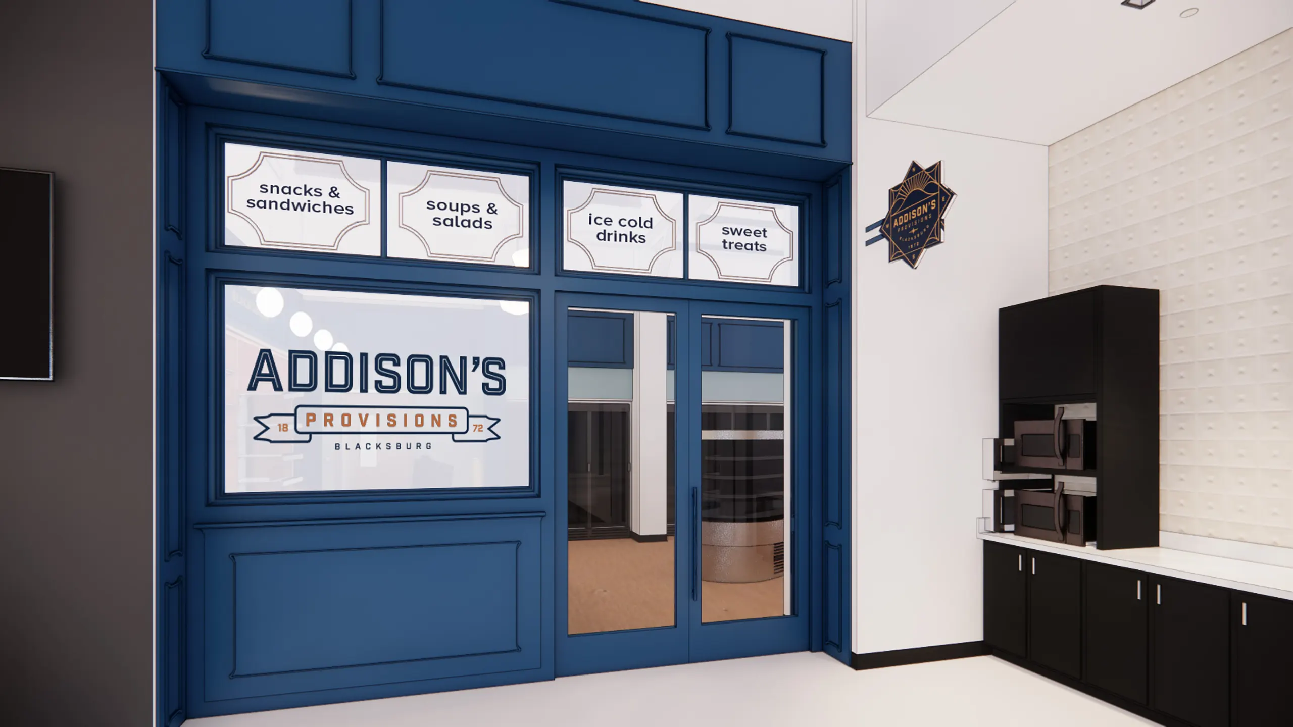 Addison's Provisions is a grab and go retail market brand developed by Cooper Carry's branding team for the new dining facilities at Hitt Hall at Virginia Tech. Inspired by the first student to enroll at Virginia Tech in 1872, Addison Caldwell hiked 28 miles through the forest to sign up as a student. Addison’s branding is reminiscent of the industrial age. The bold, inline type is paired with a banner motif which celebrates the year of Addison Caldwell’s hike and the city of Blacksburg, Virginia. The badge design features the mountains surrounding Blacksburg and compass points reinforcing the source of inspiration for the brand.