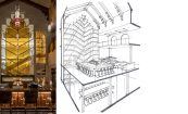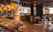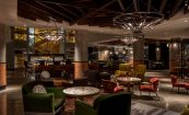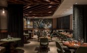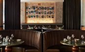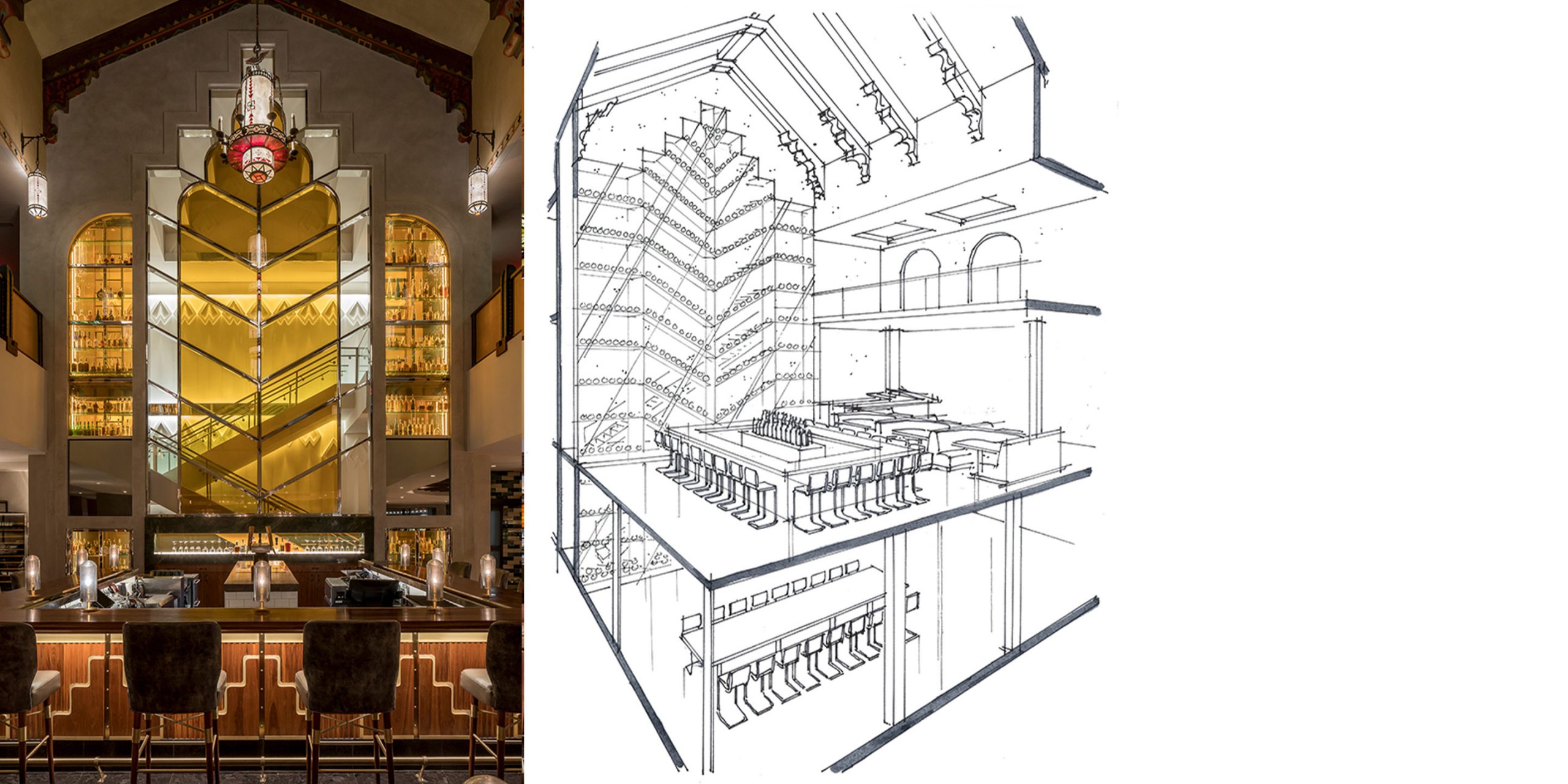 Built in 1930, the recently rehabilitated Plaza Hotel Pioneer Park was the first high-rise in Conrad Hilton’s hotel empire and is listed on the National Register of Historic Places. For the hotel’s new casual dining restaurant Ambar we created a palette of rich walnut wood, jewel-tone velvet and mohair fabrics, warm brass metals and leather for interior design of the bar and restaurant. Contemporary furnishings blend luxury with rough-hewn casual elegance. Custom light fixtures borrow details from original lighting, while Mexican hand-tooled leather panels wrap columns and kitchen counters, evoking the distinct spirit of the place. We also reinstated the original double-height atrium, which had been capped in a previous renovation, to bring back the grand entrance as the heart of the building. The focal point of the atrium is the dramatic back bar, rising 40 feet high and displaying one of Texas’ largest tequila collections behind a sheath of amber glass and polished stainless steel. A new staircase is partially concealed behind the bar, providing access to the wall of tequila, and secretly connecting the bar and restaurant down to a cellar-like private dining space located in the former boiler rooms.