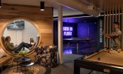 The project is known for its best-in-class amenities, squarely aimed at its target market. Key features of the interior design are a monumental spiral stair, a “swing lounge," a coffee lounge with individual huddle booths, a large amenity level that houses a fitness center, yoga room and rooftop swimming pool, a club room on Level 21, a private fitness center, club room and wine tasting room on Level 22, and a “basement” amenity which has a game room, theater room, and makers' space fully-equipped with tools. The property also features a bocce ball court, a designated rideshare pickup area, and pet spa. Several exterior lounge spaces can also be found throughout the property.