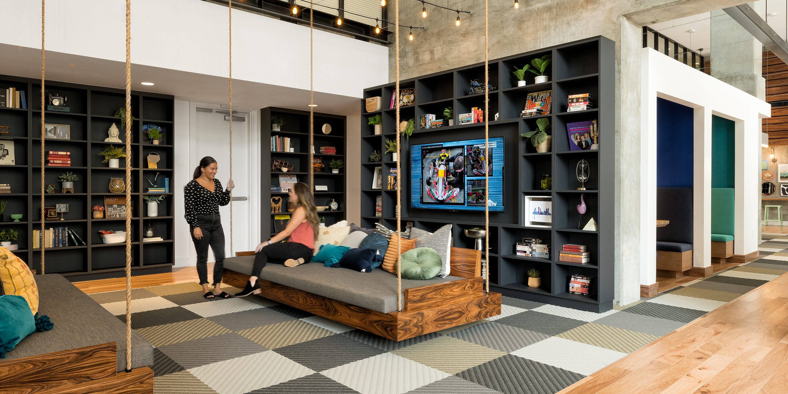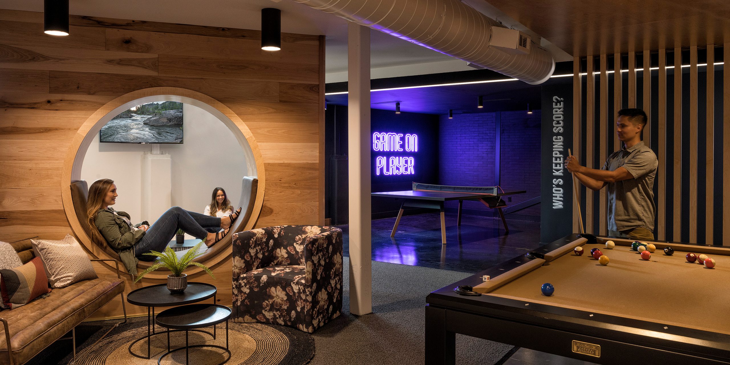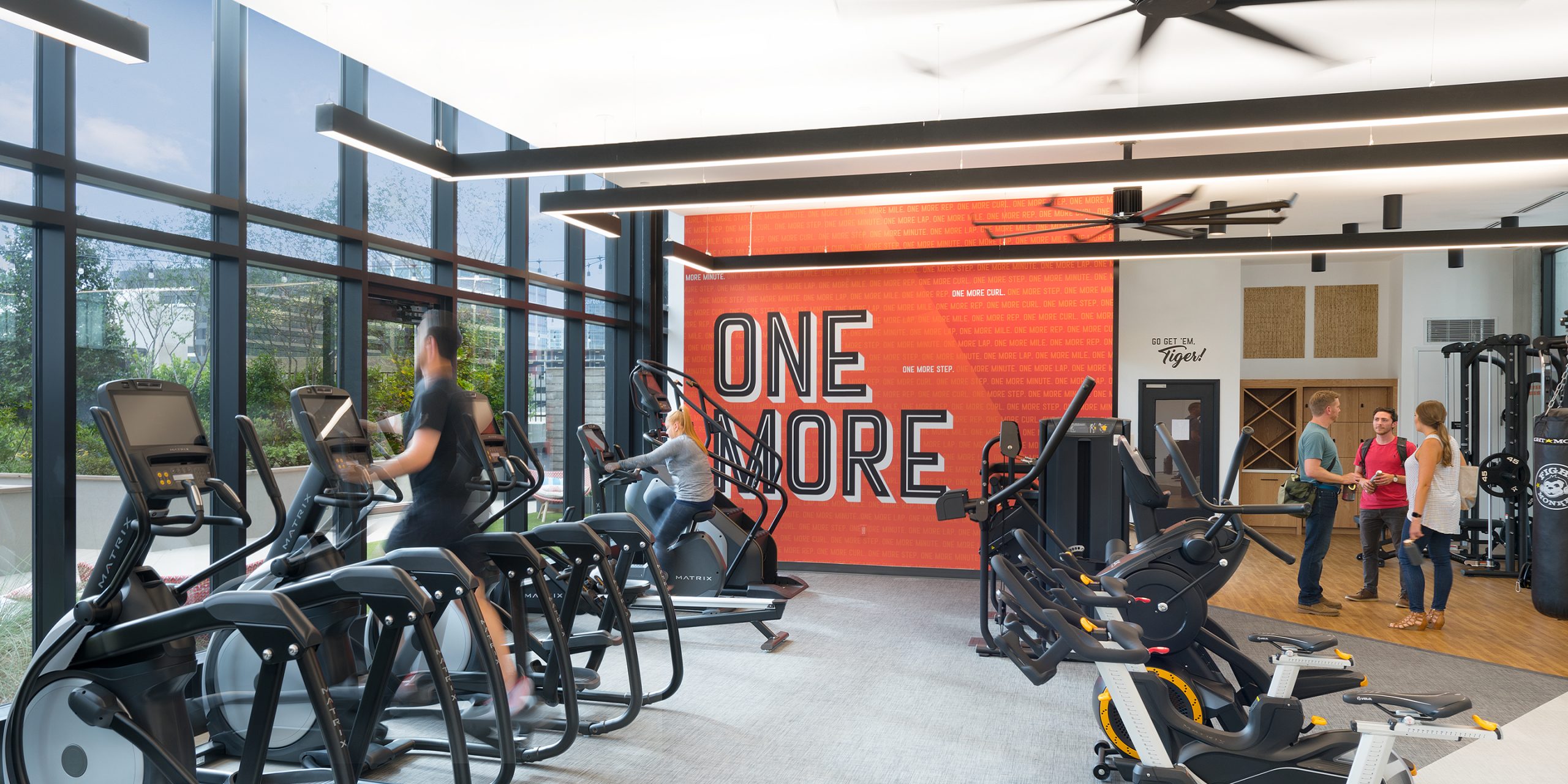 Cooper Carry's Interior Design Studio, Environmental Graphic Design Studio and Branding Studio worked closely together to ensure this project resonated with potential residents and helped AMLI Lenox have its own personality among adjacent residential projects. Our team came together early in the project to create environmental branding, ensuring all touchpoints were strong and consistent. Our team's objective was to create a logotype that embodied the identity of this property, from exterior and interior finishes to amenity spaces and signage. The spaces are full of energy with woven textiles, bright accents, neon signs, and quirky messages throughout. The logotype is professional, but not too serious. The use of a unicase typeface communicates this quirkiness, through upper and lowercase letters paired together.