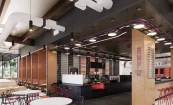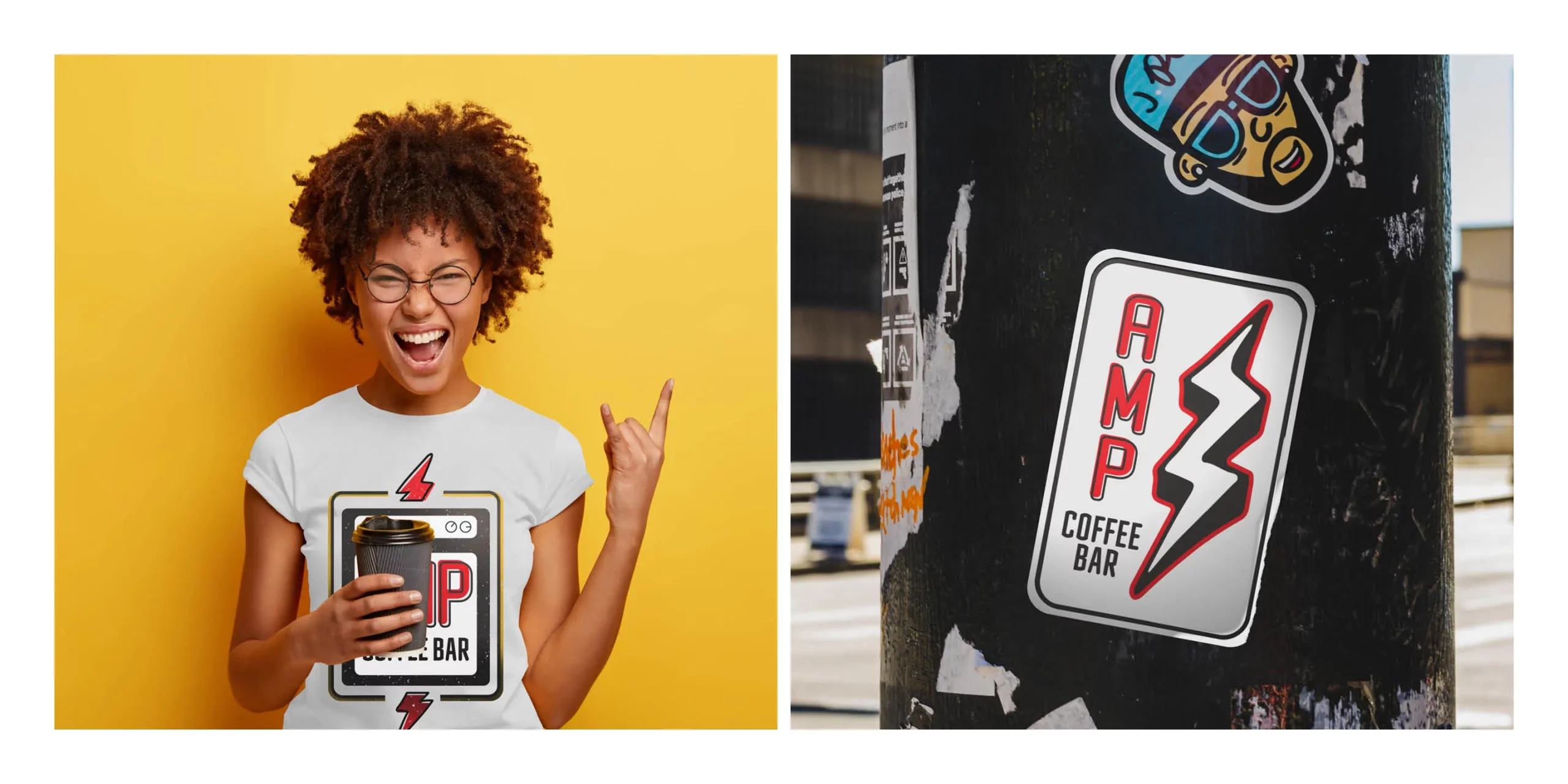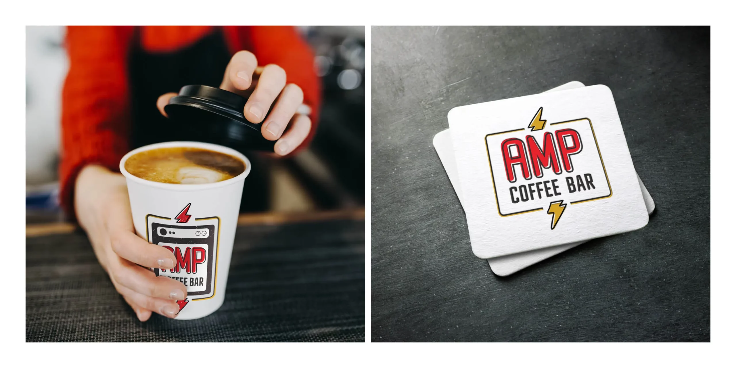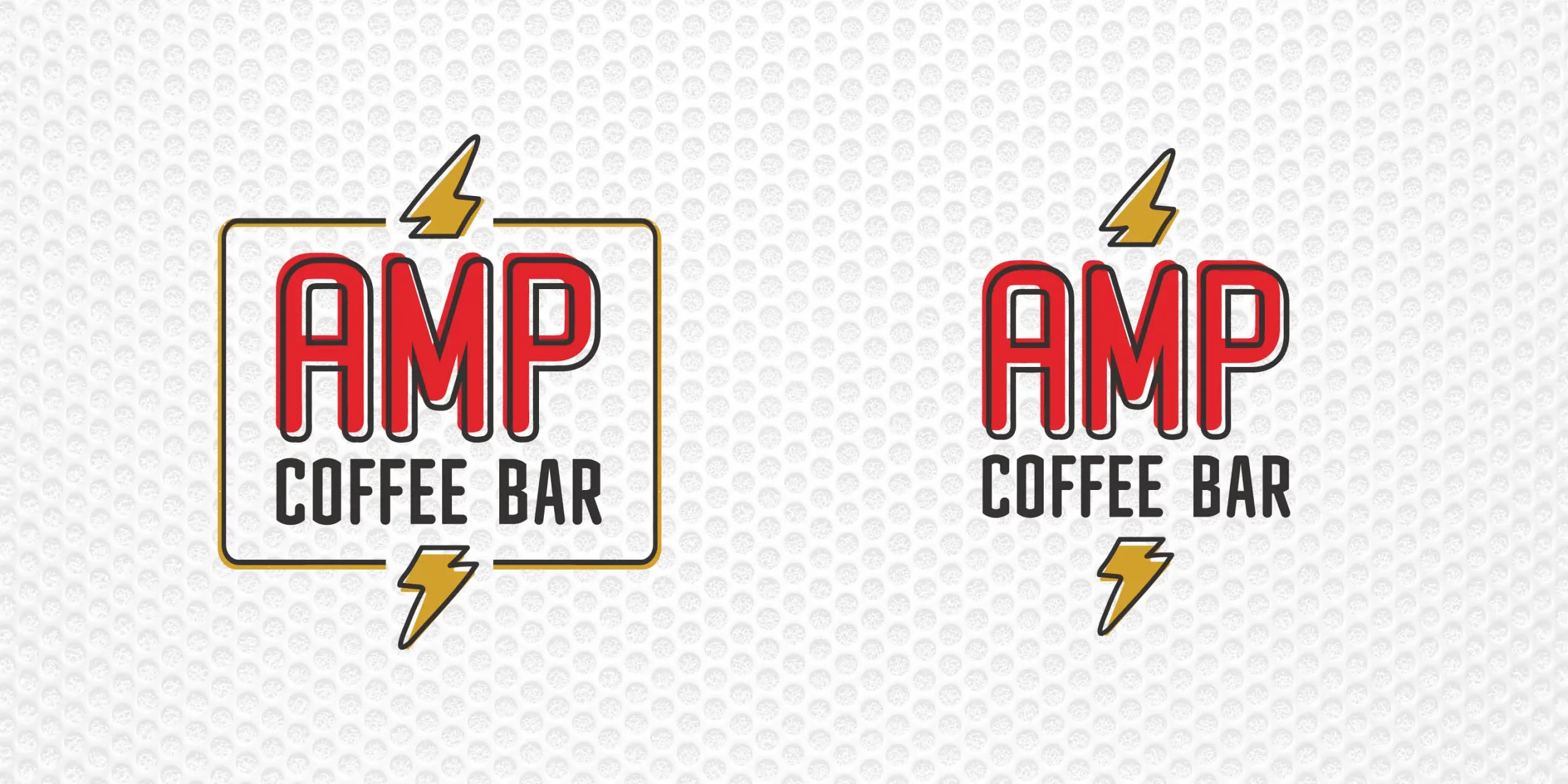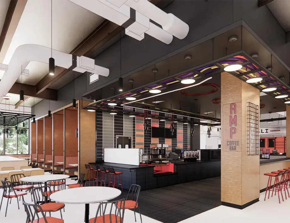 Cooper Carry's brand team developed the AMP coffee bar brand for the new dining facilities at Hitt Hall at Virginia Tech. This dining hall outlet will be coffee and baked goods focused, so Cooper Carry developed the short and punchy concept AMP, with a nod to the effects of caffeine, and the perennial popularity of music among college students. Inspired by rock ‘n roll and the energy infused in music, Amp Coffee Bar’s brand is fun and vibrant. The rounded typeface was chosen to resemble the curved edges of musical instruments. The lightning bolt motif is designed to show energy and movement as it pierces through the center of the design. The badge design features a minimalist electric amplifier to frame the overall design.