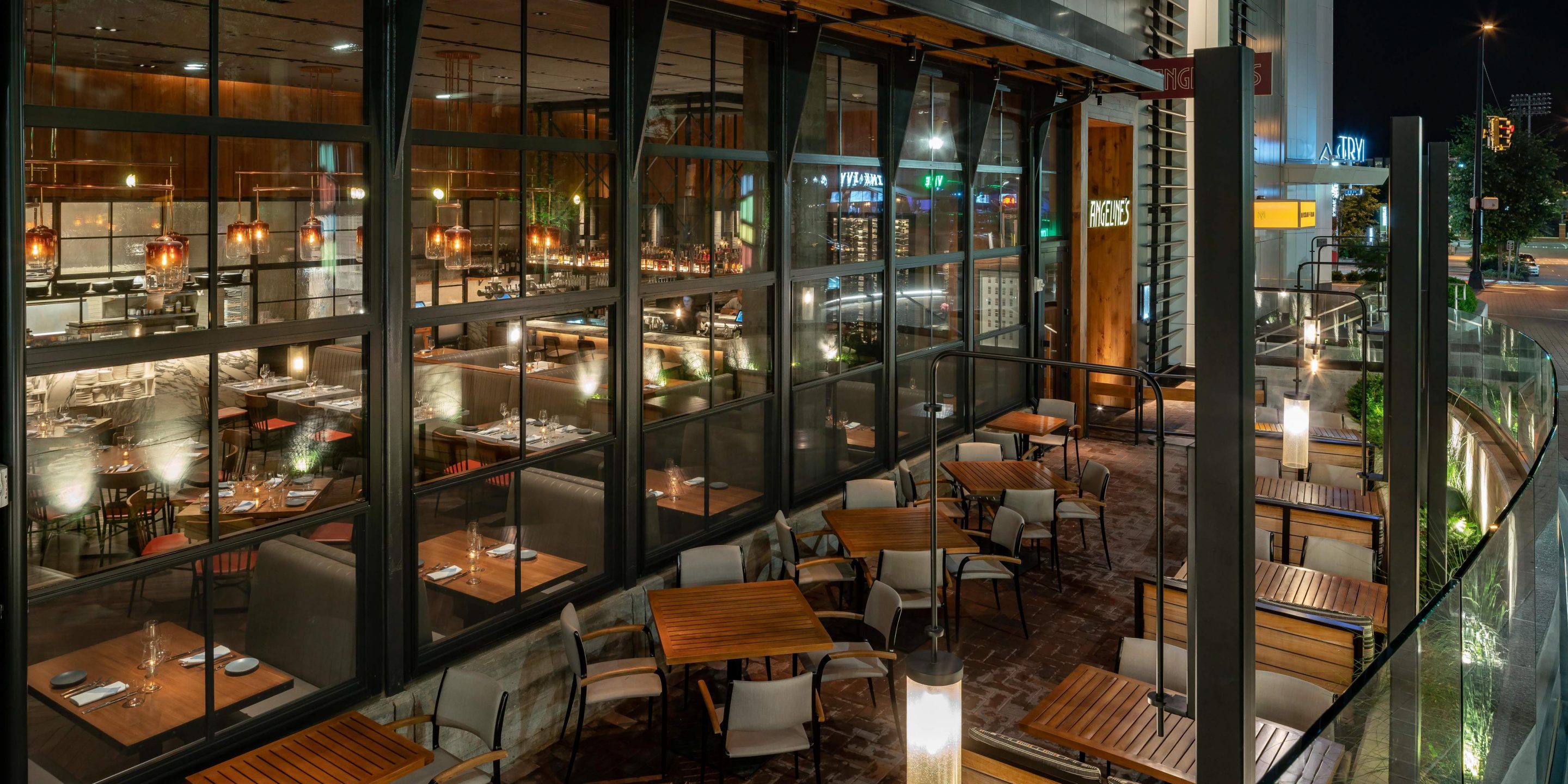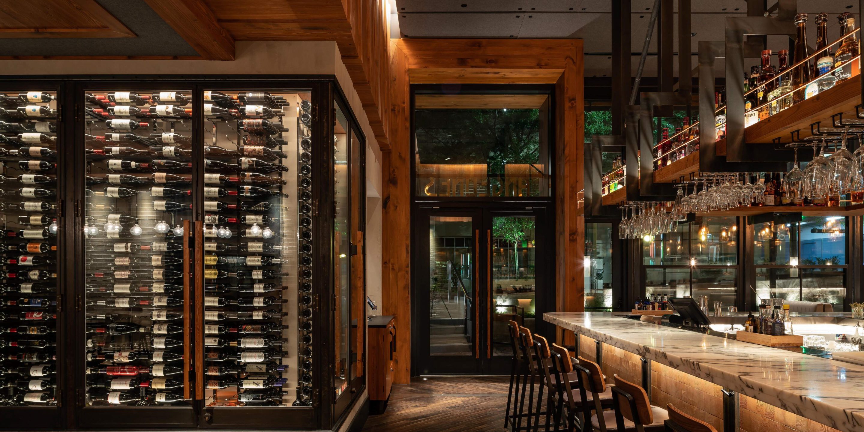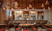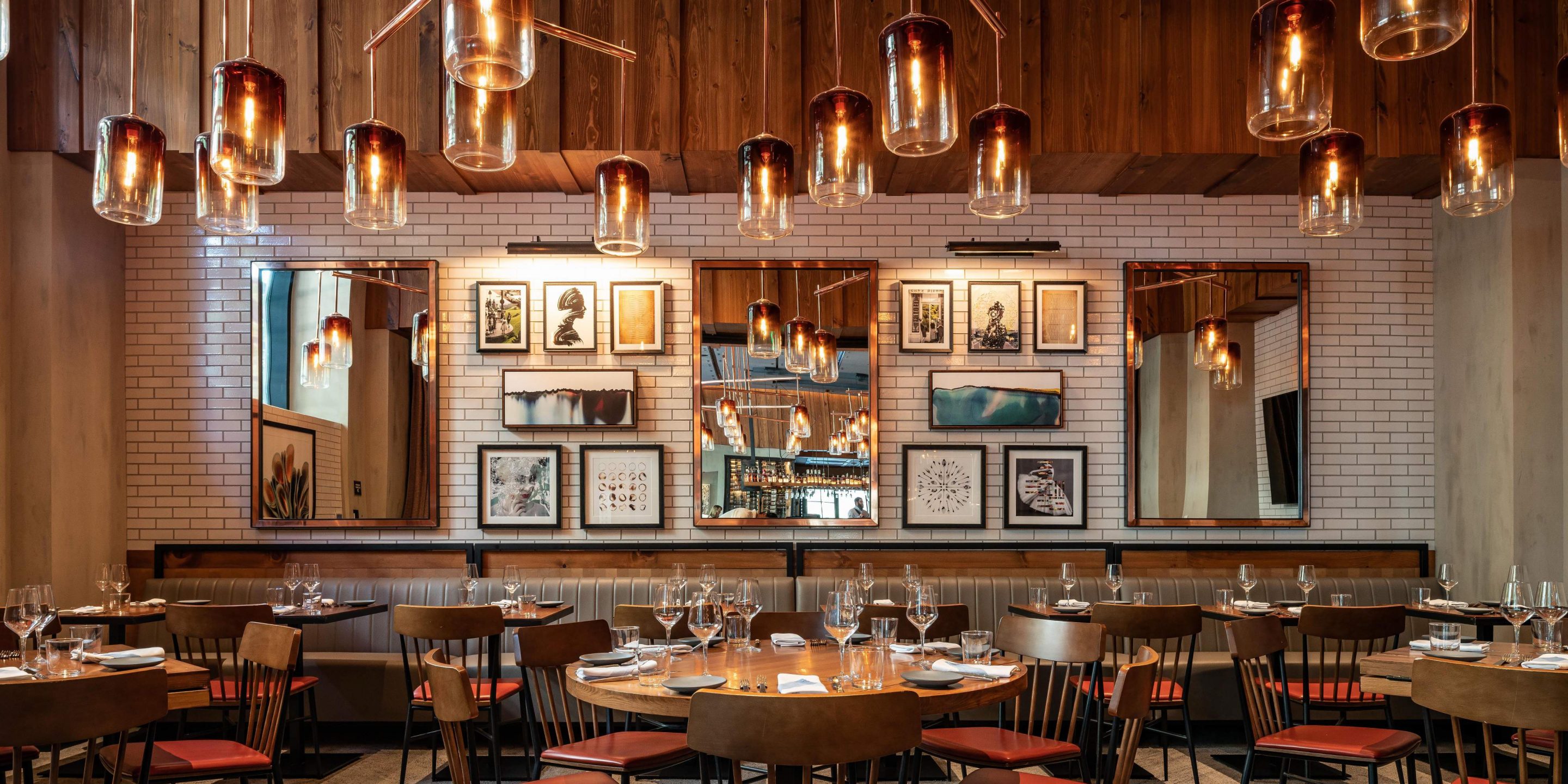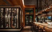 The guests' experience begins when they enter Angeline's either from the hotel lobby or from the exterior entry off of Third Street and are immediately surrounded by a full height well-lit wine wall showing off the restaurant's extensive Italian wine selection. Also within immediate site of the entrance is a long, rustic communal table and a warm fireplace. The intimate bar seats 18 and is scaled to feel welcoming and convivial. Overbar shelves with glowing liquor bottles and custom light fixtures give the bar a vibrant feel. Beyond the bar the dining room has an energetic, modern feel with a high volume space, an expo kitchen and a glass wall that opens up onto patio dining with the city's park as a backdrop. The dining room's high ceilings are surrounded by warm wood and blackened metal details with custom chandeliers that fill the tall volume and add sparkle to the dining room.