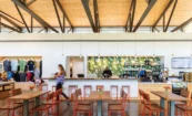 Expansive views across the fields and orchards inspire picnics and strolling, while adjacent trails and the forest edge invite visitors to explore. The Gateway Canteen features simple elements, yet each coordinated to serve a distinct purpose. For example, natural materials recall the elemental, and the heavy masonry walls anchor the airy, sunlight-filled space to the earth. A warm wood ceiling drapes over the main space and frames views to the landscape. Outside, a polished concrete floor flows from porch to the nearby trail.