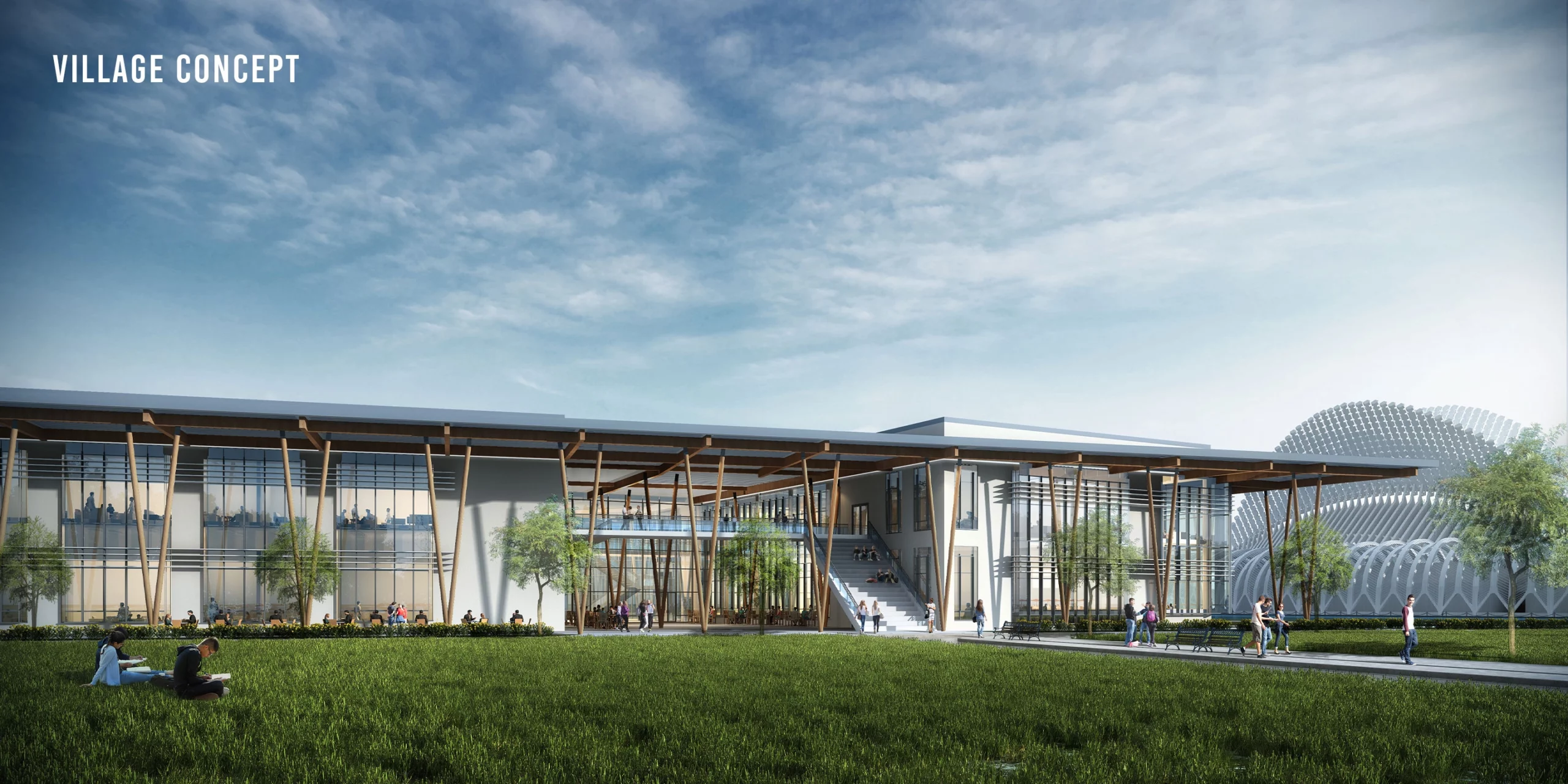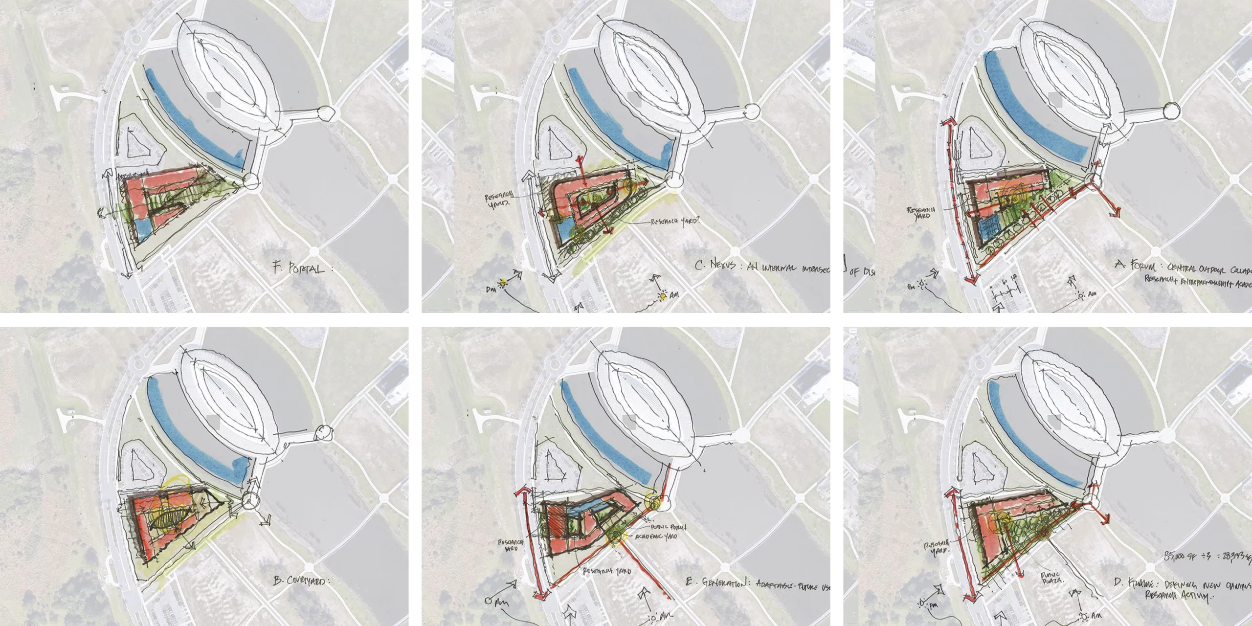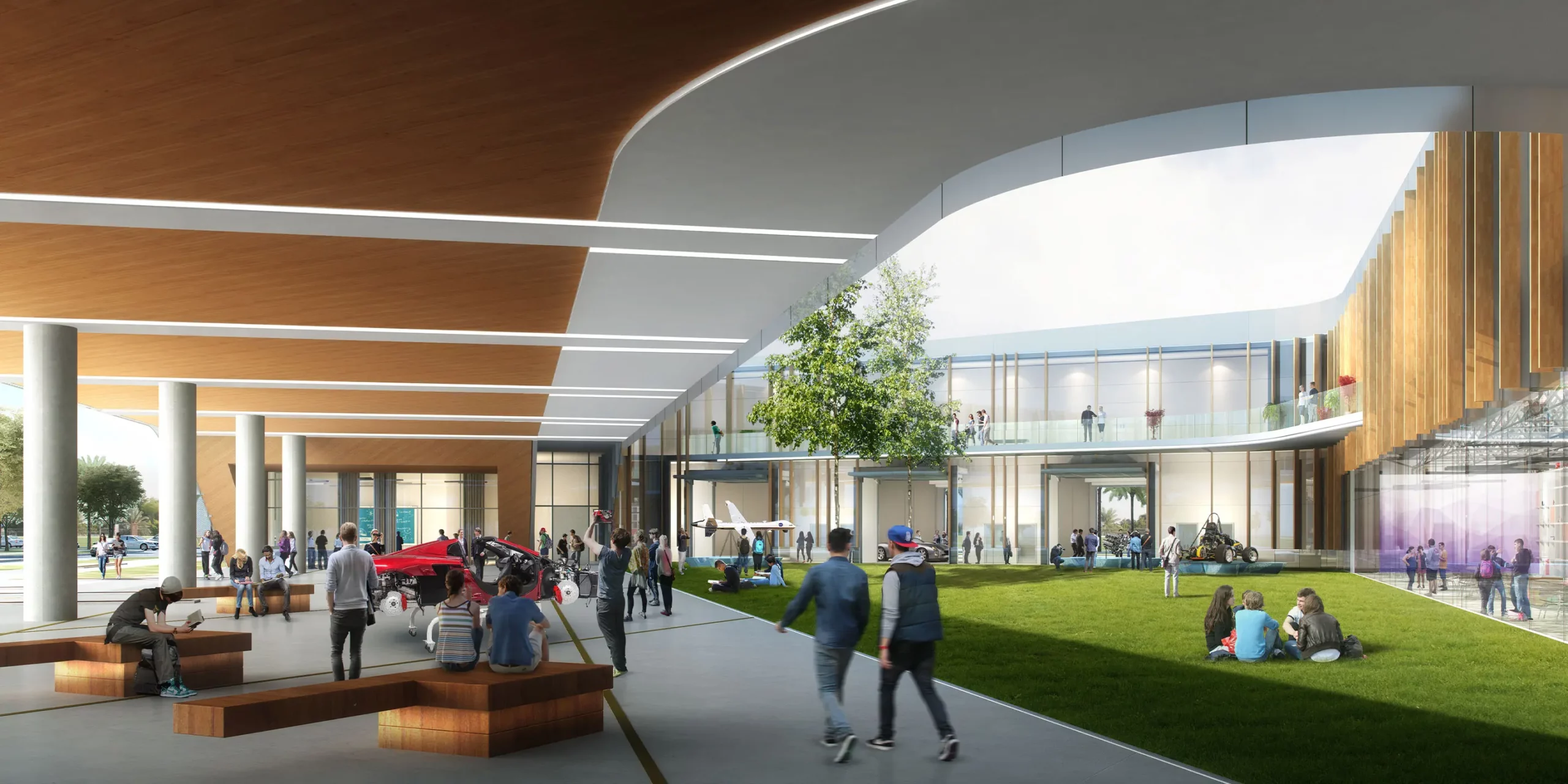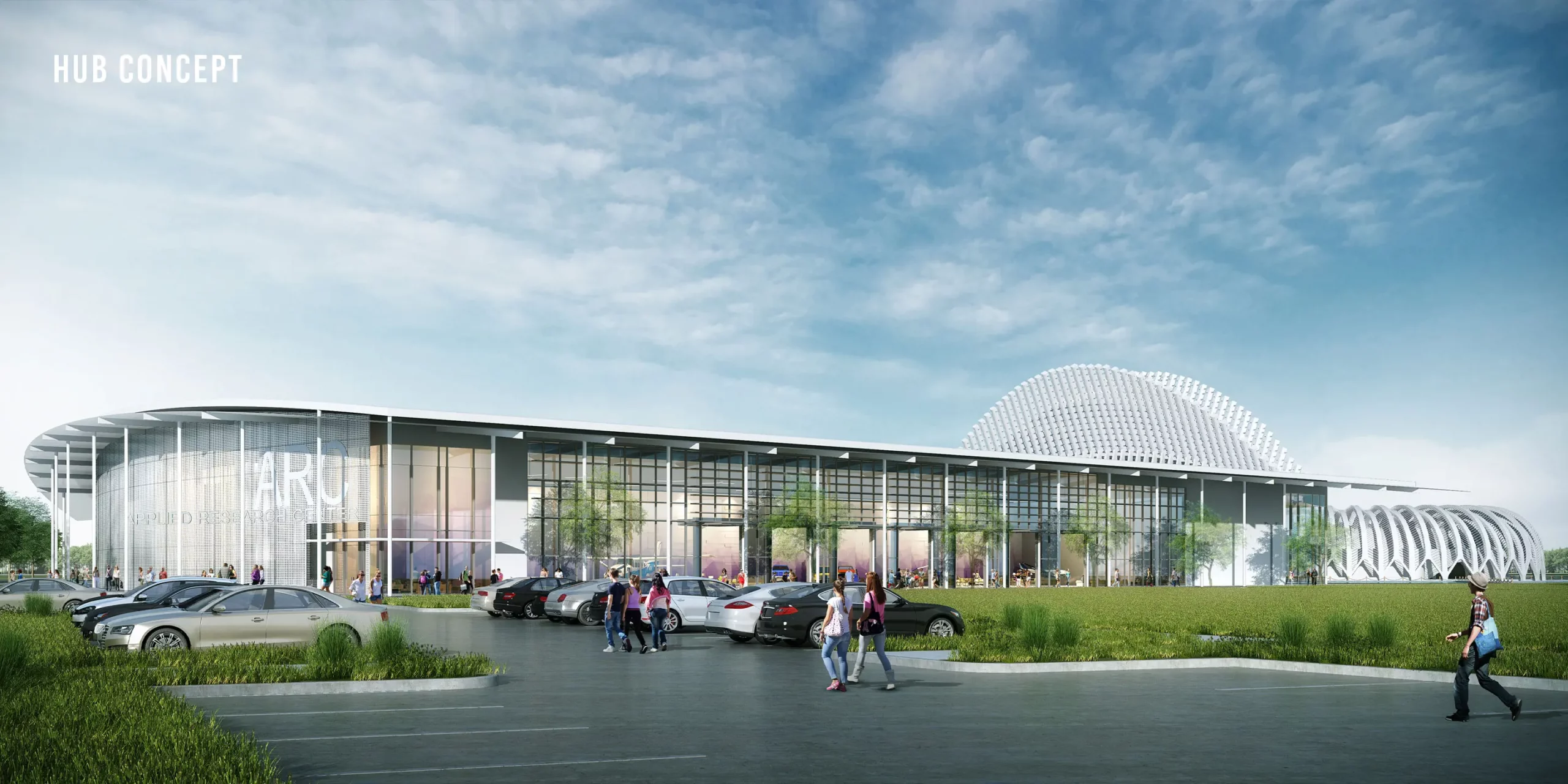 The Applied Engineering Research Center houses research and teaching laboratories, student design spaces, conference rooms, faculty offices, and multiple study areas. We created three concepts for this programming. The Village Concept highlights separate areas, allowing the lab spaces and traditional spaces to remain separate, yet joined together by a connective roof canopy. This exterior focus of the building provides a gateway experience for the campus. In contrast, the Forum Concept is interior focused, where science on display is curated in the interior courtyard. A gentle lift at the edge of the building encourages connection with the main campus. The Hub Concept is ultra efficient in design, with spaces and components grouped by type. Glass windows wrap the building, and large-scale graphics allow the building to be a billboard for the campus, viewable from the nearby main road.