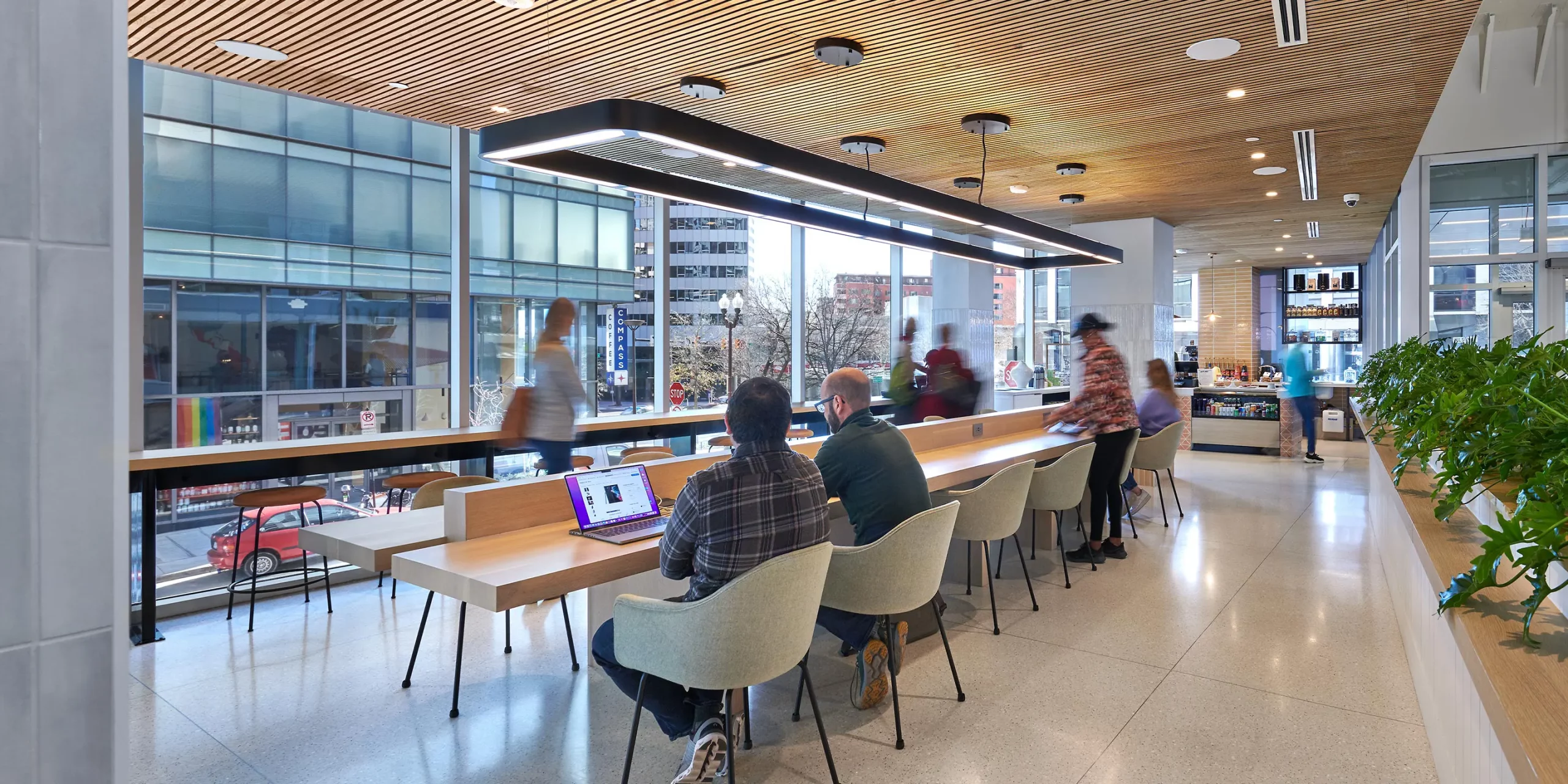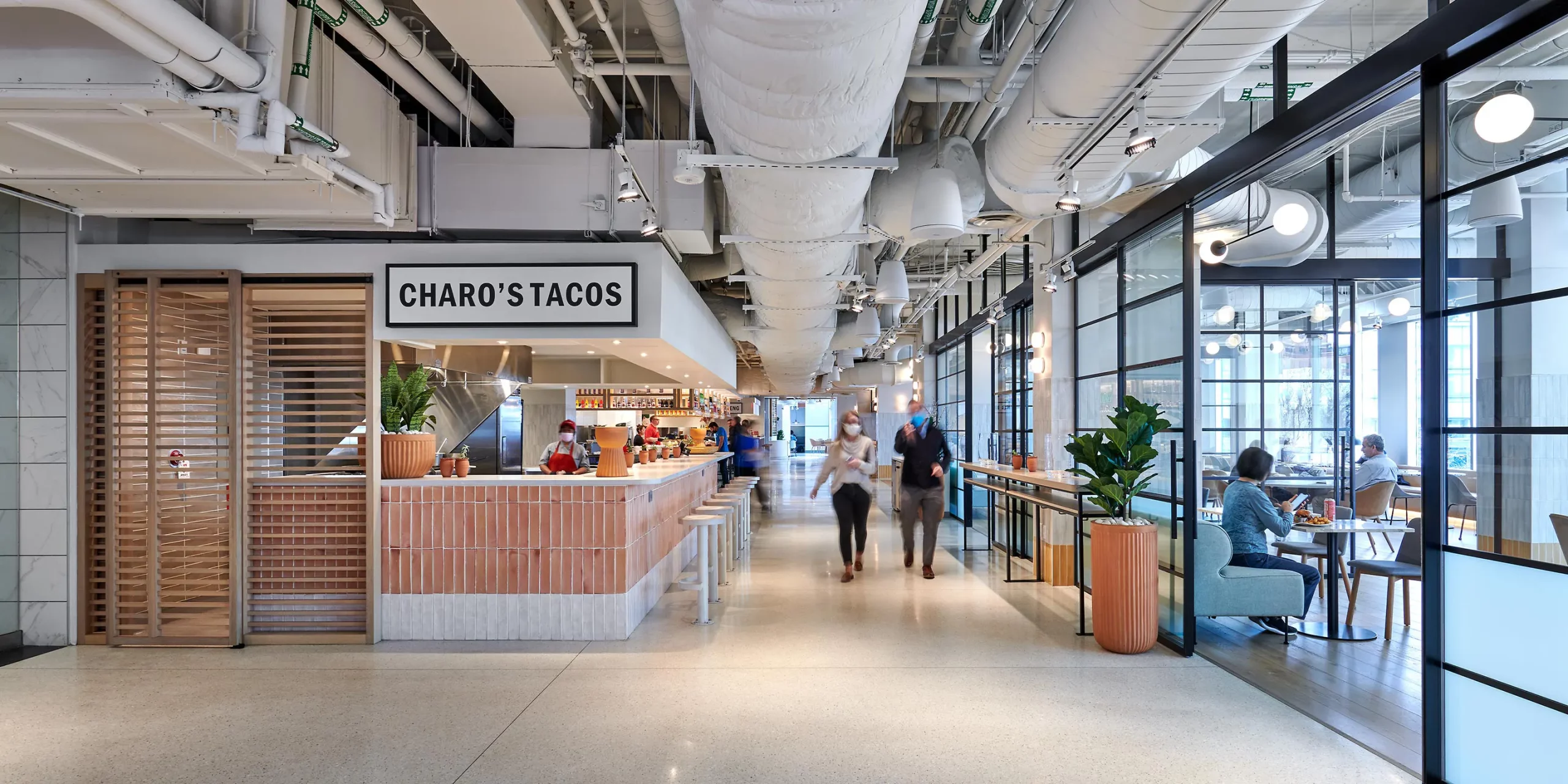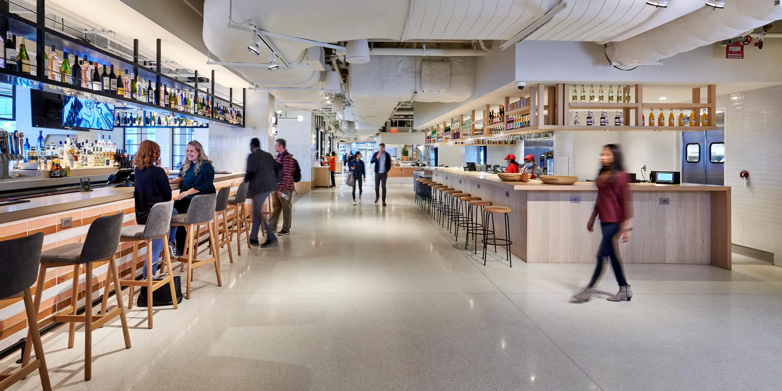 Cooper Carry used hospitality-focused design strategies, including warm lighting and clustered, comfortable seating nooks, to make the spaces feel like a lounge rather than a noisy food hall. The upscale offerings make the facility more like a culinary collective, with varied cuisines and atmospheres to encourage visitors to return throughout the day. You can grab a coffee in the morning and then return for cocktails in the evening.