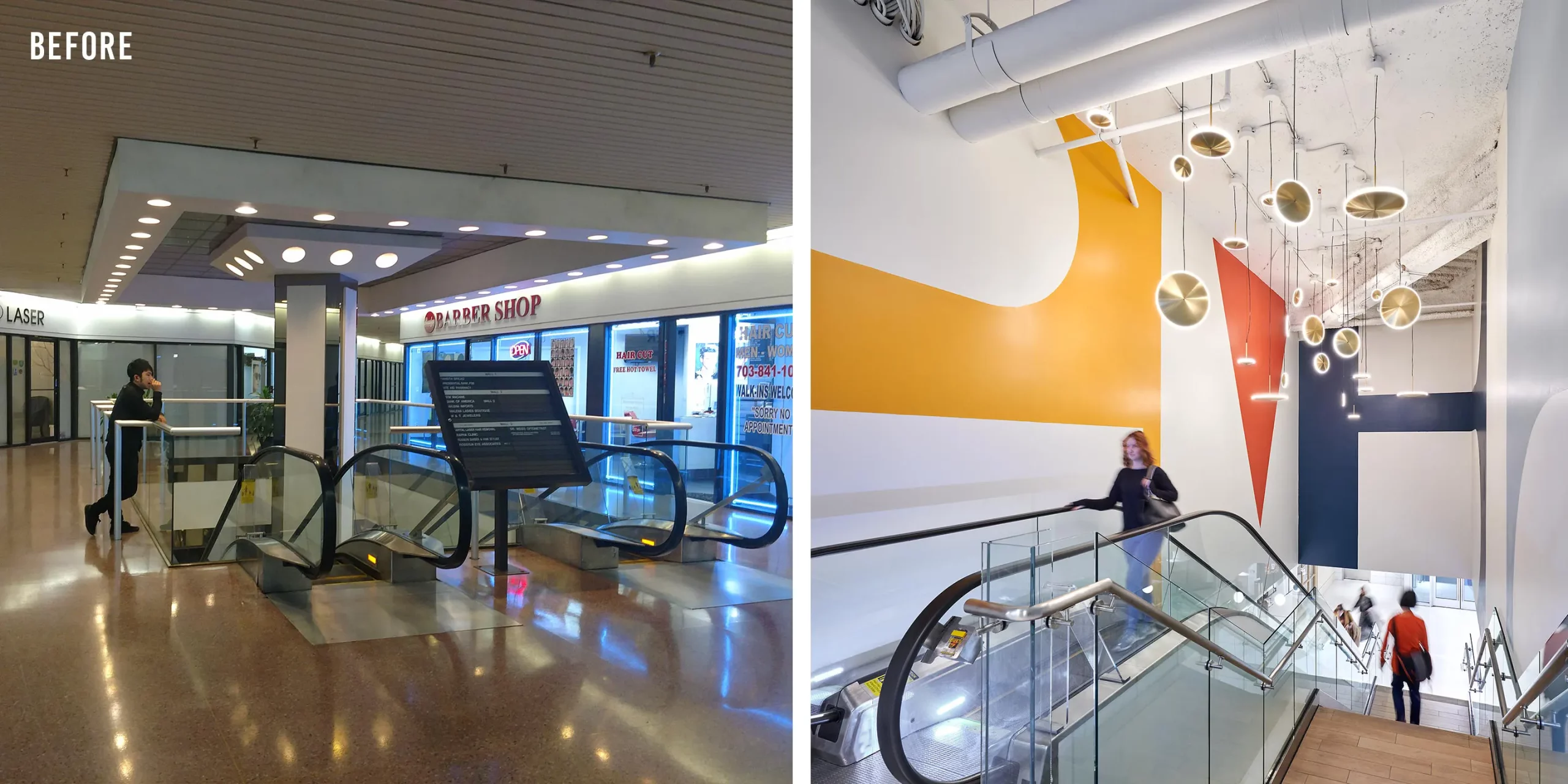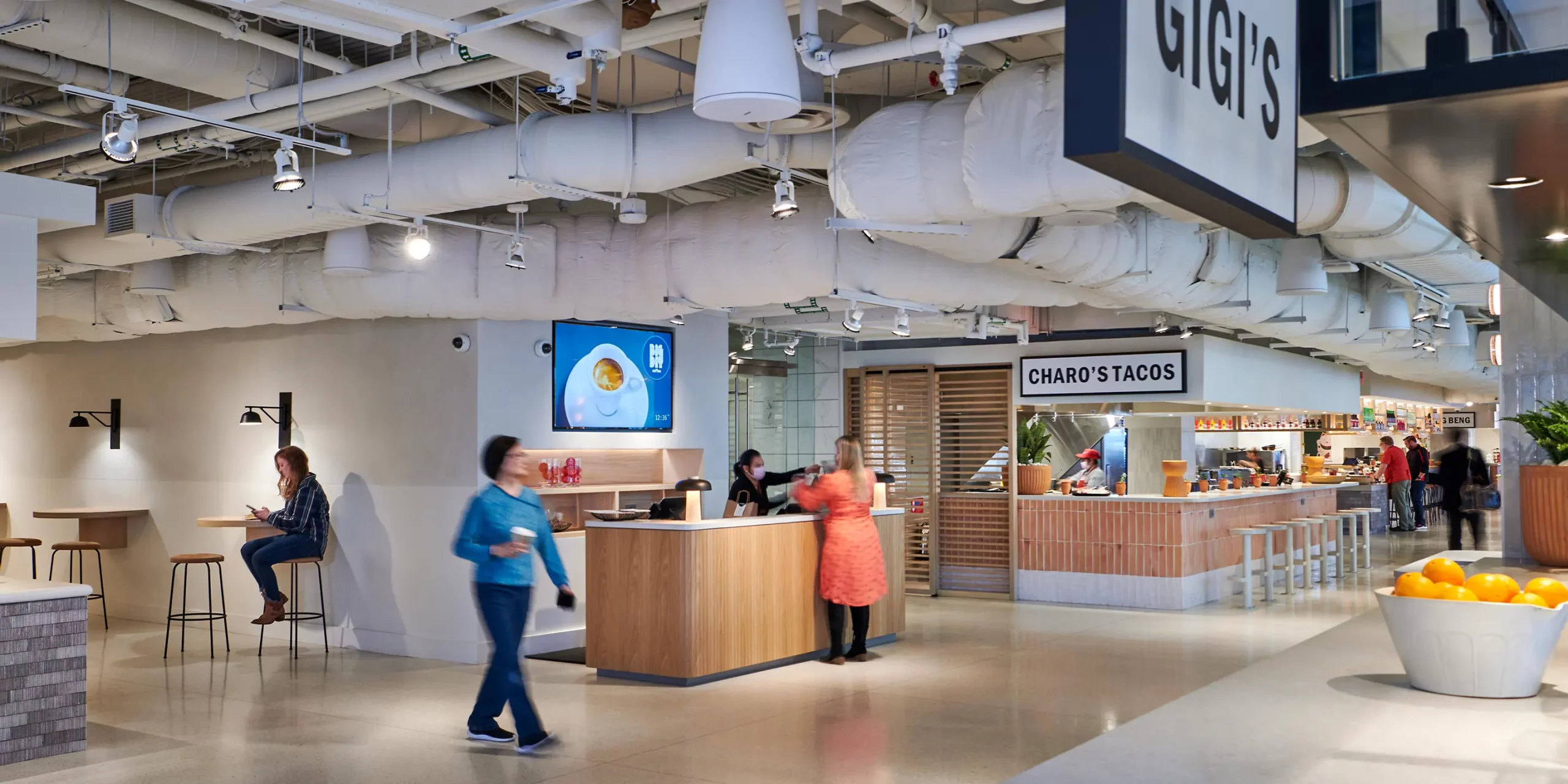 The Upside on Moore Food Hall is an innovative 29,000-square-foot urban food hall design featuring two levels of restaurants as well as high-end retail venues, like a wine market. The addition of the food and beverage options was part of the full renovation of Rosslyn City Center in the commuter-friendly DC suburb of Arlington, VA.
