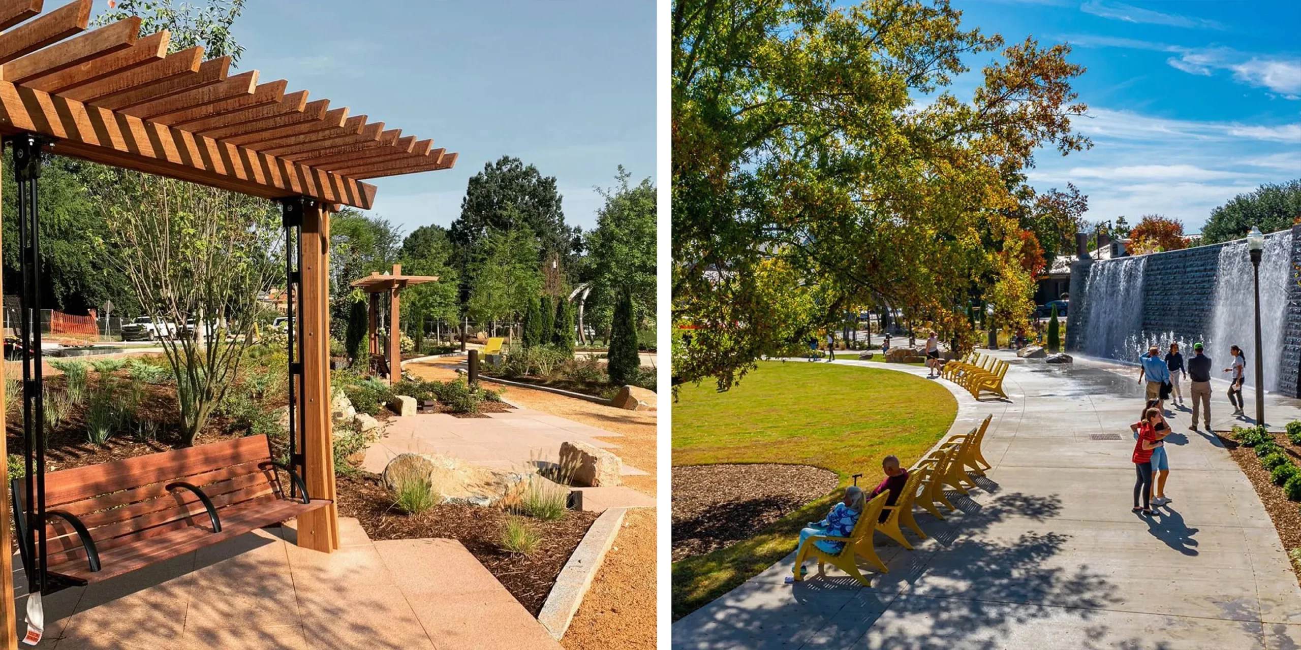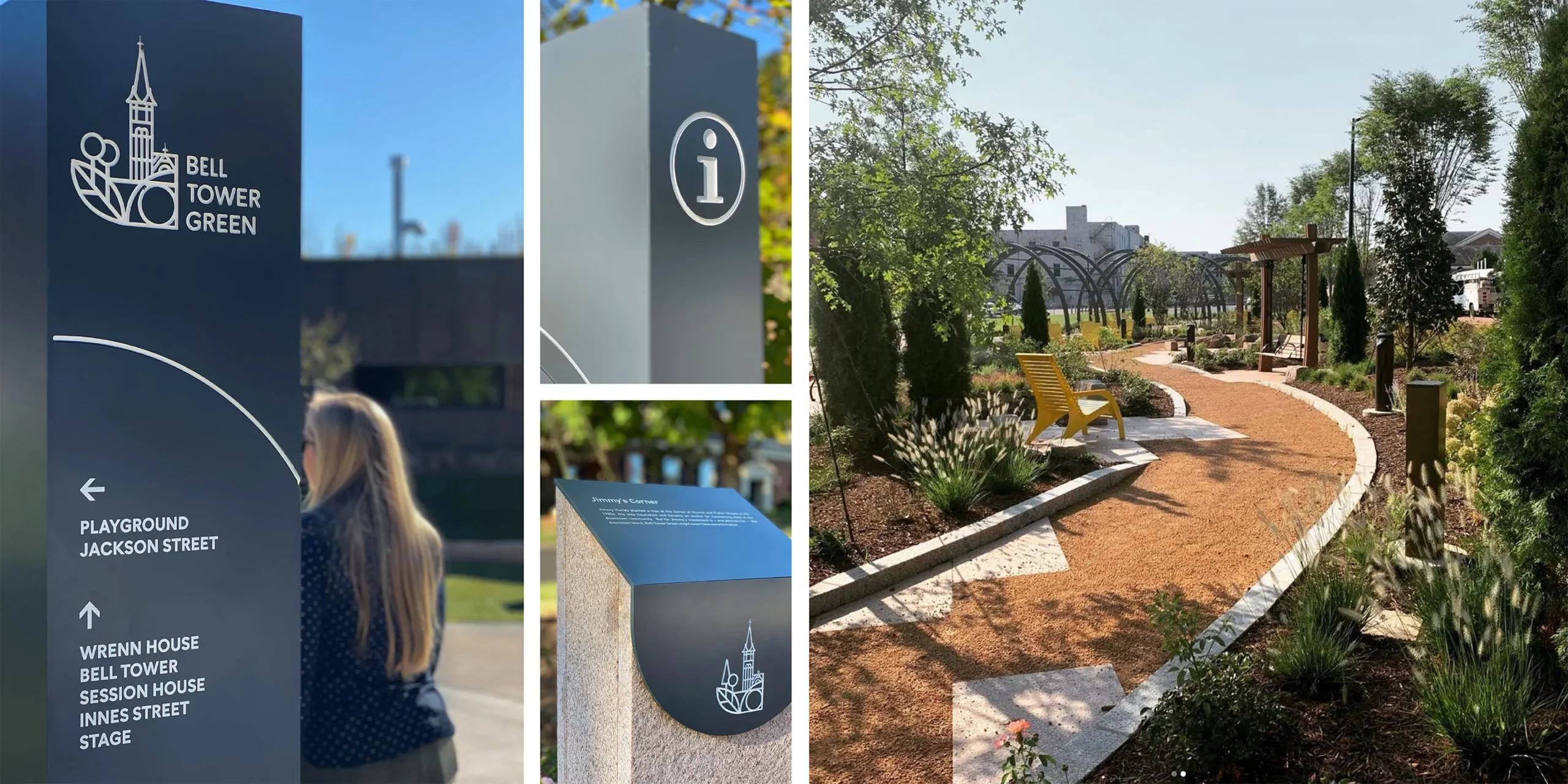 Bell Tower Green is a community gathering spot and outdoor Living Room for the City of Salisbury. This new city block is filled with green spaces, pathways, a performance stage, a modern water wall feature, children’s play areas, and public restrooms. Cooper Carry collaborated with LandDesign in providing a logo identity, signage, an interpretive information system, and wayfinding design. The signage system is clean, informative, and reflective of the circular motif found within the overall site plan and logo design. Locally sourced and quarried “Salisbury Pink Granite” was utilized for several sign items throughout.