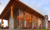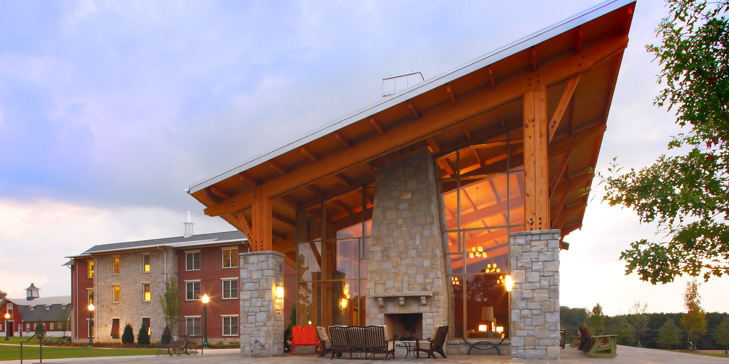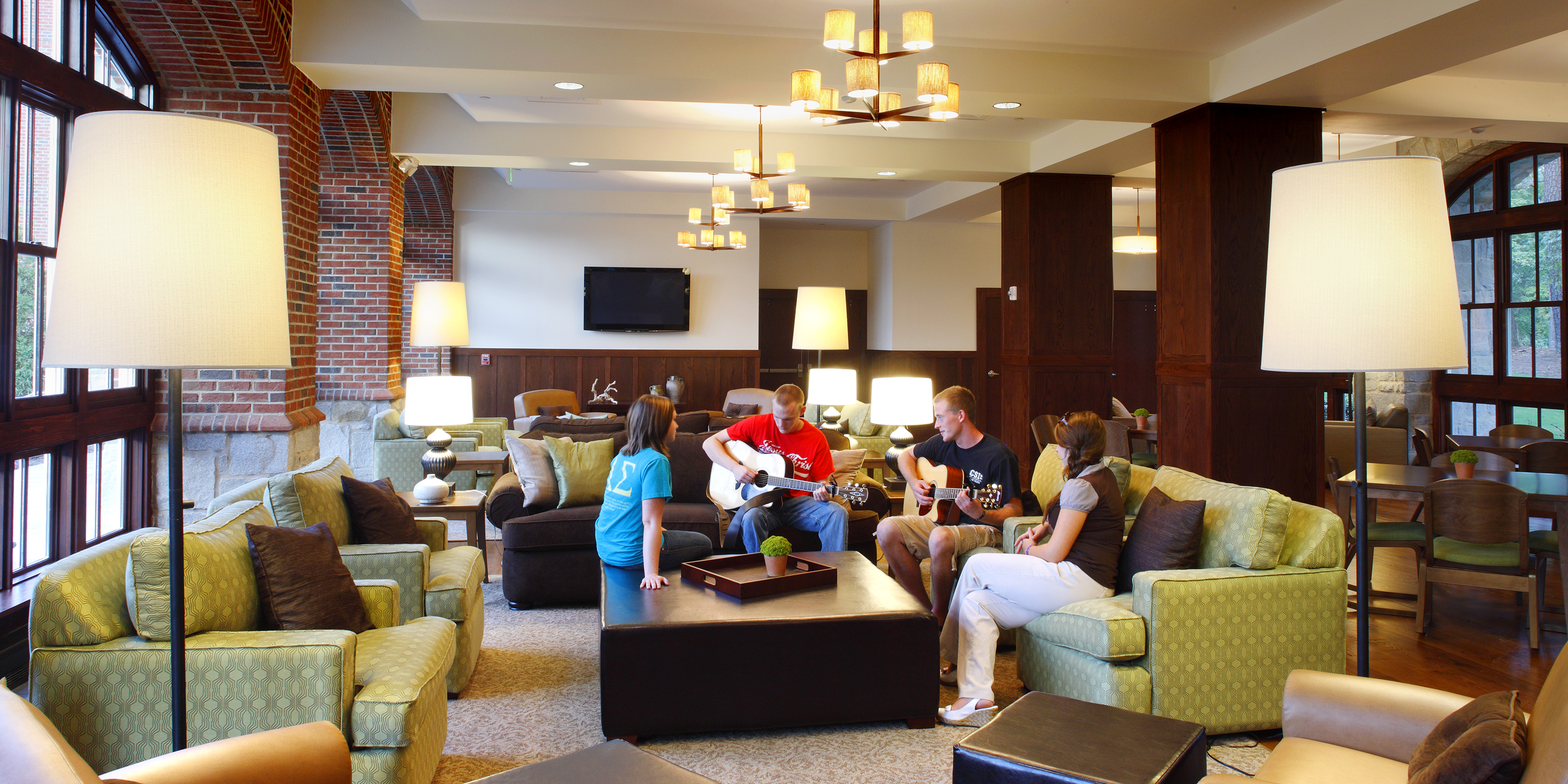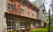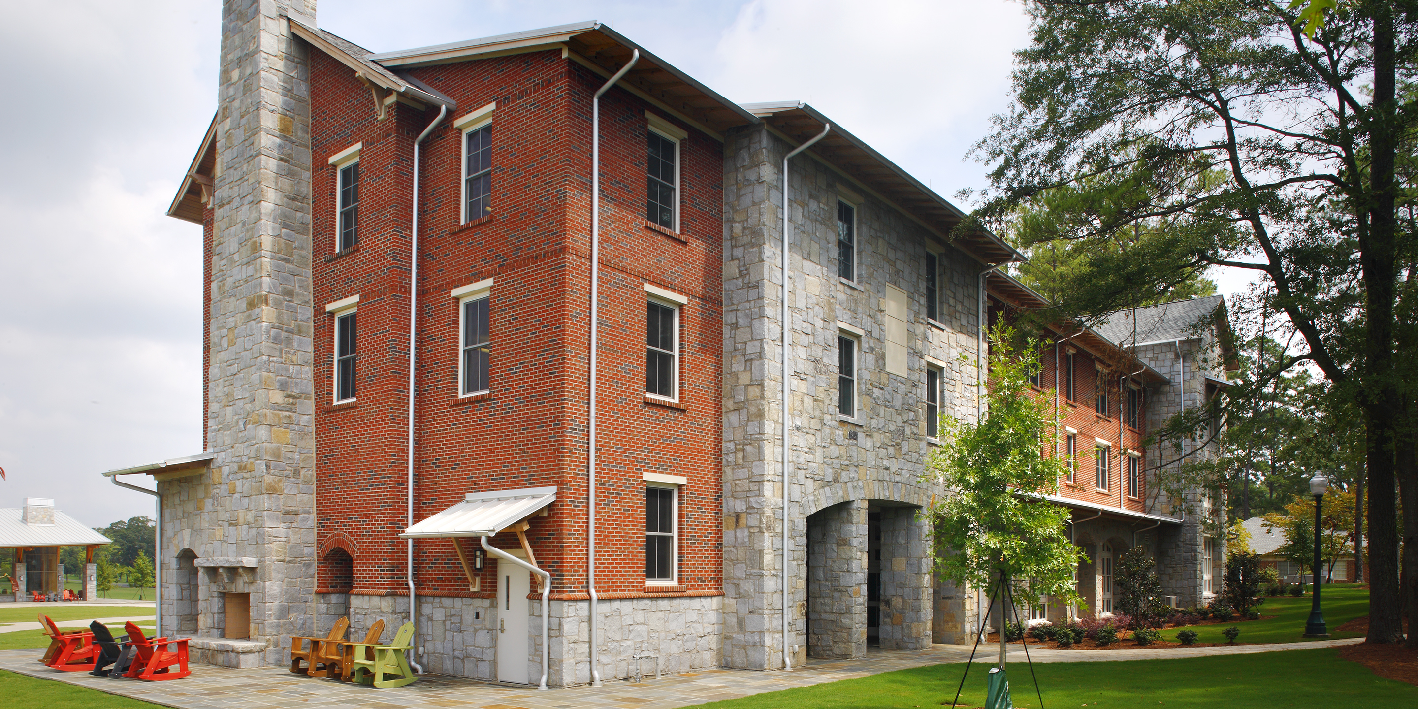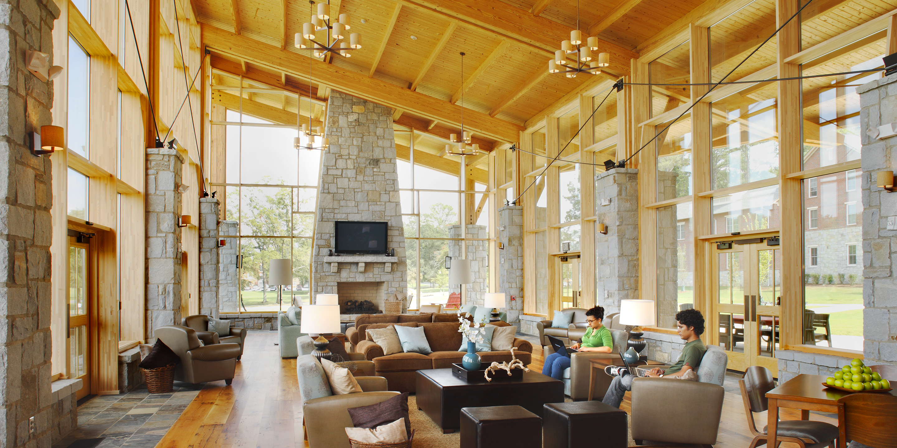 The LEED-NC Gold Audrey B. Morgan and Deerfield Halls are nestled between the campus core and the bordering forest. The buildings succeed in defining and creating a residential place for students to call home, amidst a 26,000-acre campus. With each approximately 50,000 square feet in size, the buildings include a total of 350 beds in a traditional college living style to encourage interaction among residents. Students share bathroom facilities with about 25 other residents within their wings. Public spaces—such as lounges, kitchens and laundry areas—have been designed with high quality finishes and hand-selected furniture. A central gathering place, known as the “jewel box,” is attached to Audrey B. Morgan Hall. Deerfield Hall is complemented by a large common area adjacent to a covered portal defining the central green. Several smaller lounges and social areas are distributed throughout each of the buildings. Berry’s incomparable campus provided an ideal setting for the creation of outdoor spaces that promote interaction. Indoor and outdoor fireplaces have become popular gathering spaces. The residence halls have achieved LEED-NC Gold certification and has been awarded the 2010 American School & University Educational Interiors Showcase, Silver Citation.