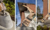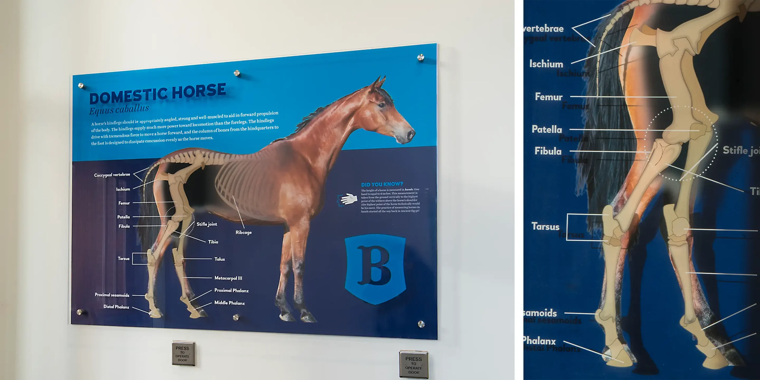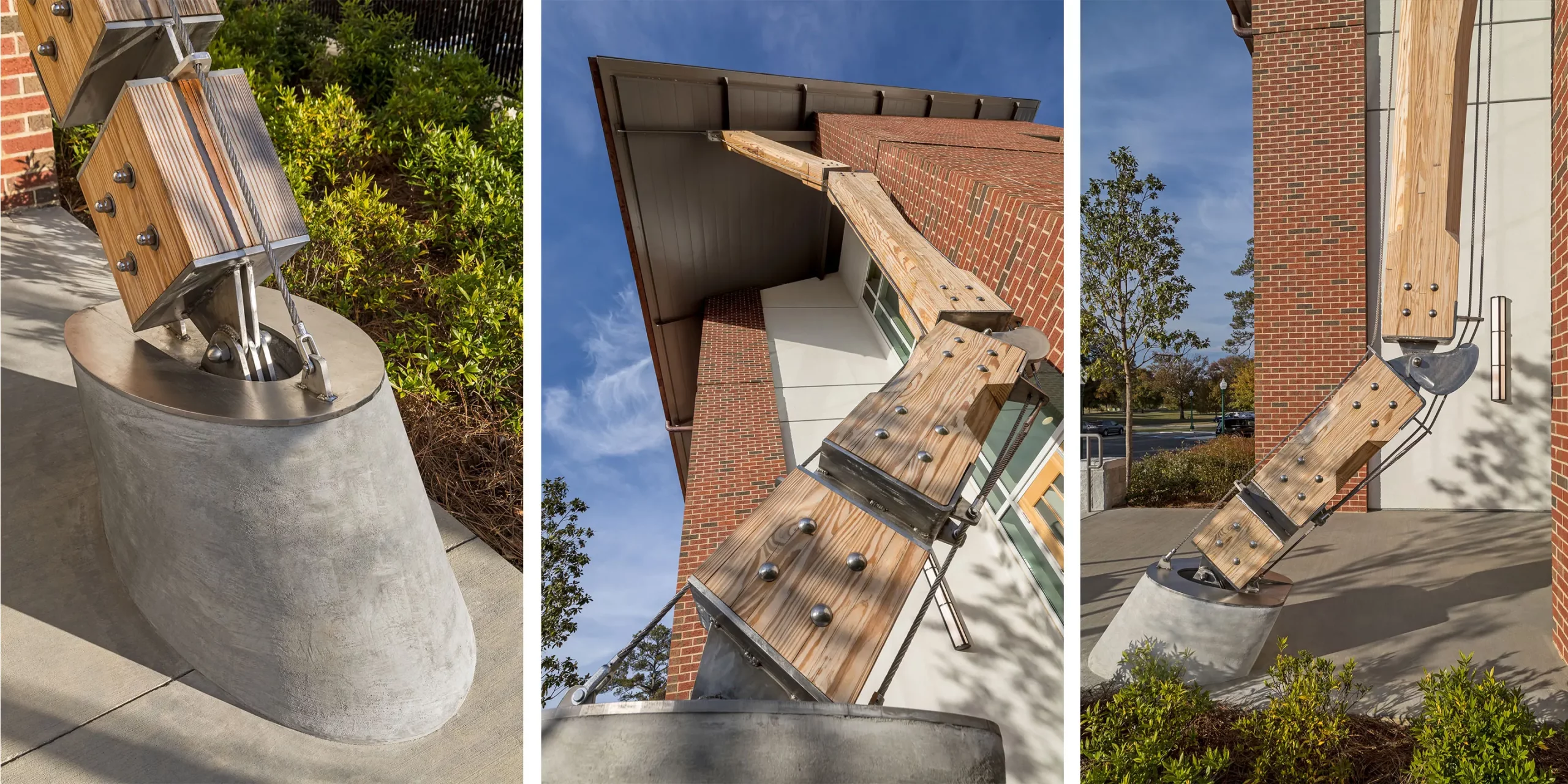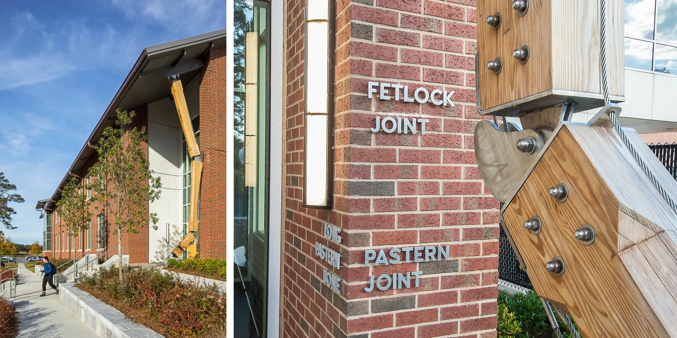 The architecture remains consistent with the pre-existing building, while also showcasing unique exterior details to convey the focus of the program housed within. This includes a two-story “horse leg” column constructed of laminated timber, stainless steel plate, and cable to accurately exhibit the skeletal and musculature components of a horse limb as a teaching moment. Detailing of porches and canopies similarly reference other skeletal anatomy through the taper and spacing of exposed structural steel components.