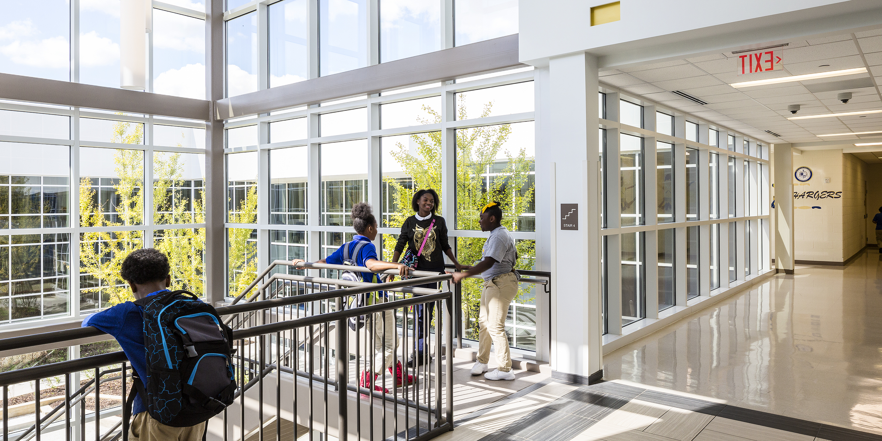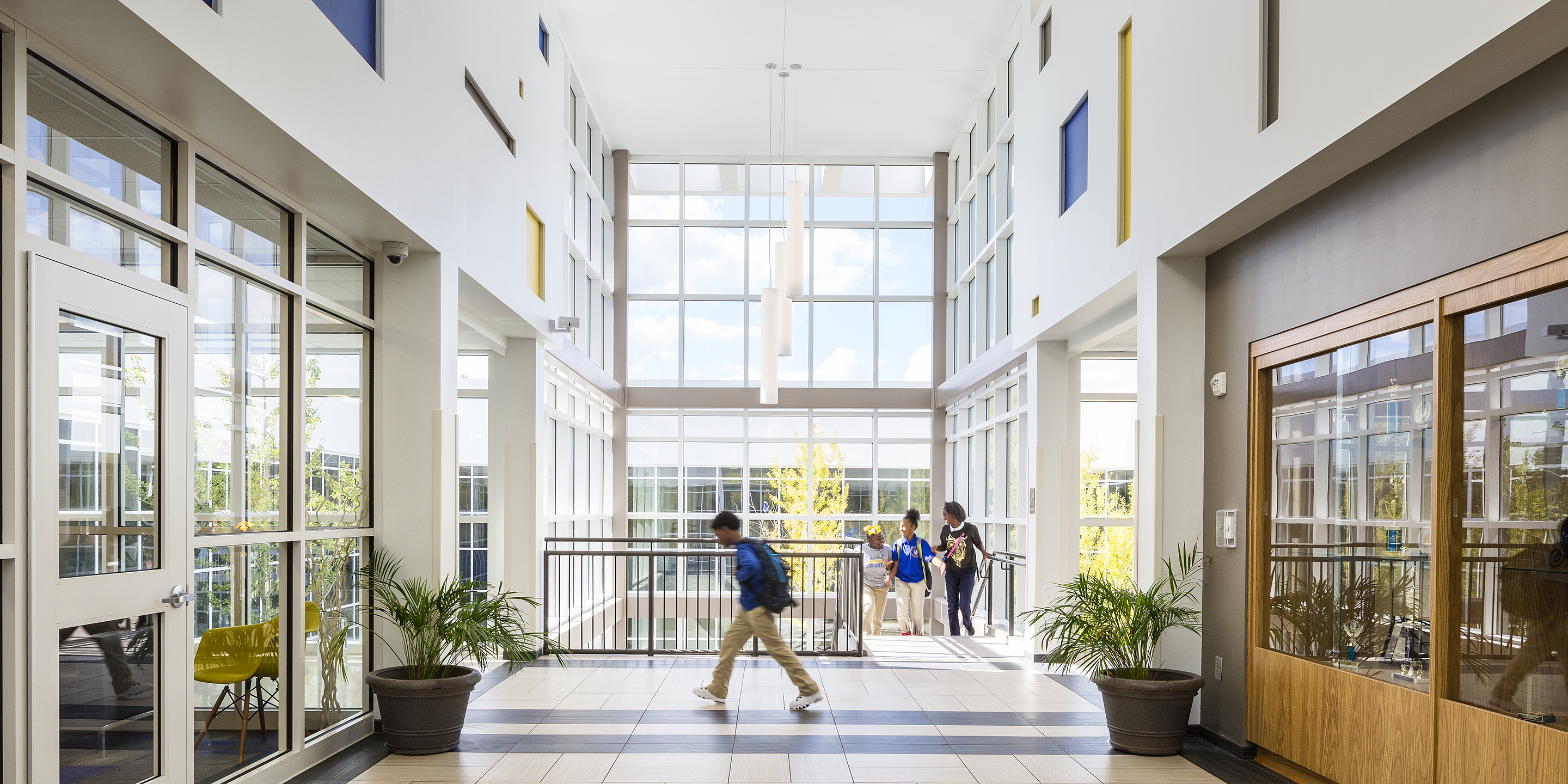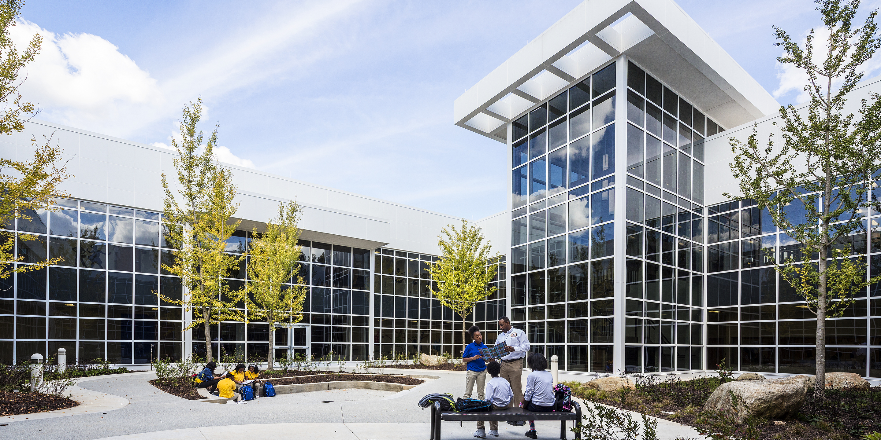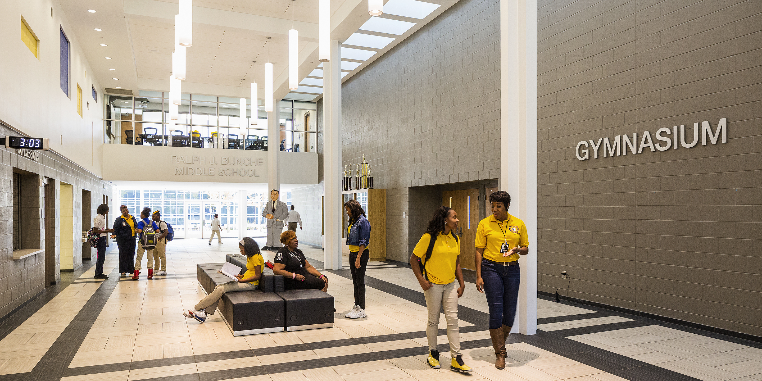 The original 100,000 SF Bunche Middle School was built in 1977 with tight triangular classrooms, confusing corridors and minimal natural light. Cooper Carry completely redesigned the school to provide updated, inviting learning spaces, simplified way finding and infused ample natural light in a manner that enables teachers the flexibility to employ today’s 21st Century pedagogy. As the program called to increase the FTE to 975 students, the 63,652 SF addition provides proper sized core spaces such as a state-of-the-art auditorium with engineered acoustics and a generous gymnasium filled with natural light. Much needed support spaces for the gymnasium such as locker rooms, weights, and dance were added. For the auditorium, we provided an acoustically designed music suite. The Media Center, previously located in the basement, was relocated to the heart of the school and provided with abundant windows that view out to two dynamic courtyards. These courtyards, through their unique design, not only infuse natural light into the building, but provide students with attractive focal points that have become well used outdoor learning spaces. The new cafeteria features an architecturally dramatic exposed concrete waffle-slab ceiling and food court style serving lines. Our interior designers introduced vibrant color and bold design features that provide interest and purpose. Spaces such as lobbies, the media center, and other core spaces were provided with various ceiling heights and volume to give a sense of rhythm to students. Consequently, a bright and inviting entrance with a new administration suite enabled the design team to provide much needed security. The building was redesigned in concert with the site to separate bus and auto traffic. The new site design included hundreds of new trees and shrubs that create an arboretum style learning experience for the students, emphasizing the change of seasons. New softball and football fields were included with a 400 meter track.