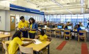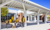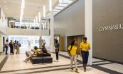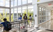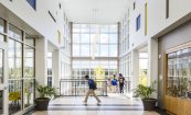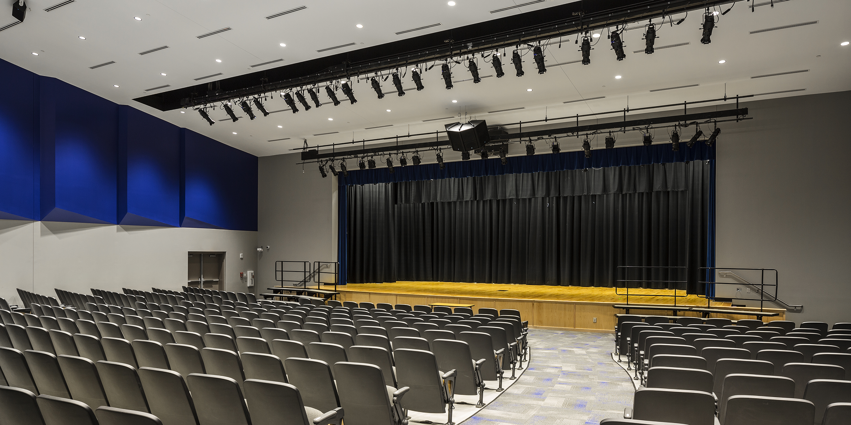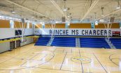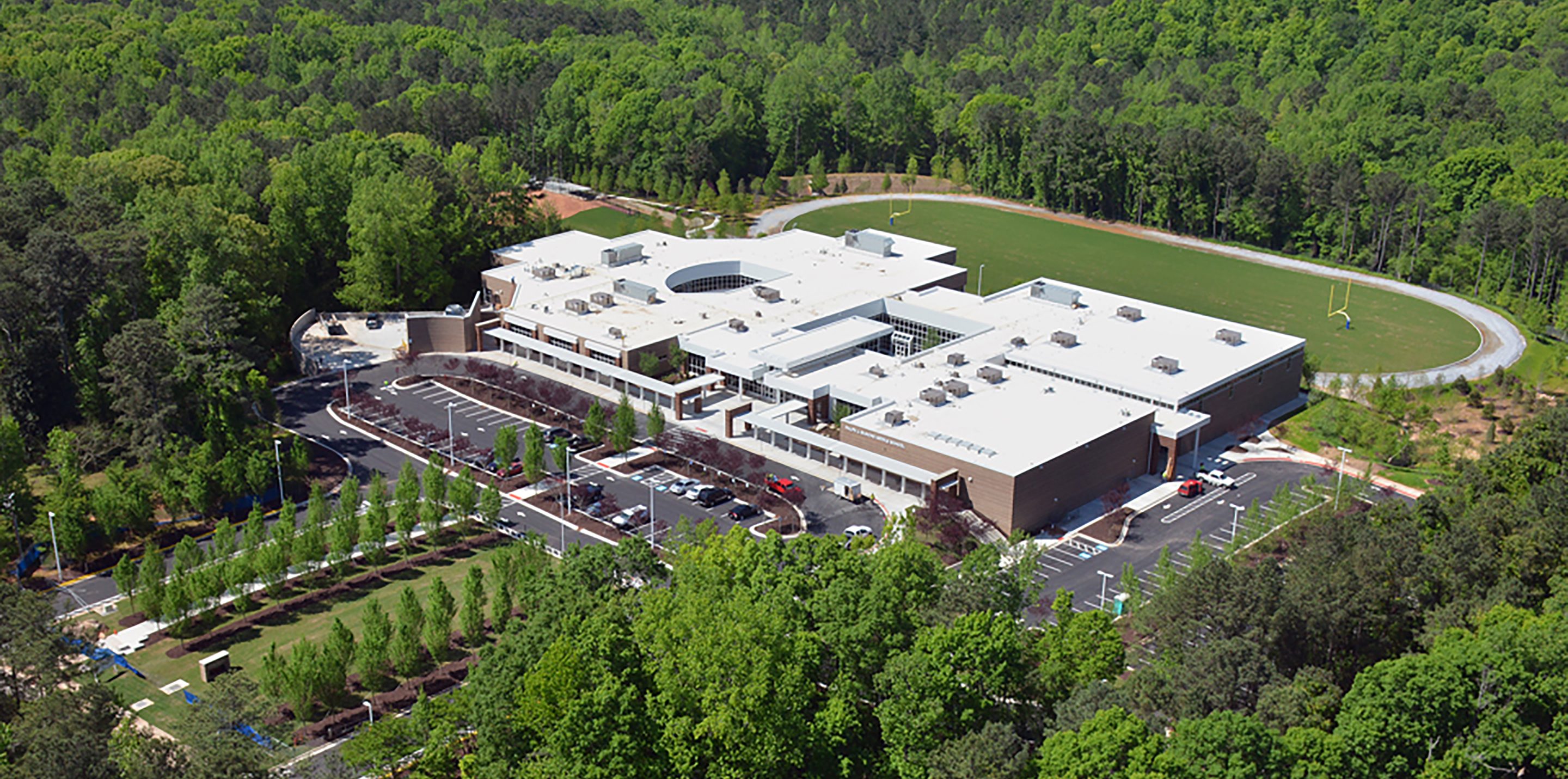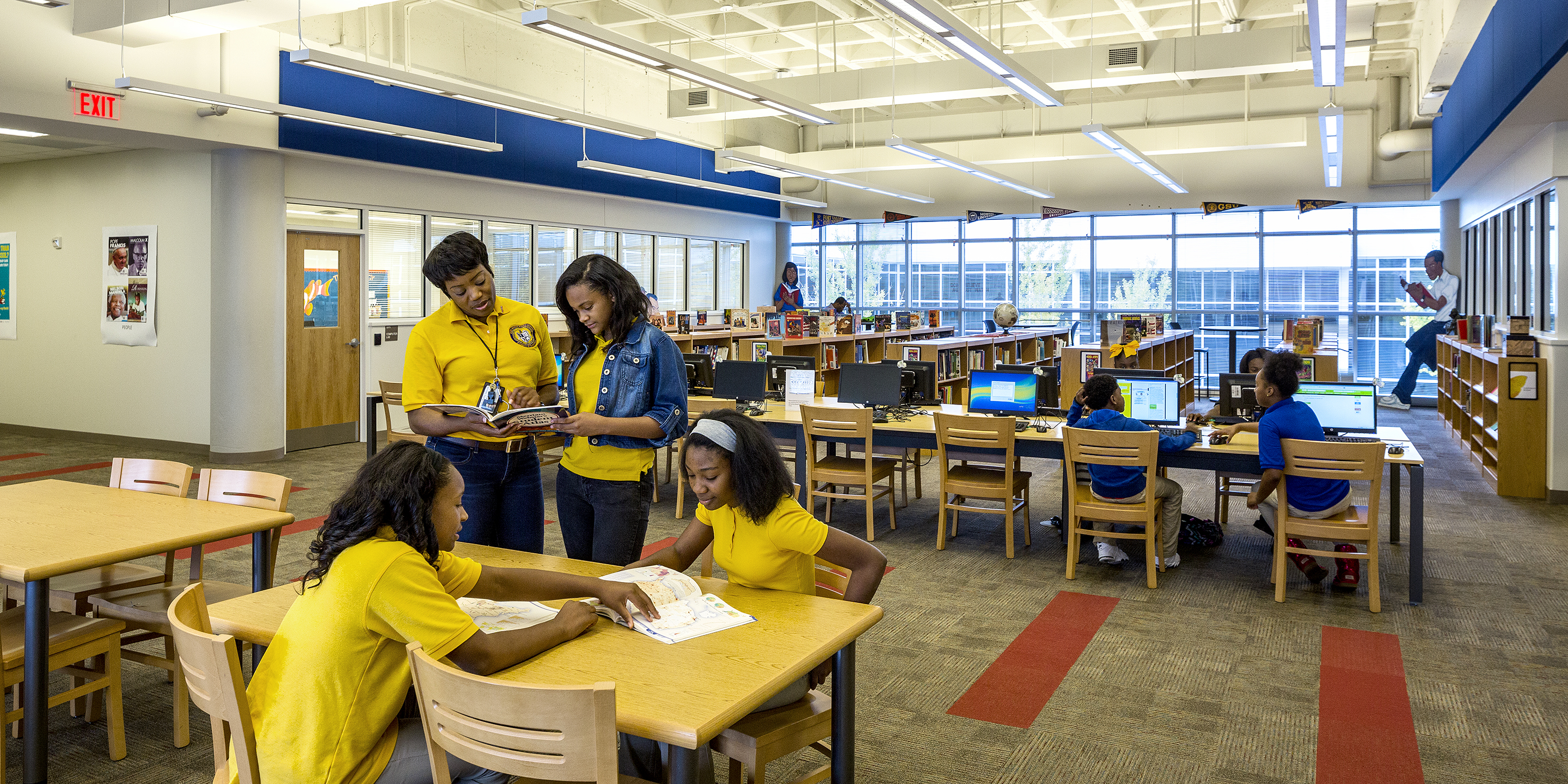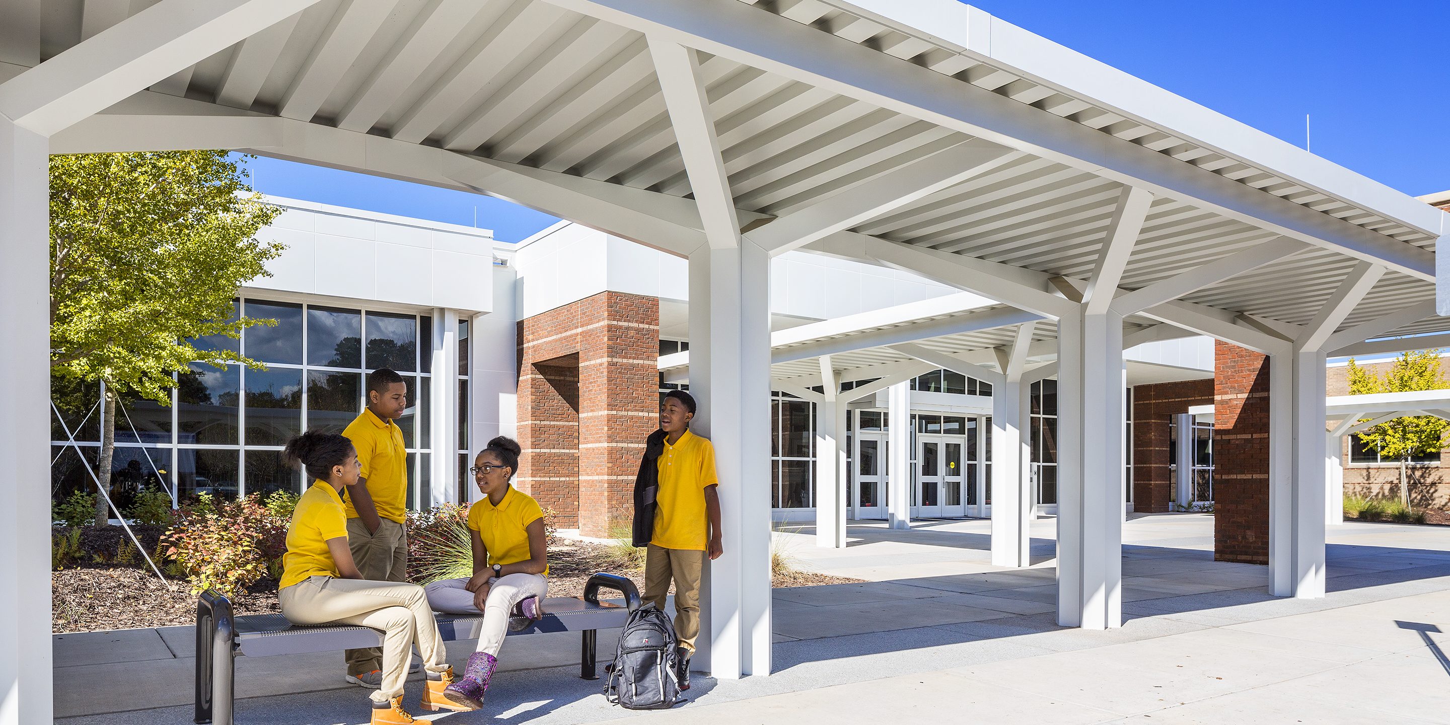 The original 100,000 SF Bunche Middle School was built in 1977 with tight triangular classrooms, confusing corridors and minimal natural light. Cooper Carry completely redesigned the school to provide updated, inviting learning spaces, simplified way finding and infused ample natural light in a manner that enables teachers the flexibility to employ today’s 21st Century pedagogy. As the program called to increase the FTE to 975 students, the 63,652 SF addition provides proper sized core spaces such as a state-of-the-art auditorium with engineered acoustics and a generous gymnasium filled with natural light. Much needed support spaces for the gymnasium such as locker rooms, weights, and dance were added. For the auditorium, we provided an acoustically designed music suite. The Media Center, previously located in the basement, was relocated to the heart of the school and provided with abundant windows that view out to two dynamic courtyards. These courtyards, through their unique design, not only infuse natural light into the building, but provide students with attractive focal points that have become well used outdoor learning spaces. The new cafeteria features an architecturally dramatic exposed concrete waffle-slab ceiling and food court style serving lines. Our interior designers introduced vibrant color and bold design features that provide interest and purpose. Spaces such as lobbies, the media center, and other core spaces were provided with various ceiling heights and volume to give a sense of rhythm to students. Consequently, a bright and inviting entrance with a new administration suite enabled the design team to provide much needed security. The building was redesigned in concert with the site to separate bus and auto traffic. The new site design included hundreds of new trees and shrubs that create an arboretum style learning experience for the students, emphasizing the change of seasons. New softball and football fields were included with a 400 meter track.