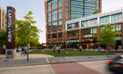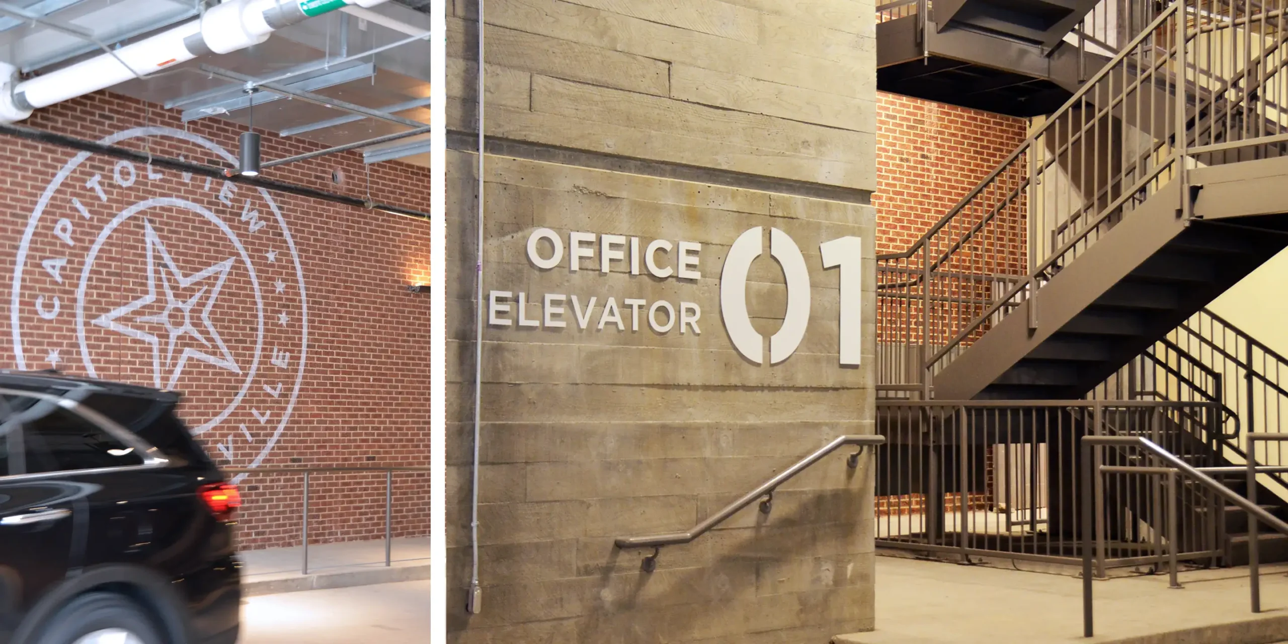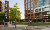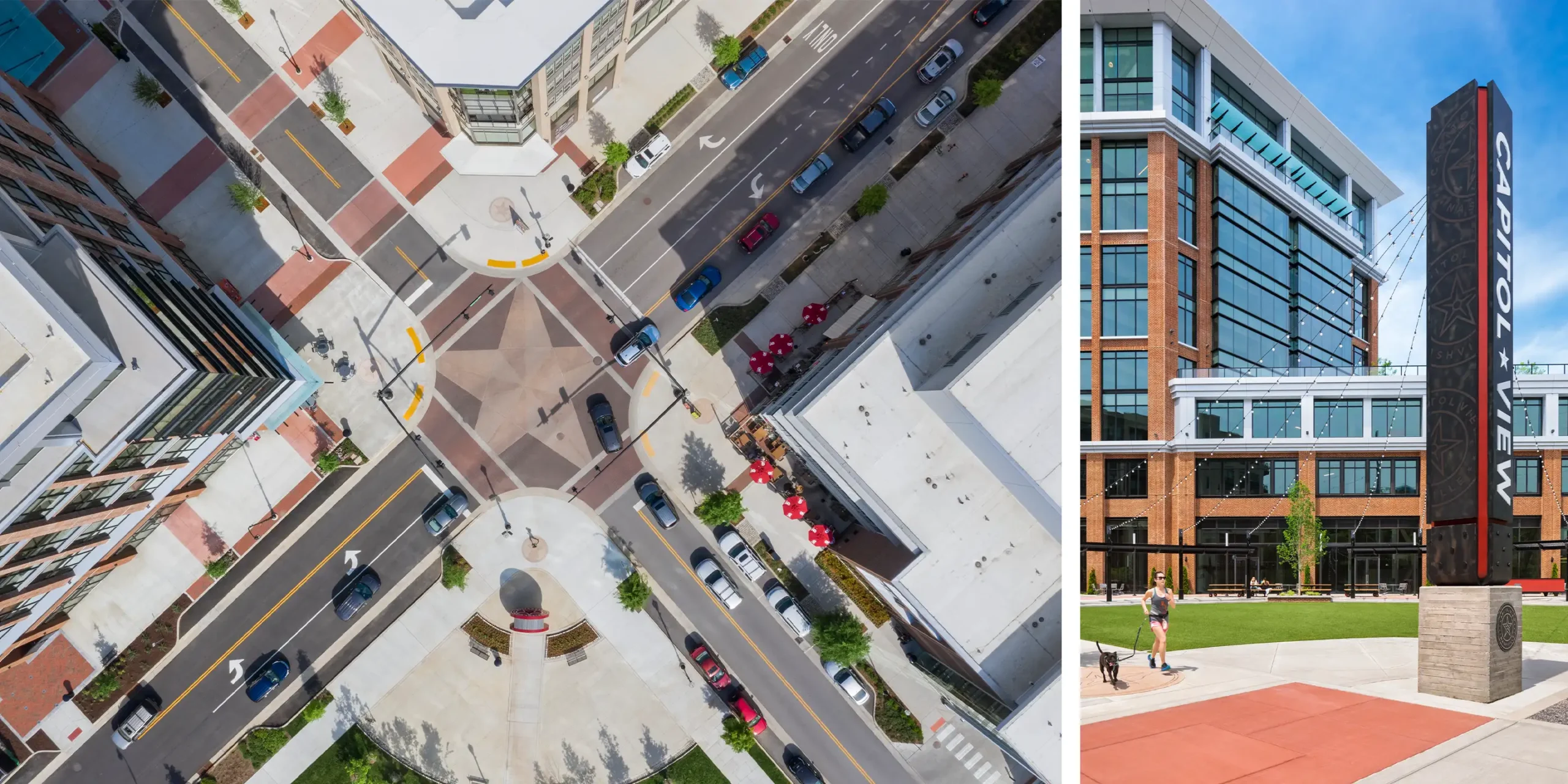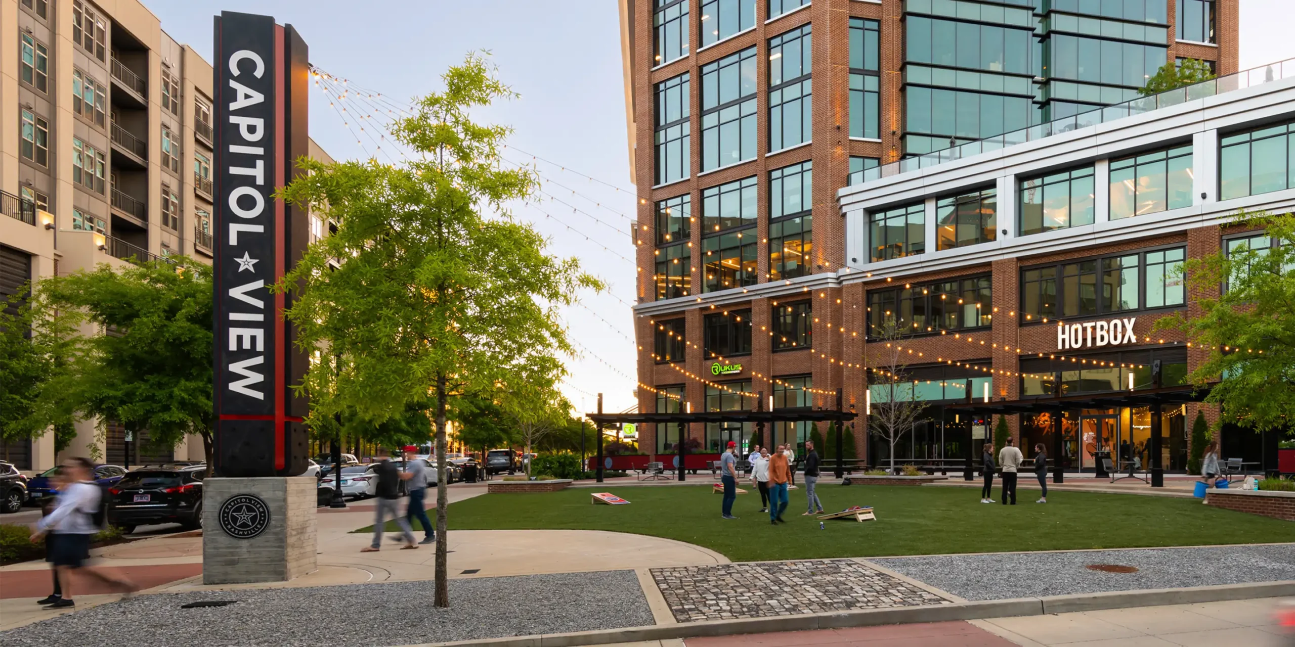 Cooper Carry also developed design guidelines for the entire development, provided full architecture and interior design services for two blocks of the development, and provided site-wide wayfinding and signage design services. The architectural design of the buildings acknowledges the site's history. The Bruton Snuff and Marathon Motor Works buildings, located to the north of Capitol View, are brick-clad mill structures of historical importance. To honor these historic buildings, we used brick and metal to clad the new structures and placemaking elements such as embedded train rails in the triangular park.