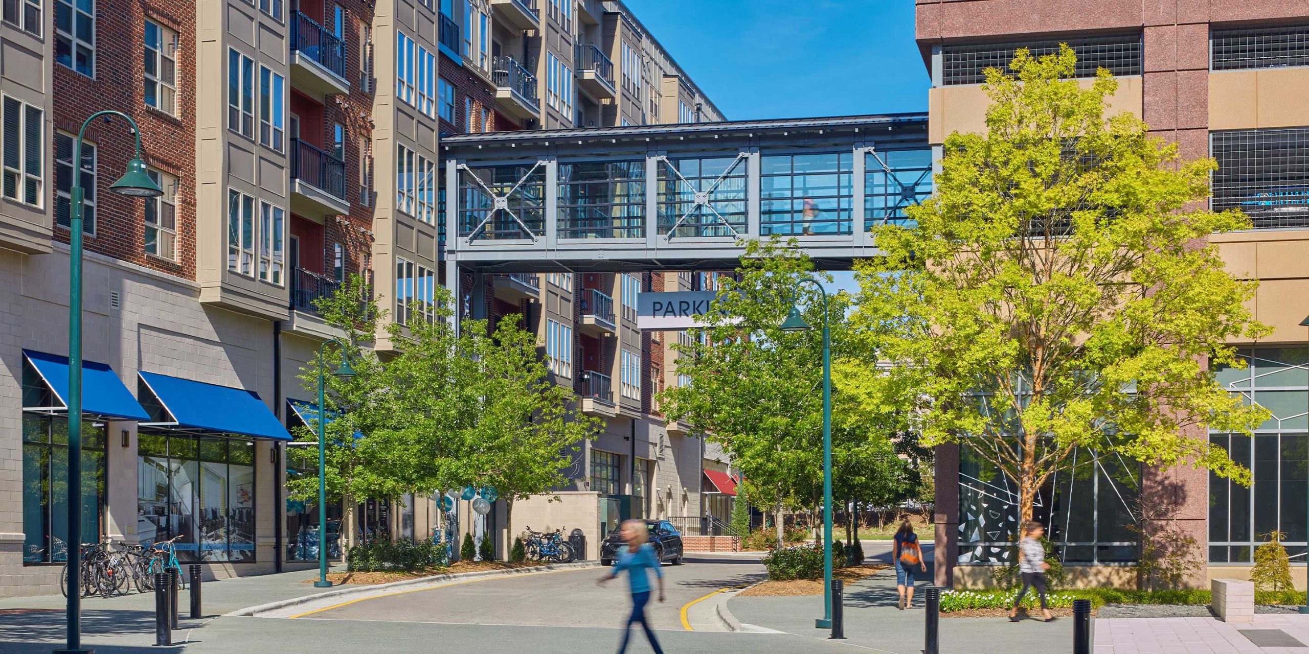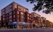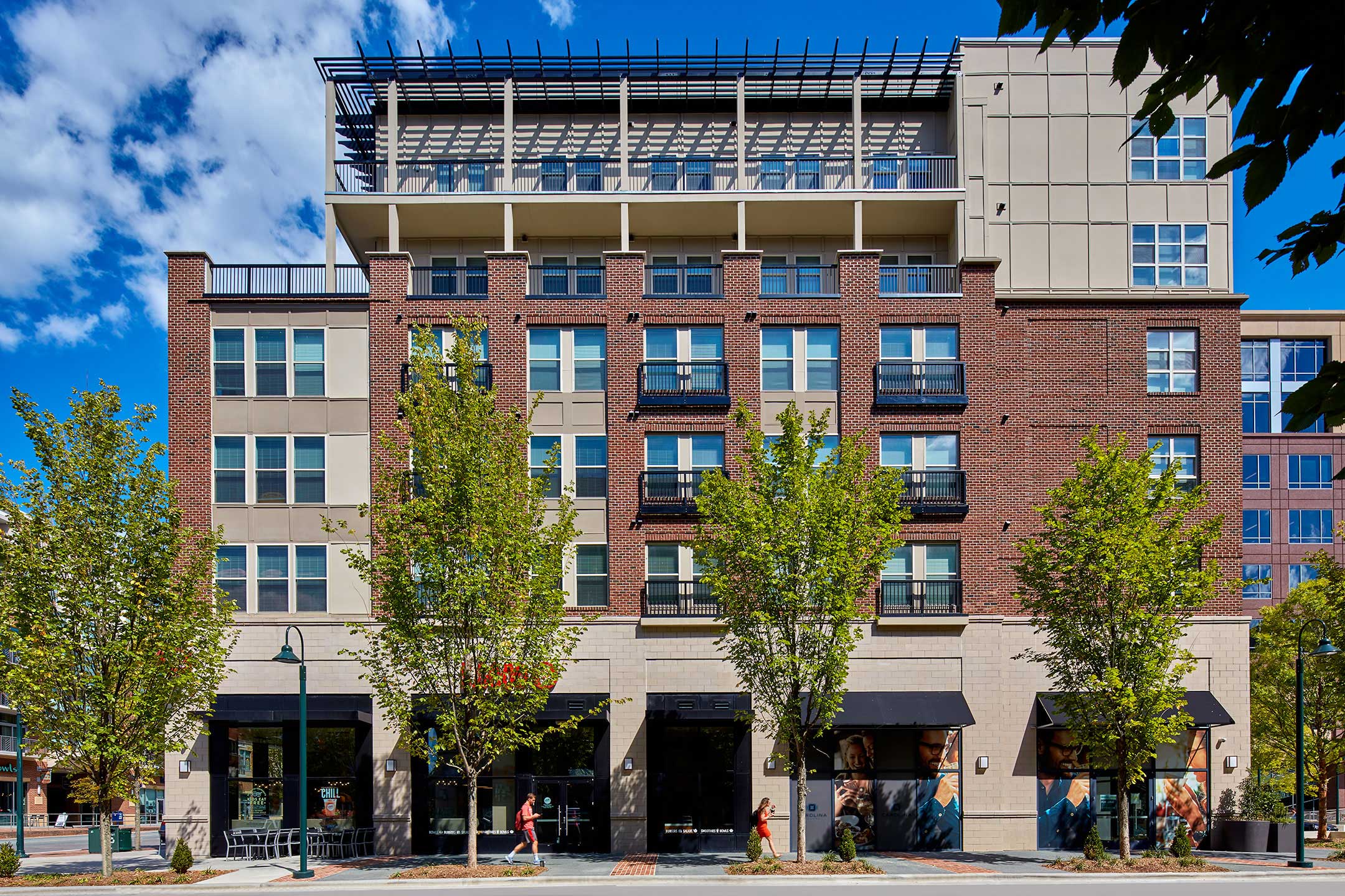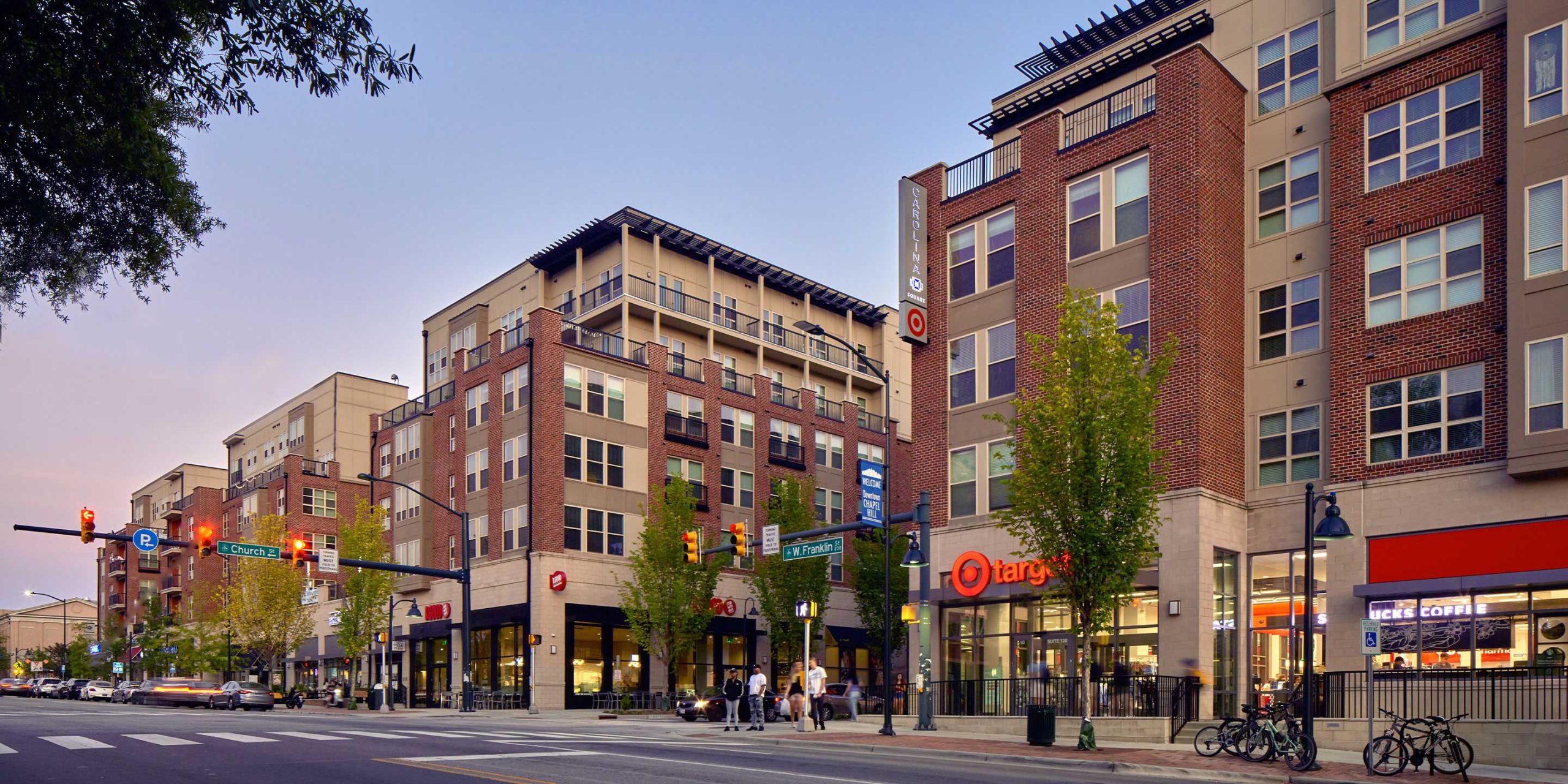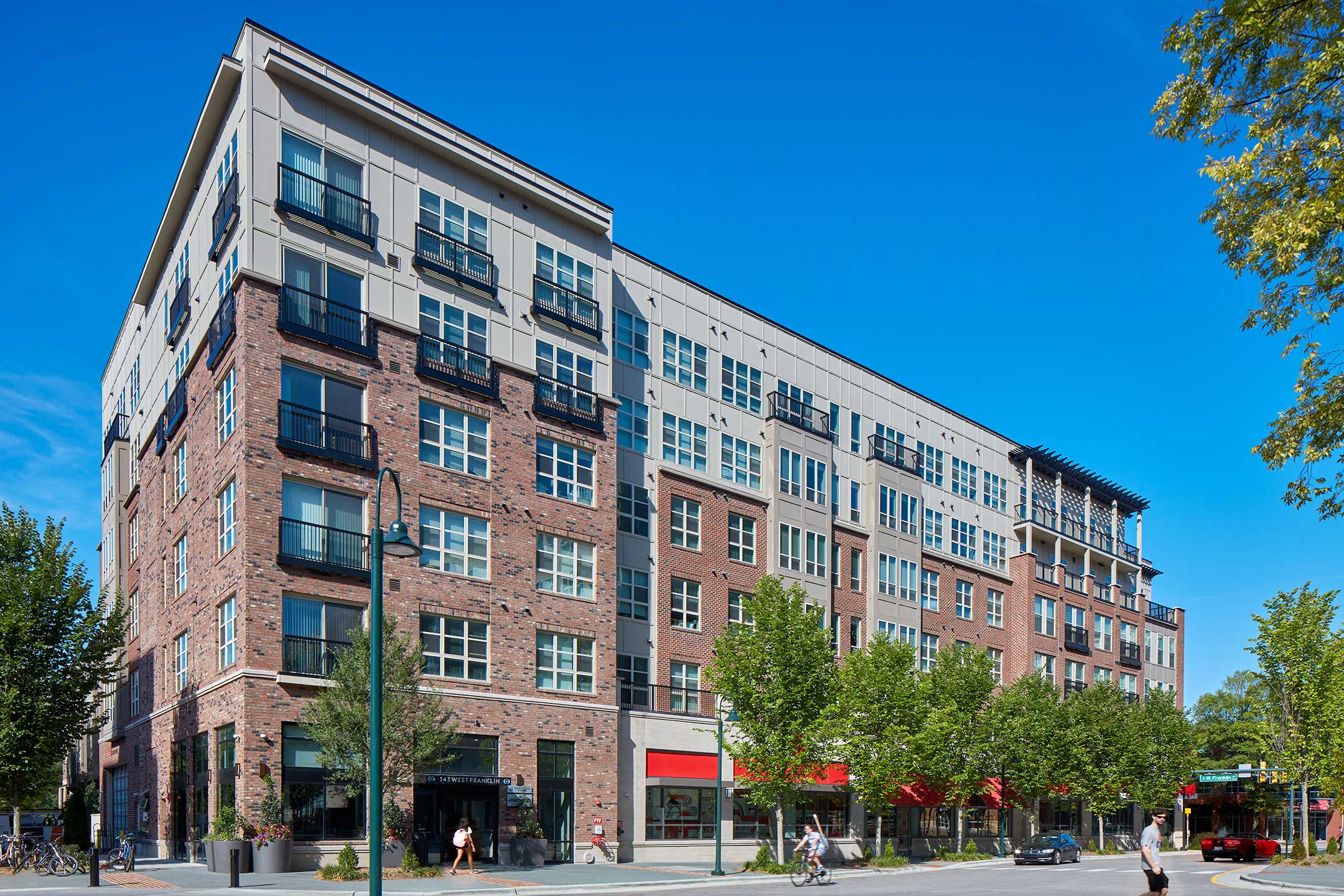 This new lifestyle destination and residential community consists of three buildings, one office building and two multifamily apartment buildings. The program consists of 42,000 SF of ground floor retail, 159,000 SF of office, 246 residential units, and approximately 860 associated parking spaces. The multifamily apartments are located above ground floor retail. At the center of the buildings is an outdoor park that functions as gathering space for the student population. Amenities include on-site security, a large strength and cardio facility, a sky deck overlooking Franklin Street, a yoga and stretching room, and a seasonally heated saltwater pool.