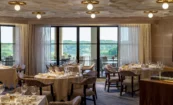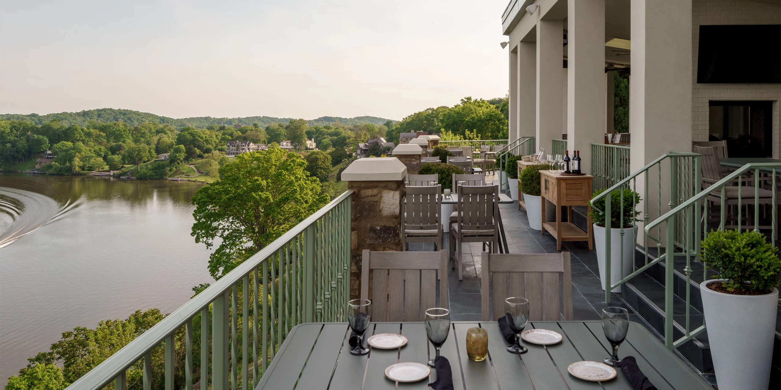 White tracery ceilings and bleached white oak wood paneling were incorporated in the fine dining space for a light, fresh feeling. In the family-friendly dining room, the paneling becomes a sophisticated pale gray green and a translucent antiqued mirror with blackened steel accent wall gives the feeling of privacy. We created a new tiered patio off the back of the restaurant to capture views of the river and city beyond. The pale gray-green tones of the interior palette continue outside and are incorporated into the furniture and fabrics.