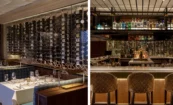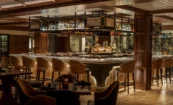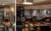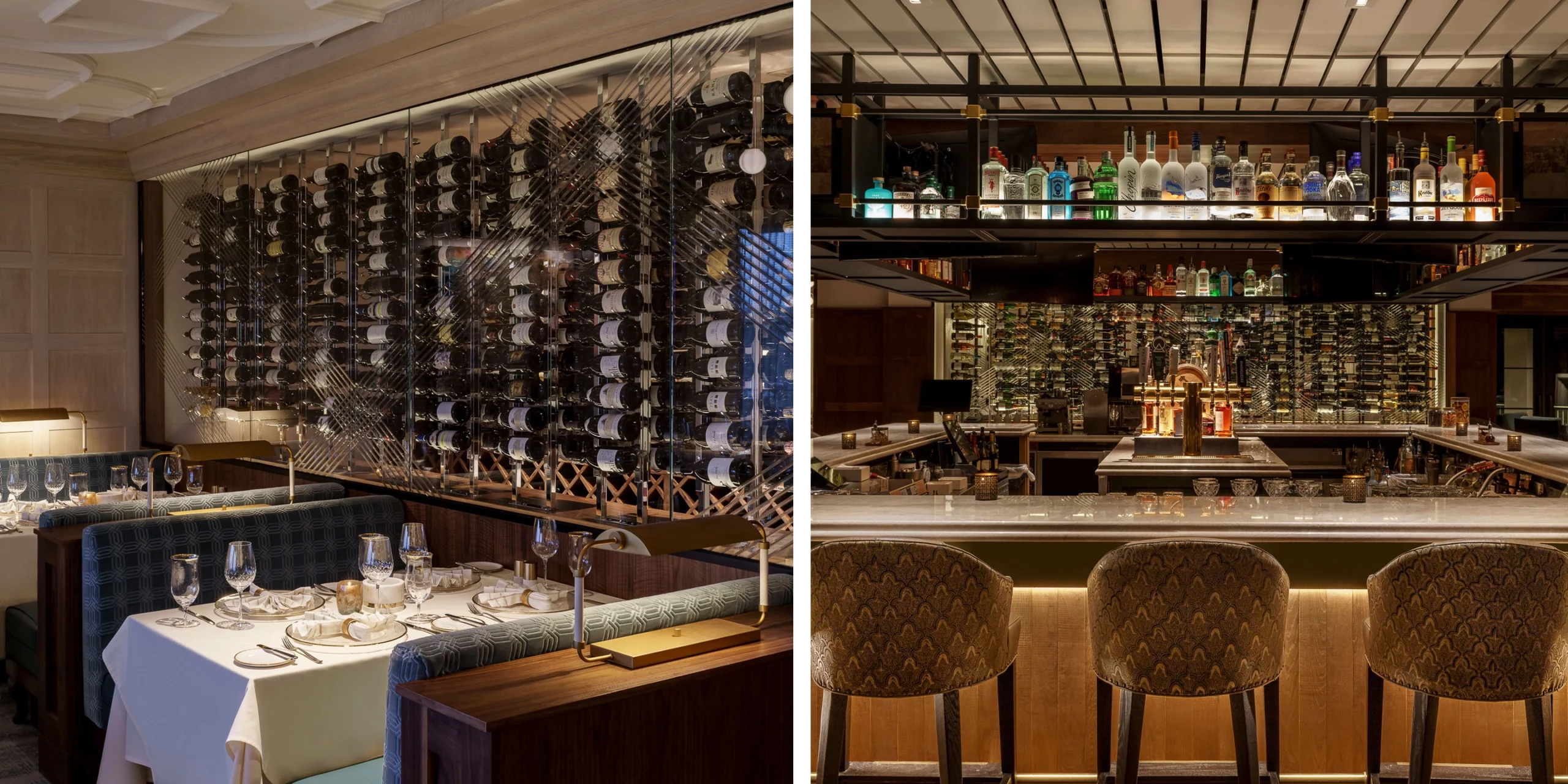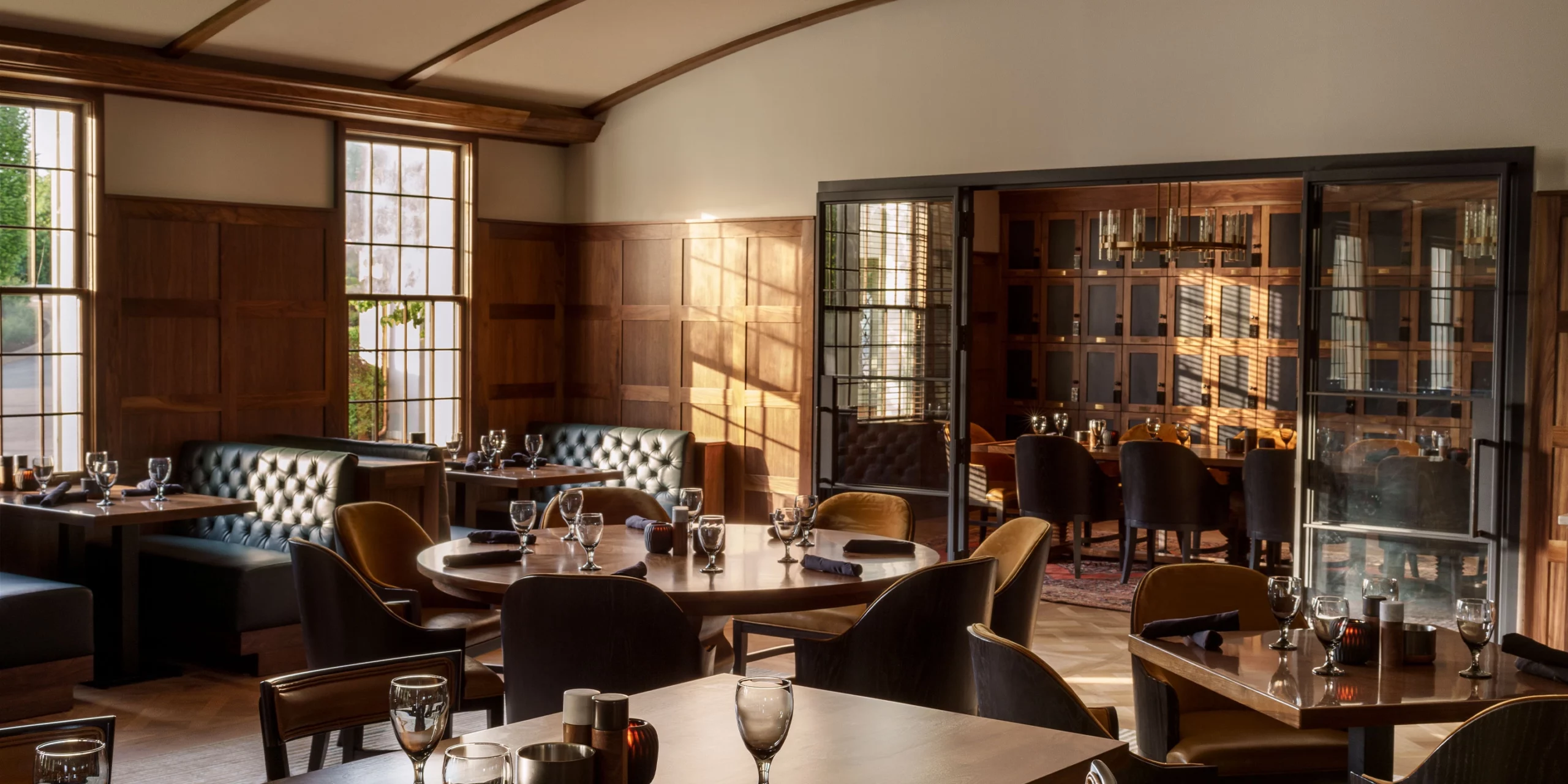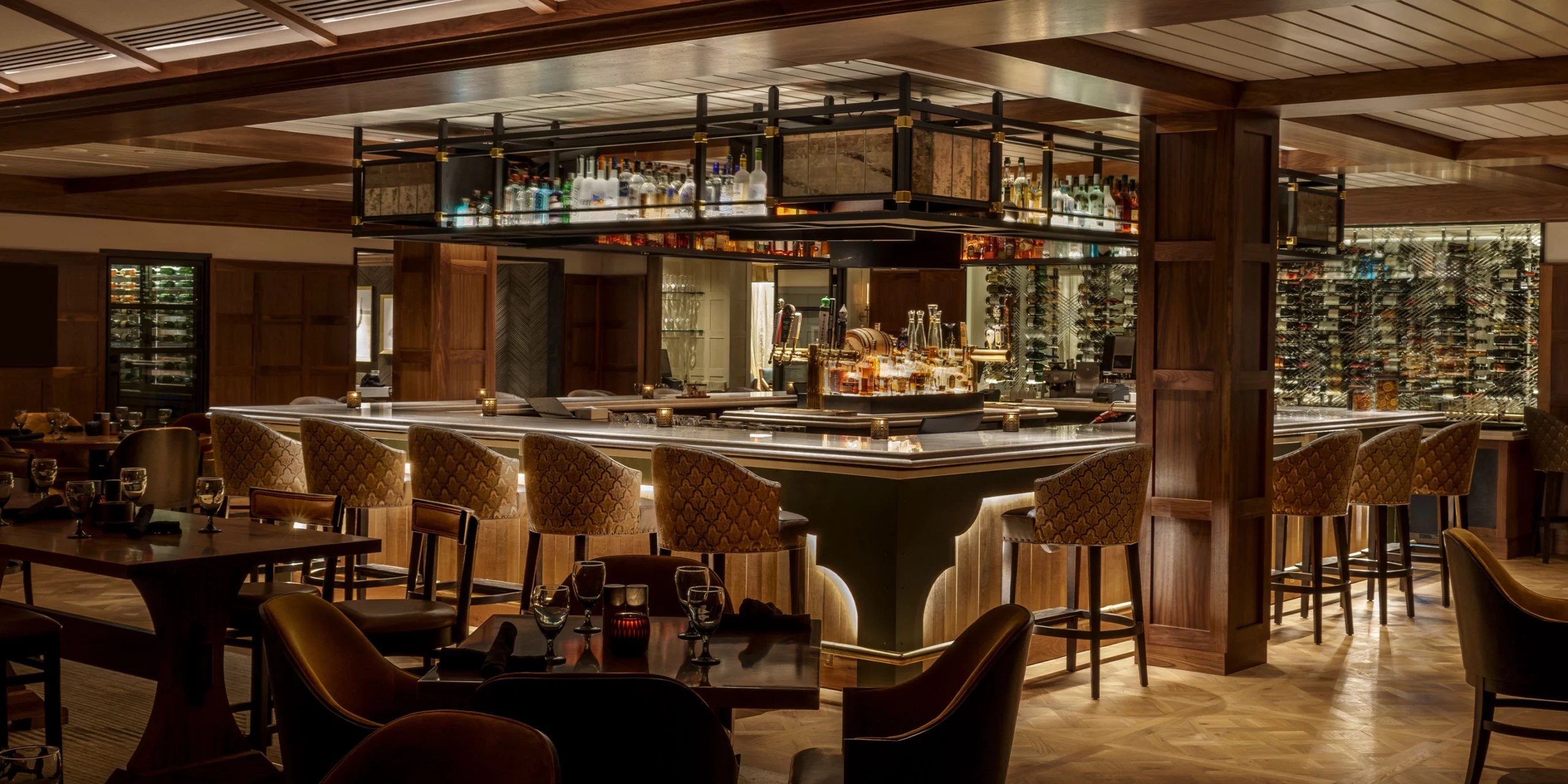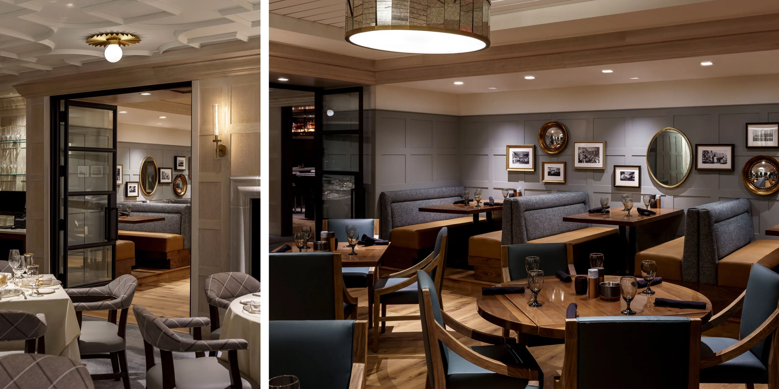 A once dark and compartmentalized space, the client challenged us to create a more open environment that invited natural light and views into the spaces. To mitigate the low ceilings and existing conditions, we lightened the color palette and maximized the ceiling height where possible to create the illusion of more height. We created a pub, private dining room, fine dining venue, casual restaurant, and new tiered patio within the more expansive space and newly added outdoor area. Walnut wood paneling in the pub and entry areas add warmth, while deep tones of green and ebony reinforce a more masculine feel. A central bar features a metal and antique mirror overbar, while a wine room with custom-cut glass provides a backdrop for both the bar and fine dining space.