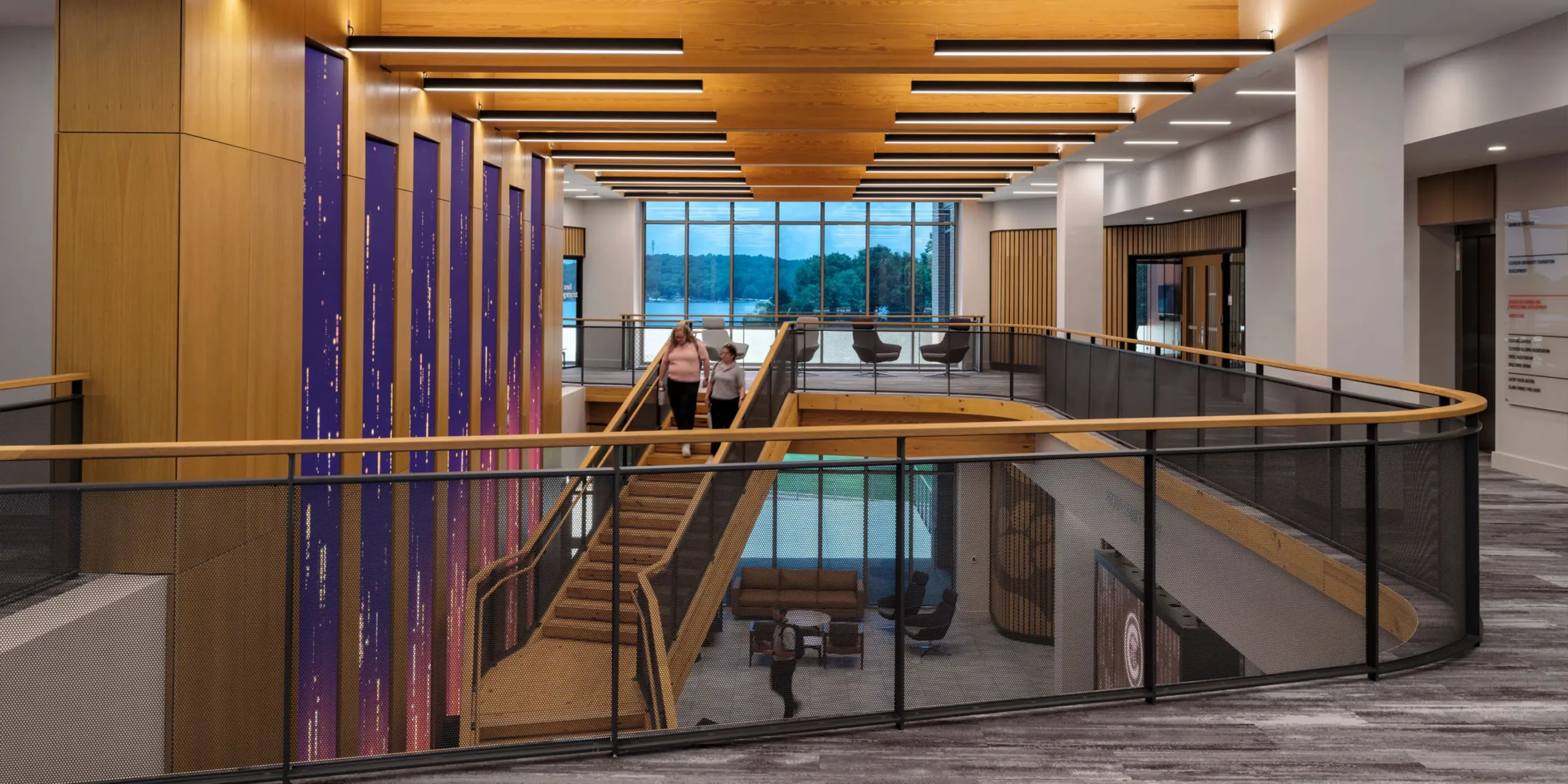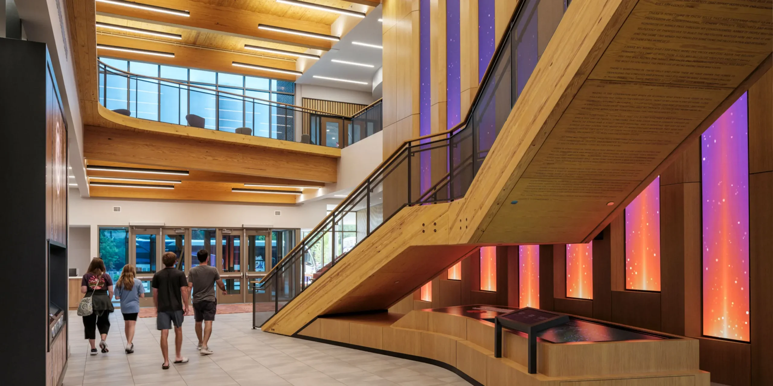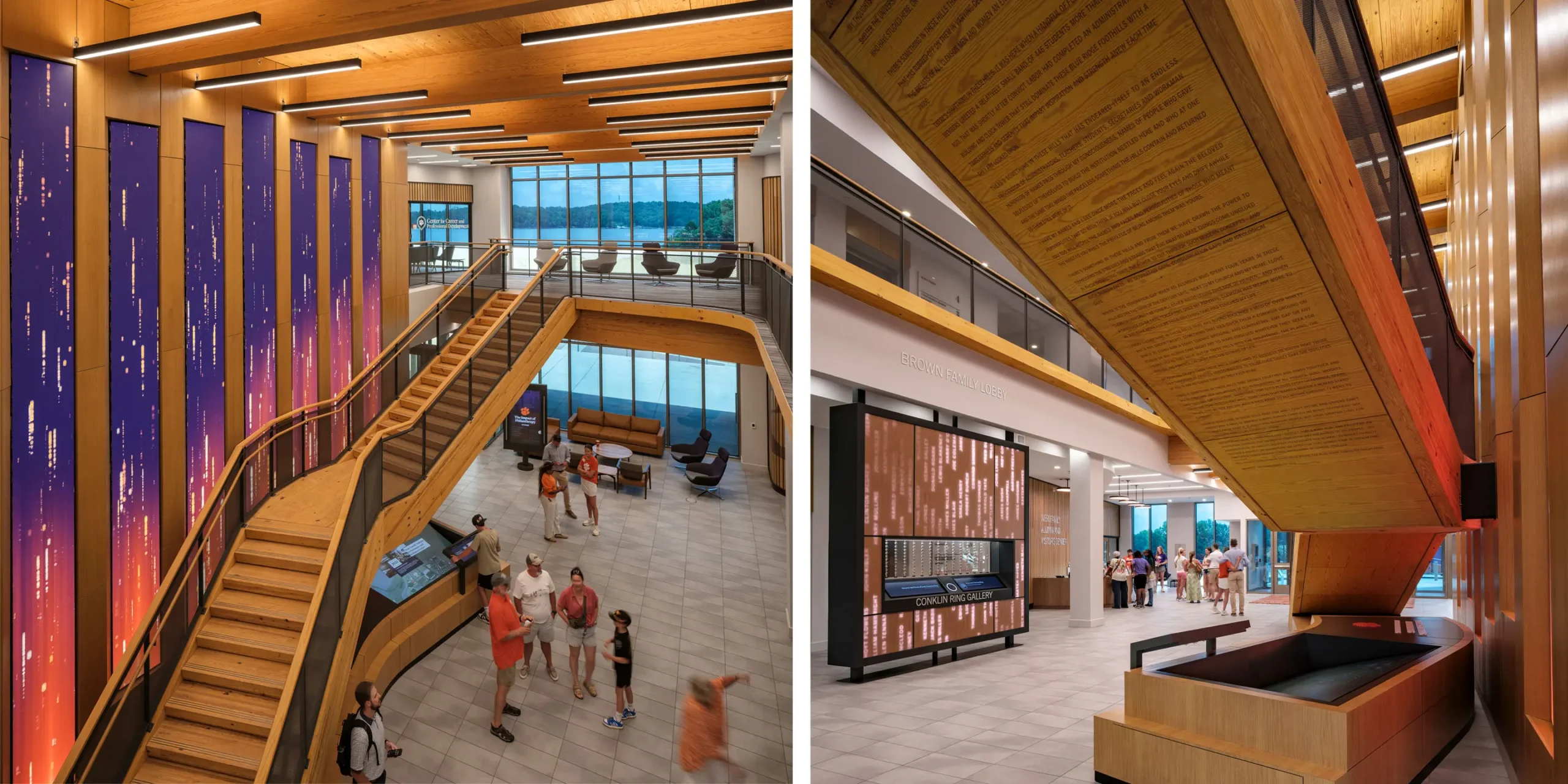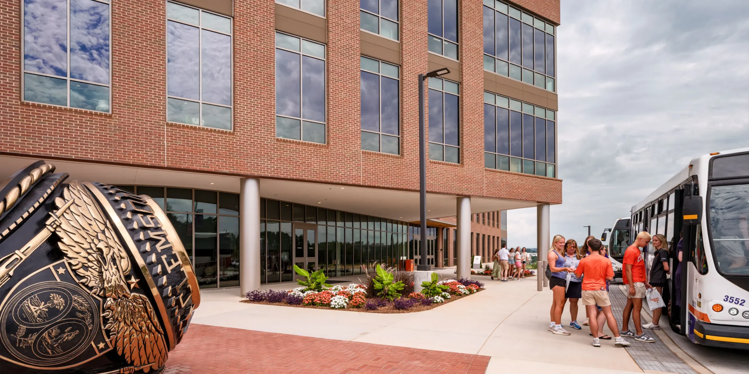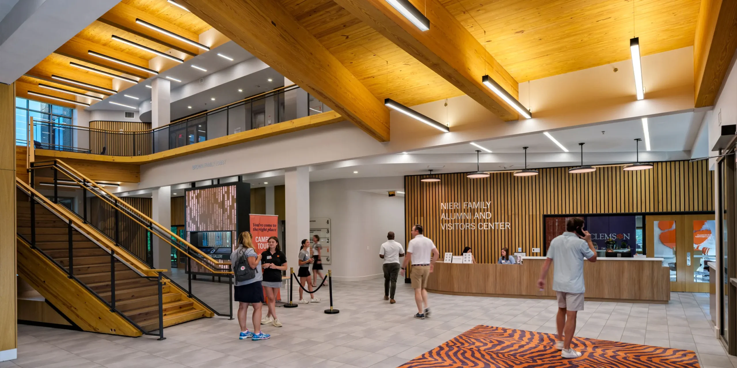 The Clemson University Alumni + Visitors Center provides a new hub for prospective students, current students, and alumni visitors who are part of the Clemson community. The project represents Clemson’s commitment to innovation and sustainability, as the building is designed with parametric modelling, a hybrid mass timber steel system, and smart glass (auto-tinting) windows. During the development of the program and the design of the center, our team focused on the experiences of multiple visitor types. The center facilitates alumni, students, future students, university leadership, industry partners, and the community at large.