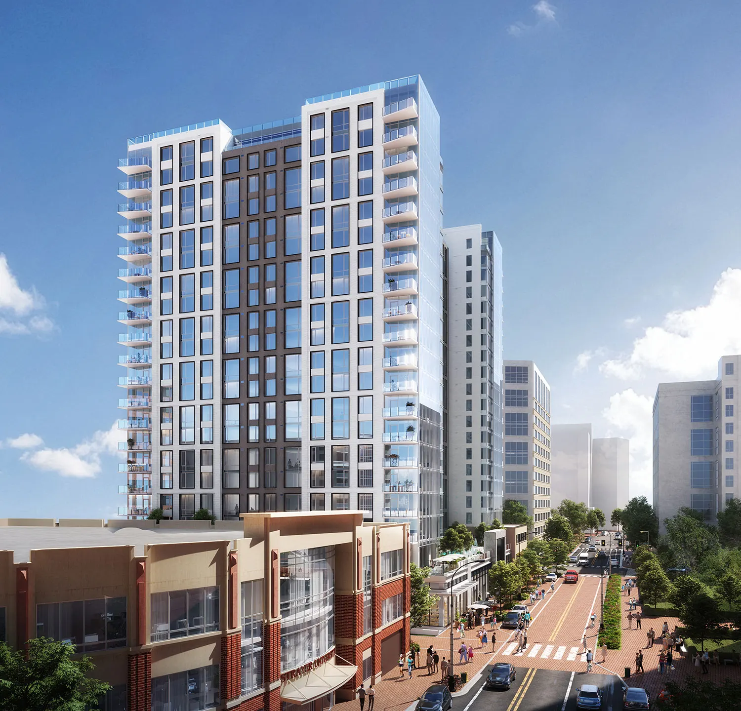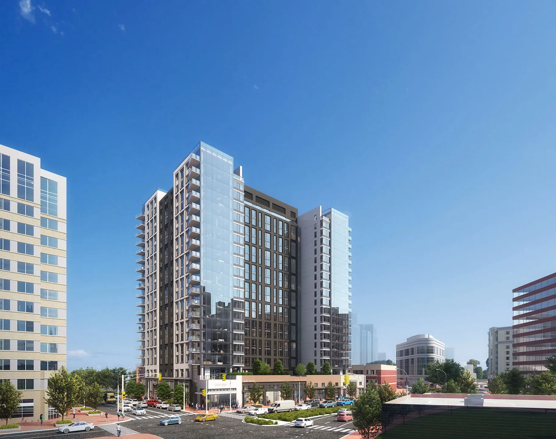 The Commodore is a 20-story, 423-unit multifamily project located adjacent to the Courthouse Metro Station in Arlington, VA. The metro tunnels run directly underneath the development, which holds three below-grade parking levels and over 400 bike spaces. A retail-oriented, tree-lined, pedestrian promenade was added along Uhle Street, starting at the entrance to the Courthouse Metro and extending several blocks south along a future park.