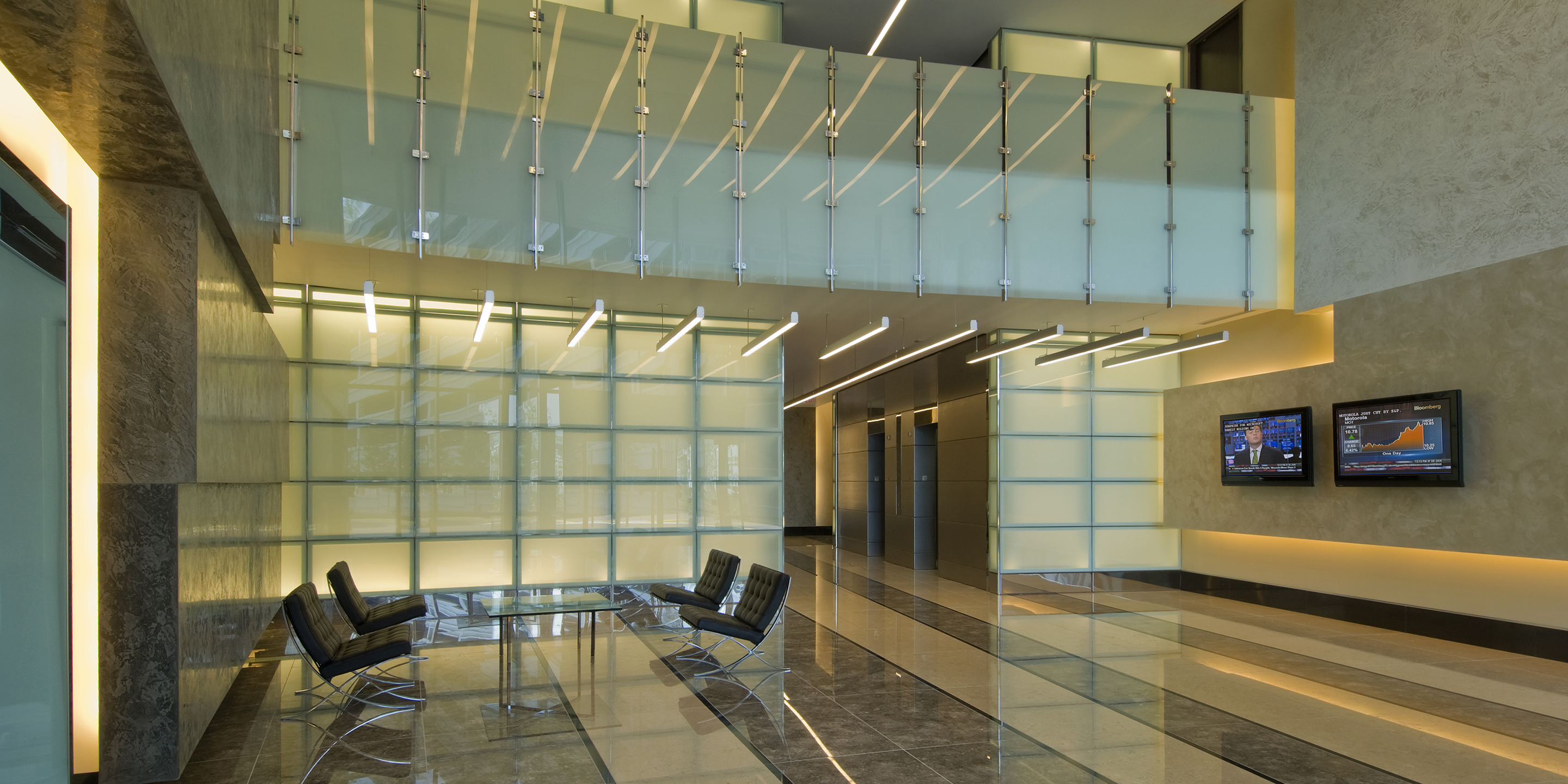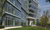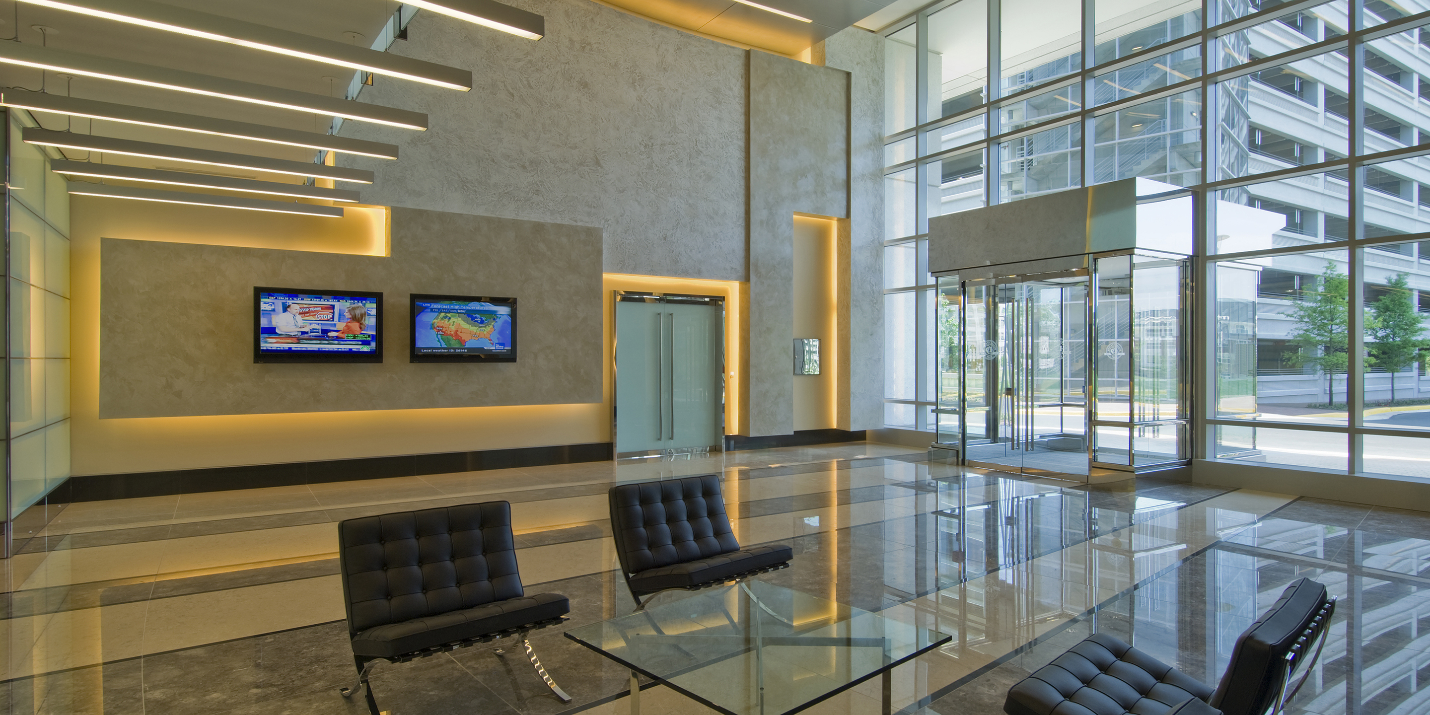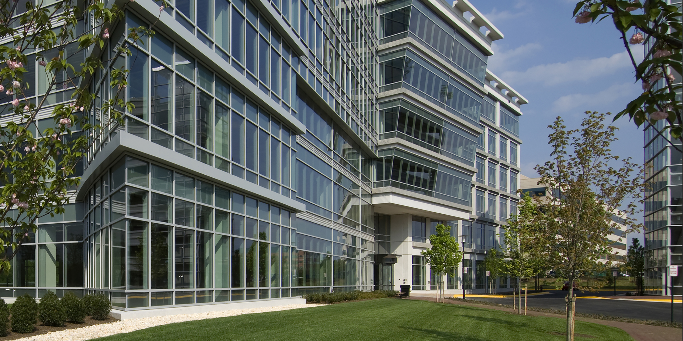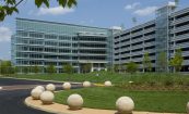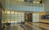 The Dulles Station development sits along the high technology corridor between Dulles Airport and Washington, D.C. The site is significant, not only in being 10 minutes from the AOL headquarters and five minutes from Dulles Airport, but in that it is slated to link to a mass transit rail station within the next decade. Building A greets visitors immediately as they enter the site, with its iconic corner covered in curtainwall. The six-story building holds 180,000 square feet and was developed by client Crimson Partners. Cooper Carry provided interior design services for the base building, creating a light-filled lobby incorporating Venetian plaster, intricate marble floors and backlit glass panels. Cooper Carry is designing four office buildings on the site, along with two hotels and two parking structures.