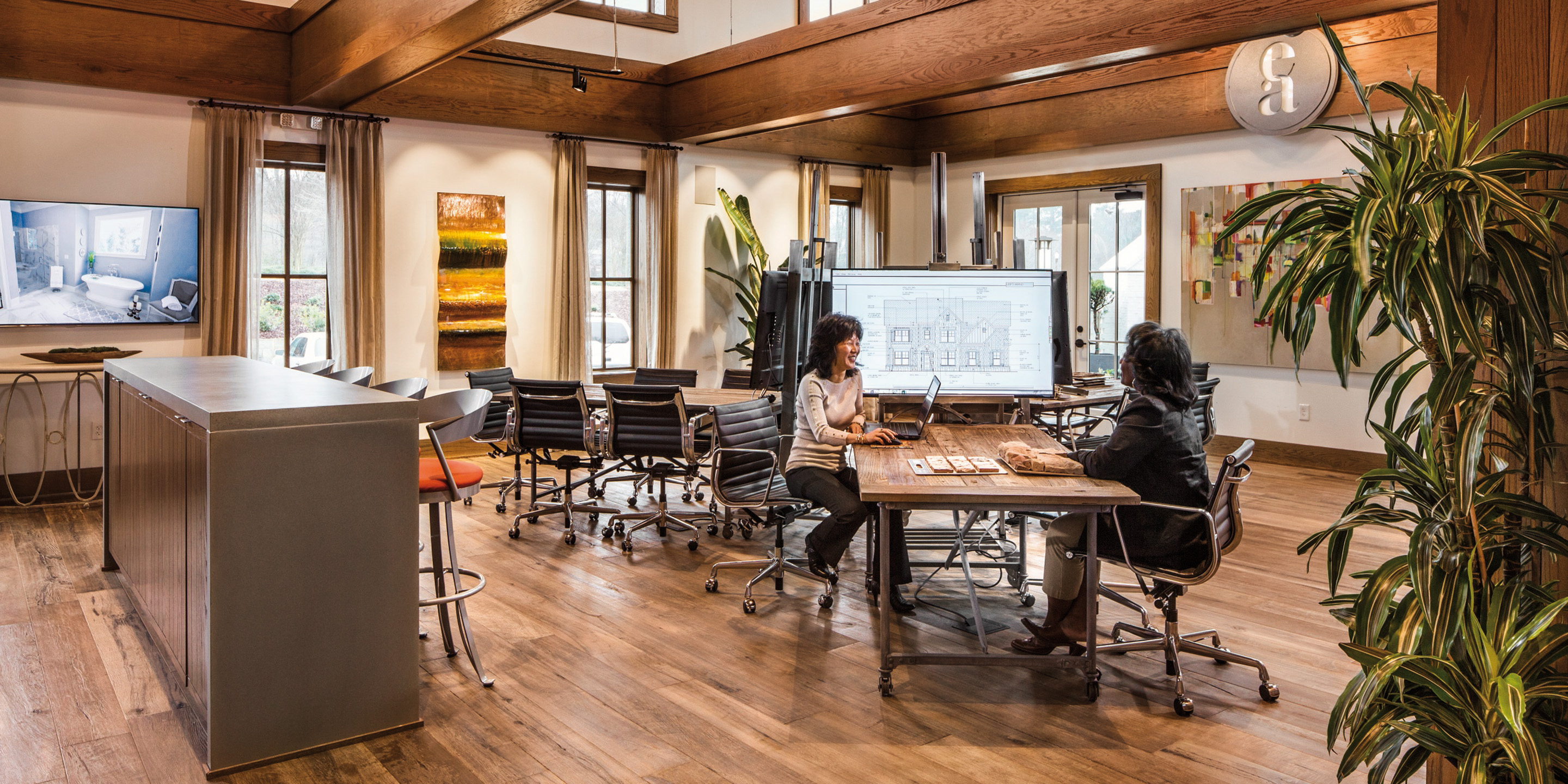 Edward Andrews Homes (EA Homes), an Atlanta-based custom builder turned to Cooper Carry to design their new 7,000 square foot design center. The company needed a fresh take on the typical builder showroom environment, foregoing the traditional kitchen and material vignettes for technology-based 3-D visualization. This allowed them to operate in a third of the traditional square footage. The technology platform was being developed simultaneously, with the intent to streamline the decision making process. Flexibility was a big driver, as they wanted to use the main design space for receptions too.