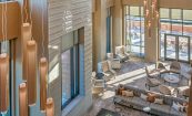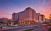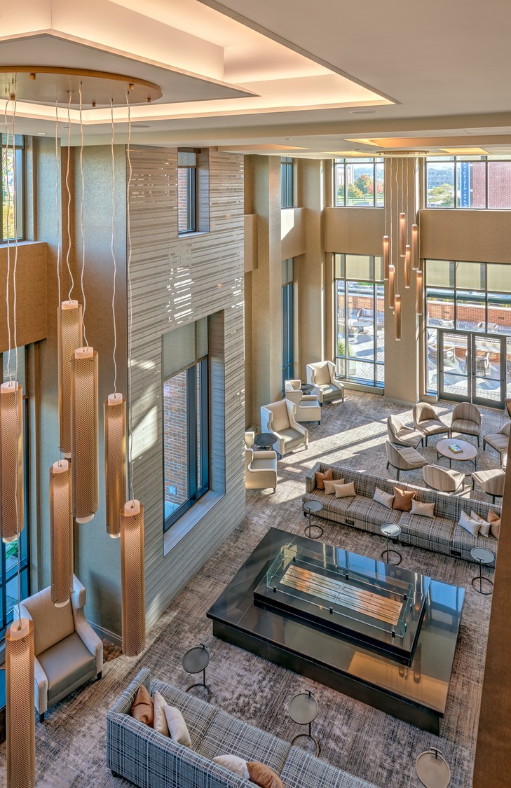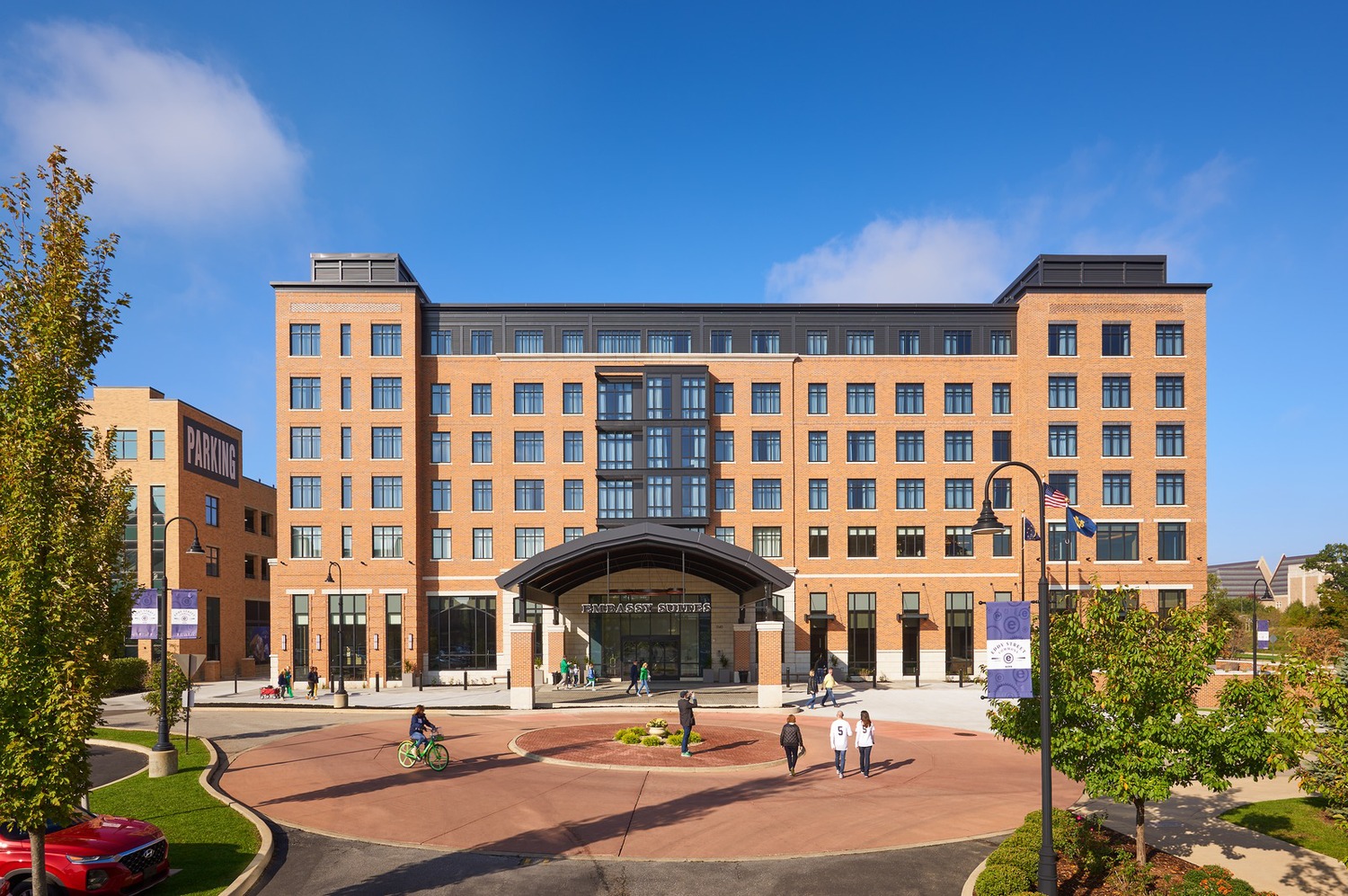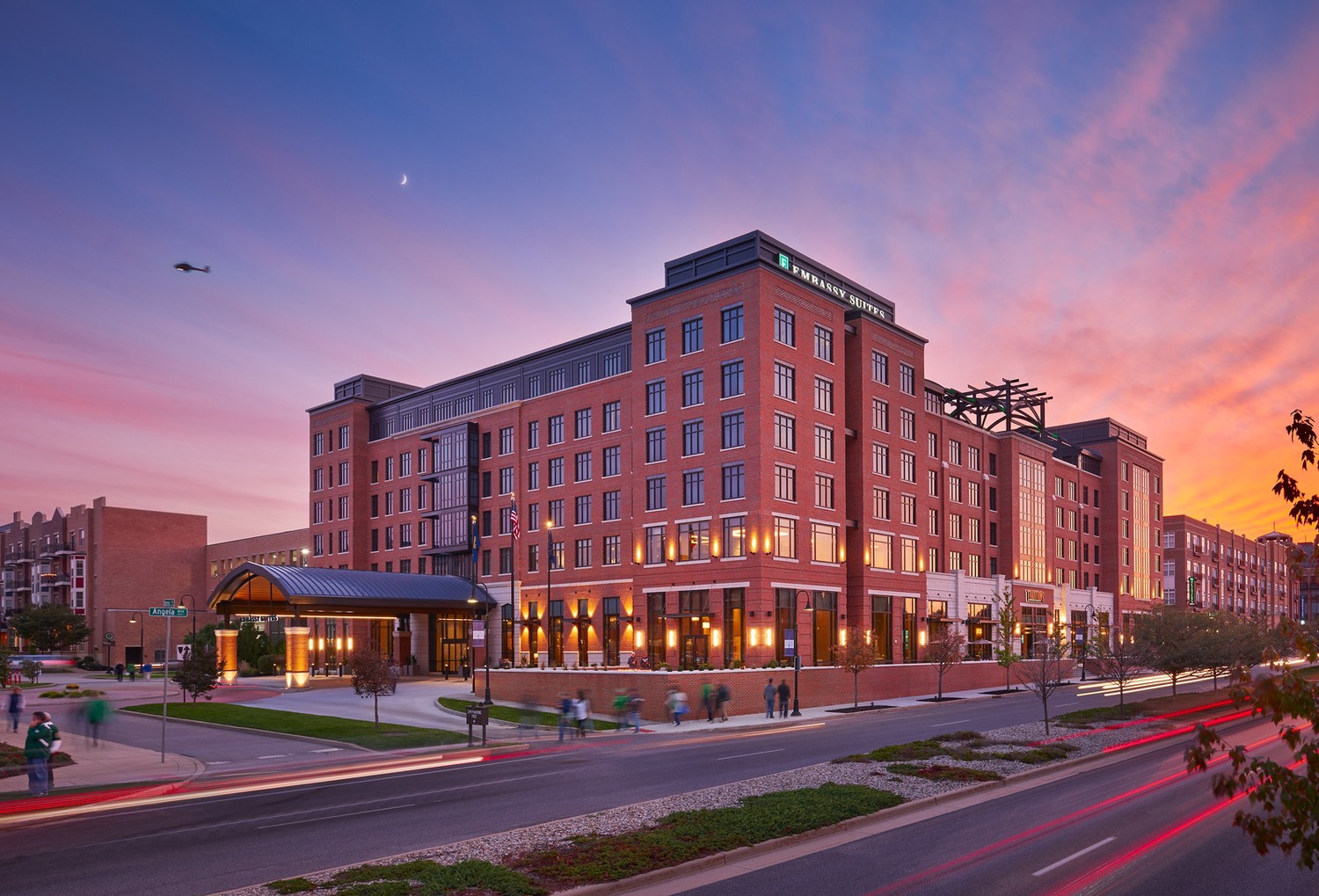 The new Embassy Suites at the Eddy Street Commons is a 164 key hotel that includes an extensive food and beverage program, 8000 sf of meeting space, a fitness center, and a rooftop amenity terrace. The design of the north façade draws pedestrians from the Eddy Street development further down Angela Street, continuing the urban atmosphere of the neighborhood. Both the exterior and interior of the hotel are designed to meld the collegiate Gothic style of Notre Dame’s campus architecture across the street with the industrial feel of the adjacent buildings along Eddy Street.