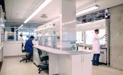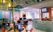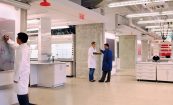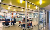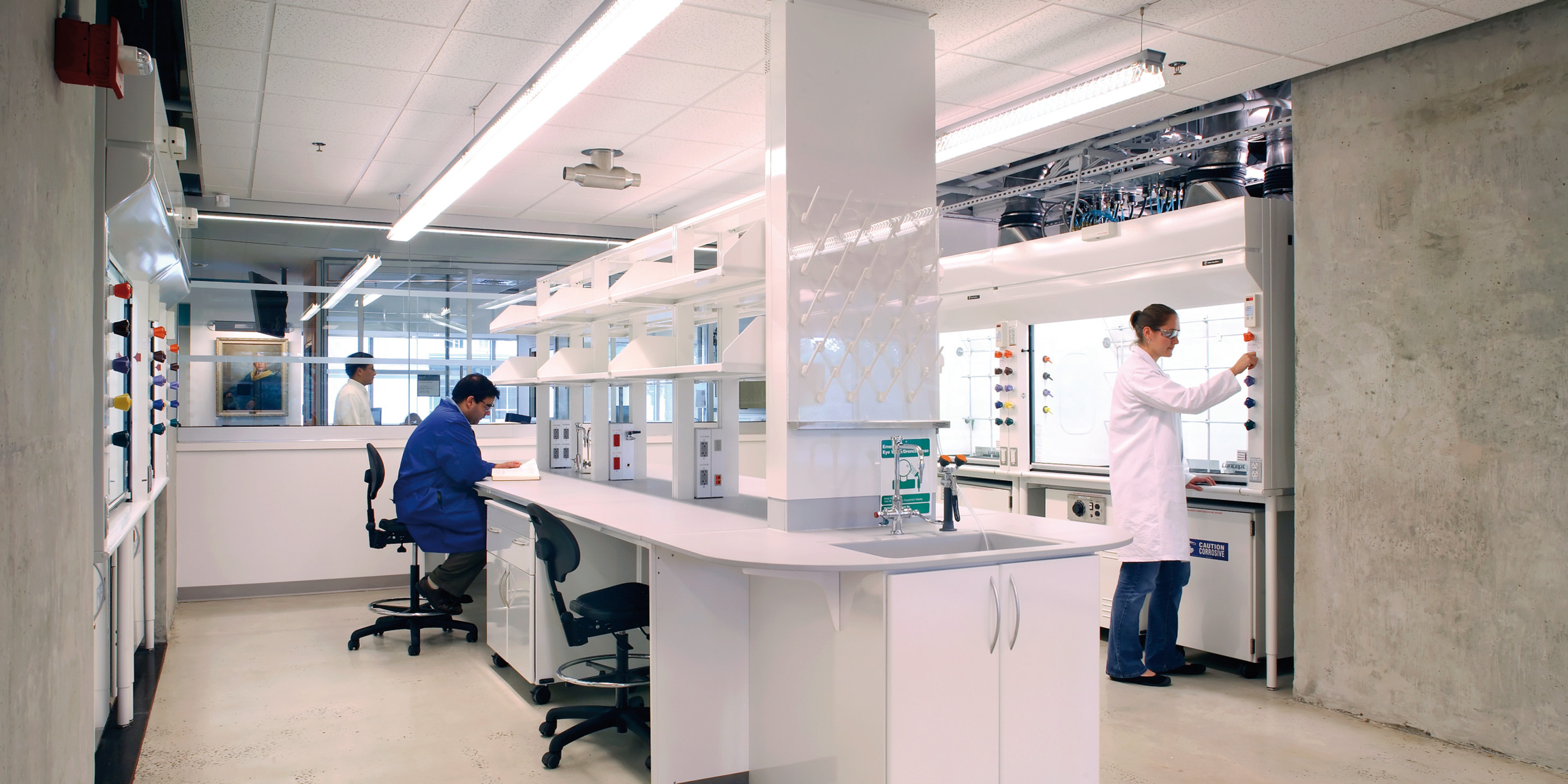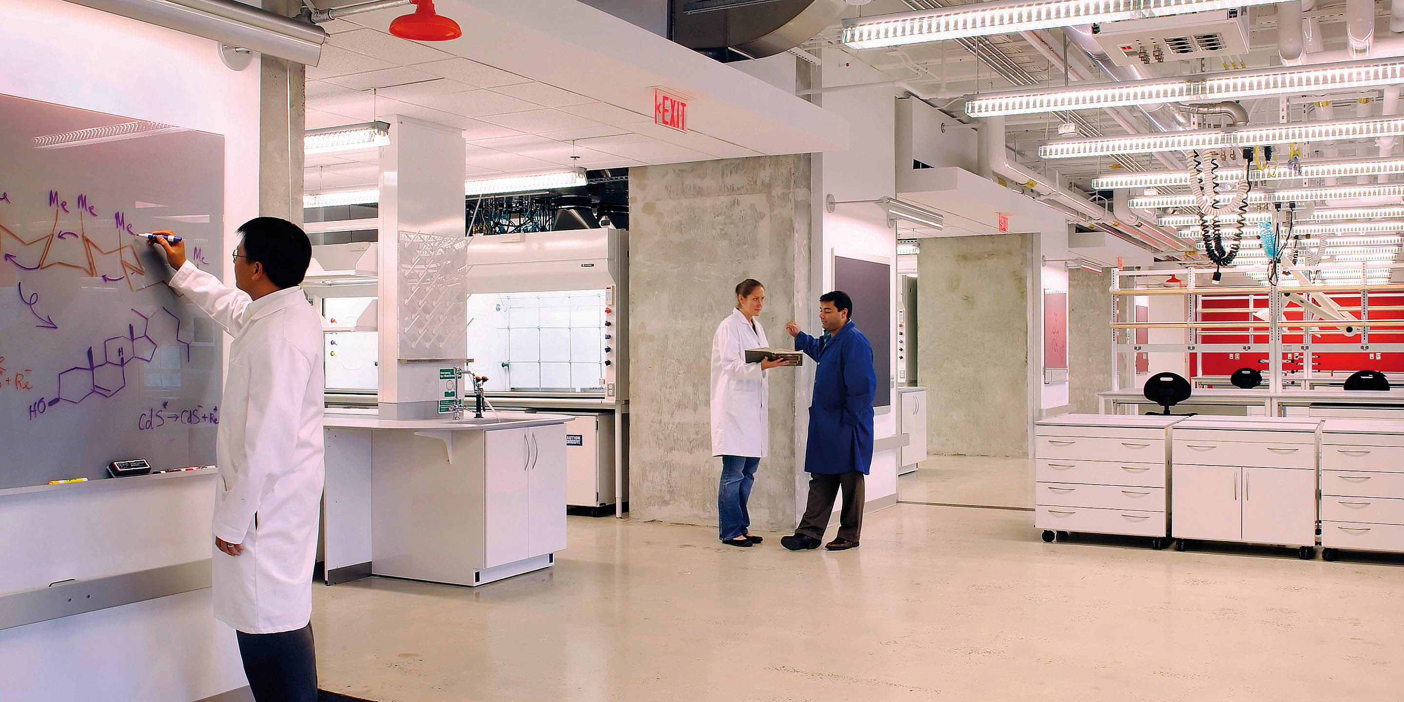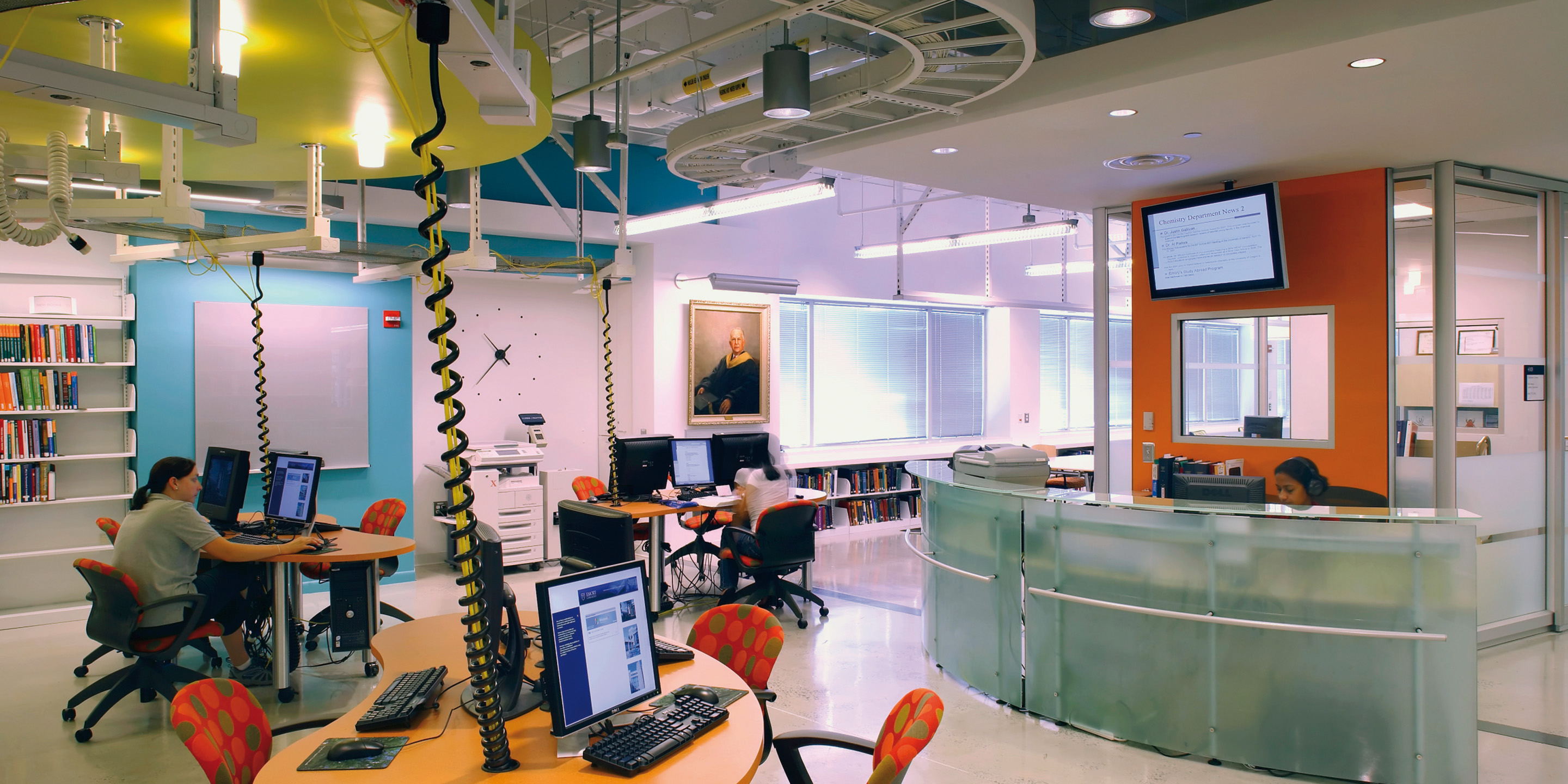 This project is a prototype of a highly adaptable environment that links research and teaching activities. A major goal of the design was to help users interact with each other and with technology—easily, naturally, and effectively. The project’s 10,000 square feet of space is subdivided into two zones: a ‘wet’ synthesis chemistry laboratory and a ‘dry’ Information Resource Center (IRC). Glass walls provide strong visual connections and safely segregate these zones. Interaction spaces at several scales have been incorporated into the plan including several casual huddle spaces and a large glass teaming room that can be subdivided using a powered overhead door system. All non-wet lab partitions in the projects are constructed using a demountable architectural partition system that is easily movable and reconfigurable. The Information Resource Center has been conceived as an interactive service oriented space that connects users to library support staff. Amenities include a diverse mix of seating, an overhead power/data distribution system, a coffee bar, large high-resolution wall mounted flat panel monitors for presentations and chemistry related art work carefully integrated into the design. Furniture will be mobile and users will be allowed to reconfigure furniture arrangements to meet their needs. All power and data services for computer tables and seating will be provided from overhead service carriers. A collaboration space/meeting room can be easily reconfigured from two 8-person rooms to one 16-person room by raising a glass overhead powered door. The ‘wet’ synthesis chemistry laboratory features plug and play re-locatable chemical fume hoods and laboratory furniture which will reduce the time and cost associated with reconfiguration of the laboratory as needs change.