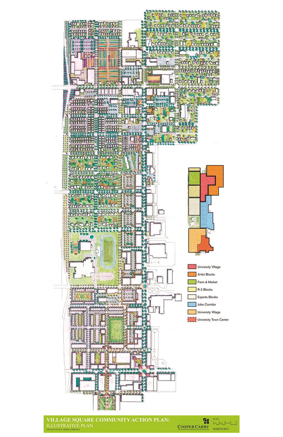 As part of the NEA Our Town Grant, the Cooper Carry Team performed a feasibility and design study for the Village Square, an urban, 3.1 acre outdoor public space with programming that celebrates the arts and other activities as a new civic destination in the Village. The Village Square design also identifies pathways to finance and sustain the construction, management, and operations of Village Square. In addition a Community Action Plan revitalization strategy was developed for a roughly 16 by 5 block area centered on 24th Street connecting Village Square to Creighton University. The revitalization strategy consists of developing a Village core around Village Square; rebirthing 24th Street as the “Street of Dreams,” increasing density; providing creative space to support the arts, artists, and artisans; incorporating market-rate housing; activating vacant blocks; growing and distributing fresh food; and creating a university village and town center adjacent to Creighton University.