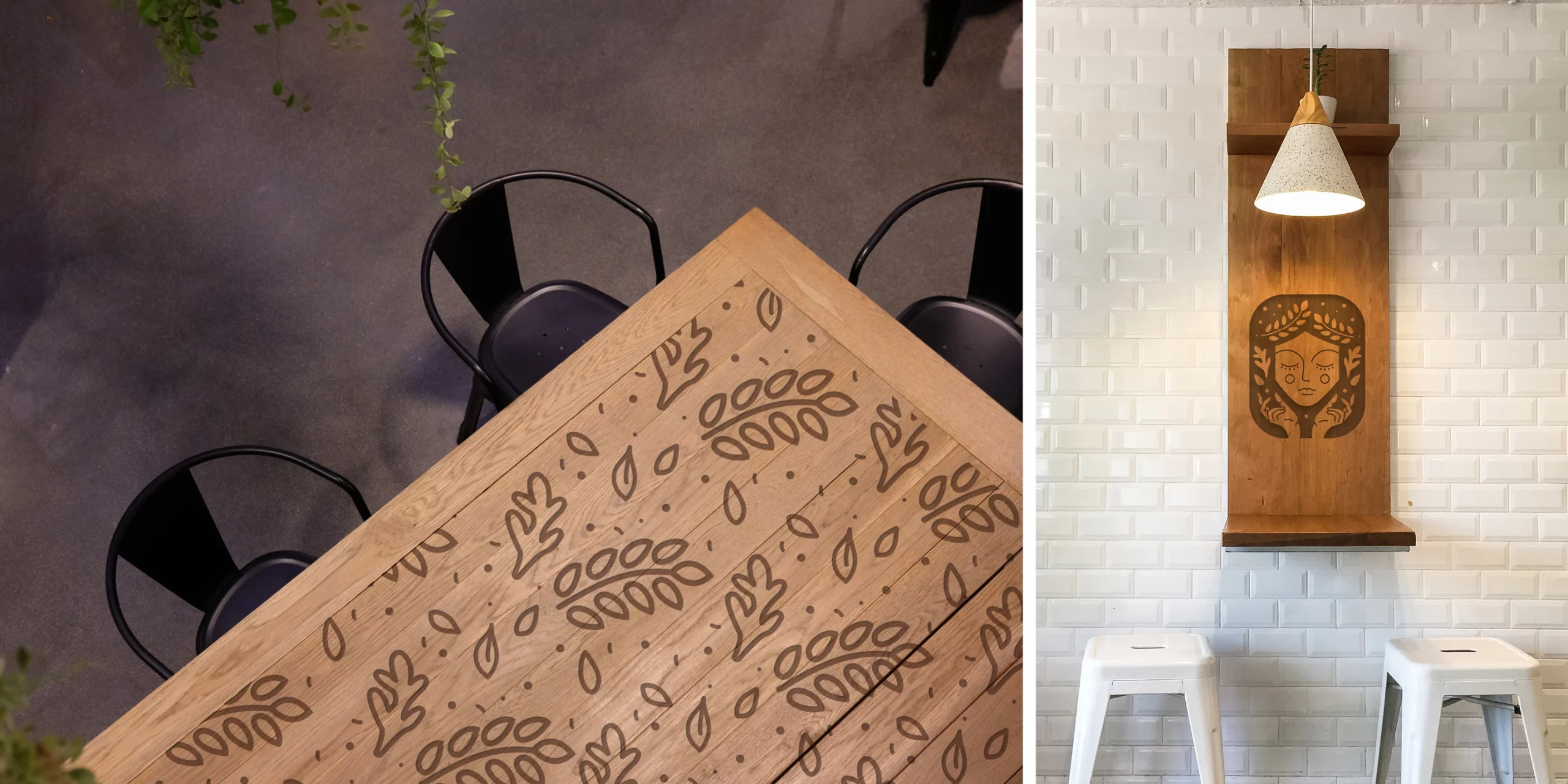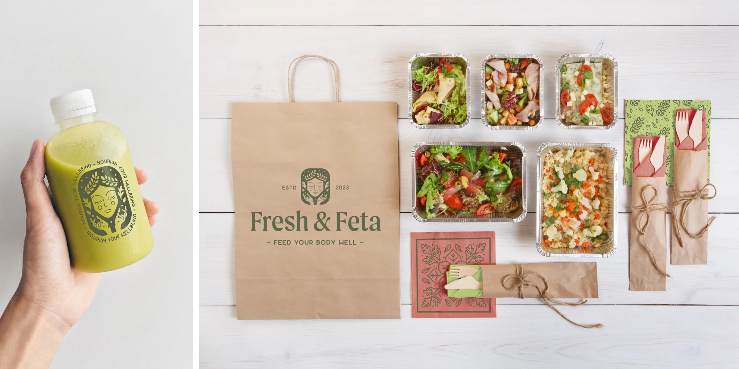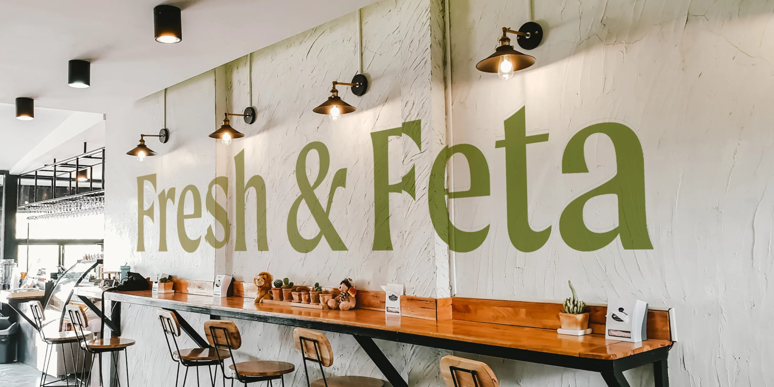 Cooper Carry's brand team developed the Fresh & Feta restaurant brand for the new dining facilities at Hitt Hall at Virginia Tech. This dining outlet is Mediterranean focused, with fresh ingredients the star. As with all of the concepts for this project, the client wanted students to be able to immediately recognize the type of food on offer. Cooper Carry Branding gave it a nice and crisp alliteration with the name Fresh & Feta. Designed around the goddess motif, the Fresh & Feta brand is soft and enchanting. The center goddess, with her rosy cheeks and laurel crown, tosses the fresh ingredients available to customers. The typeface gives the impression of being hand carved and bespoke, and is paired with a gentle, rounded font for the tagline. Multiple additional logo assets were designed to provide maximum versatility to the brand including special patterns, tile designs, and various logo iterations for different applications.