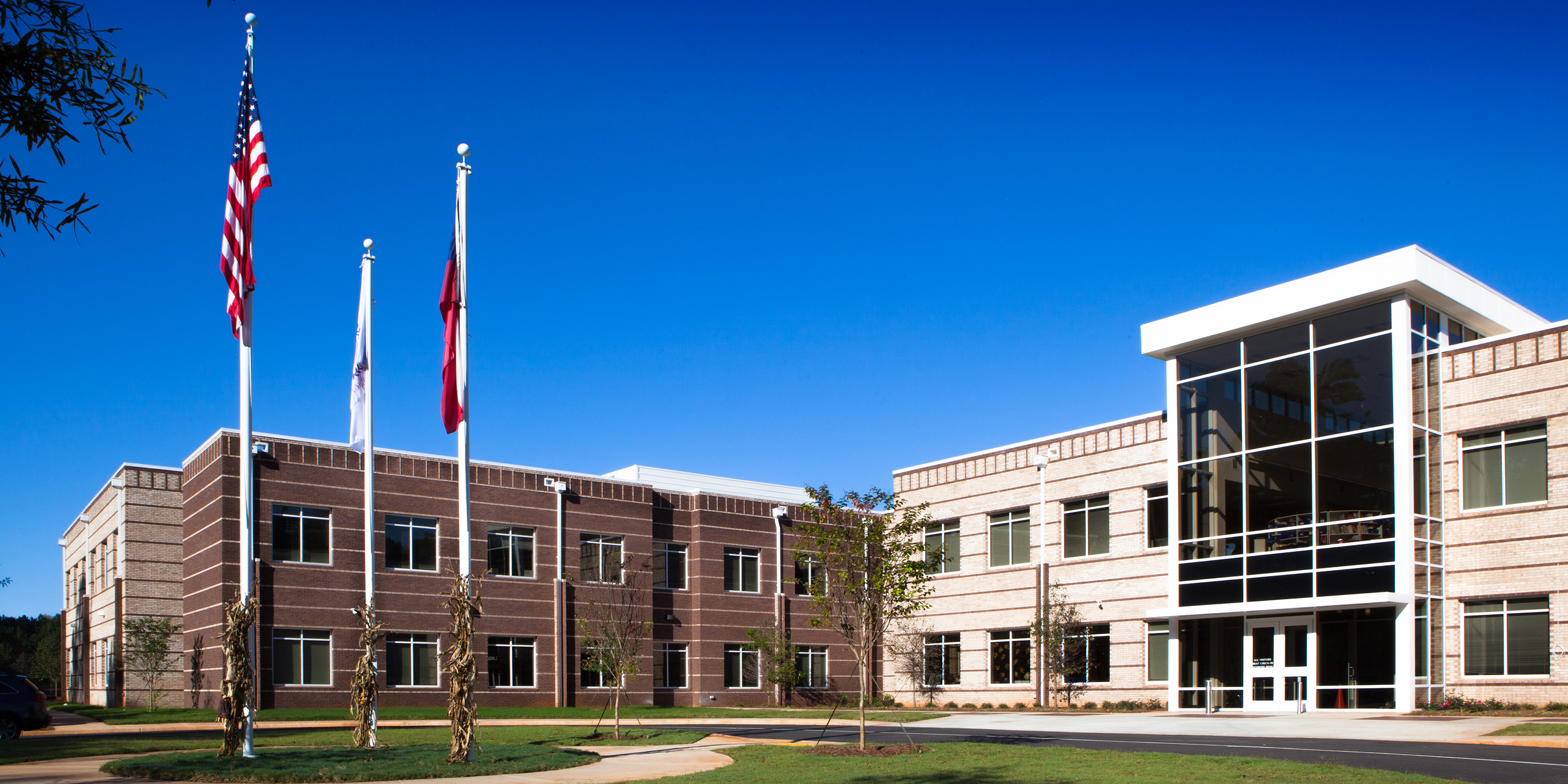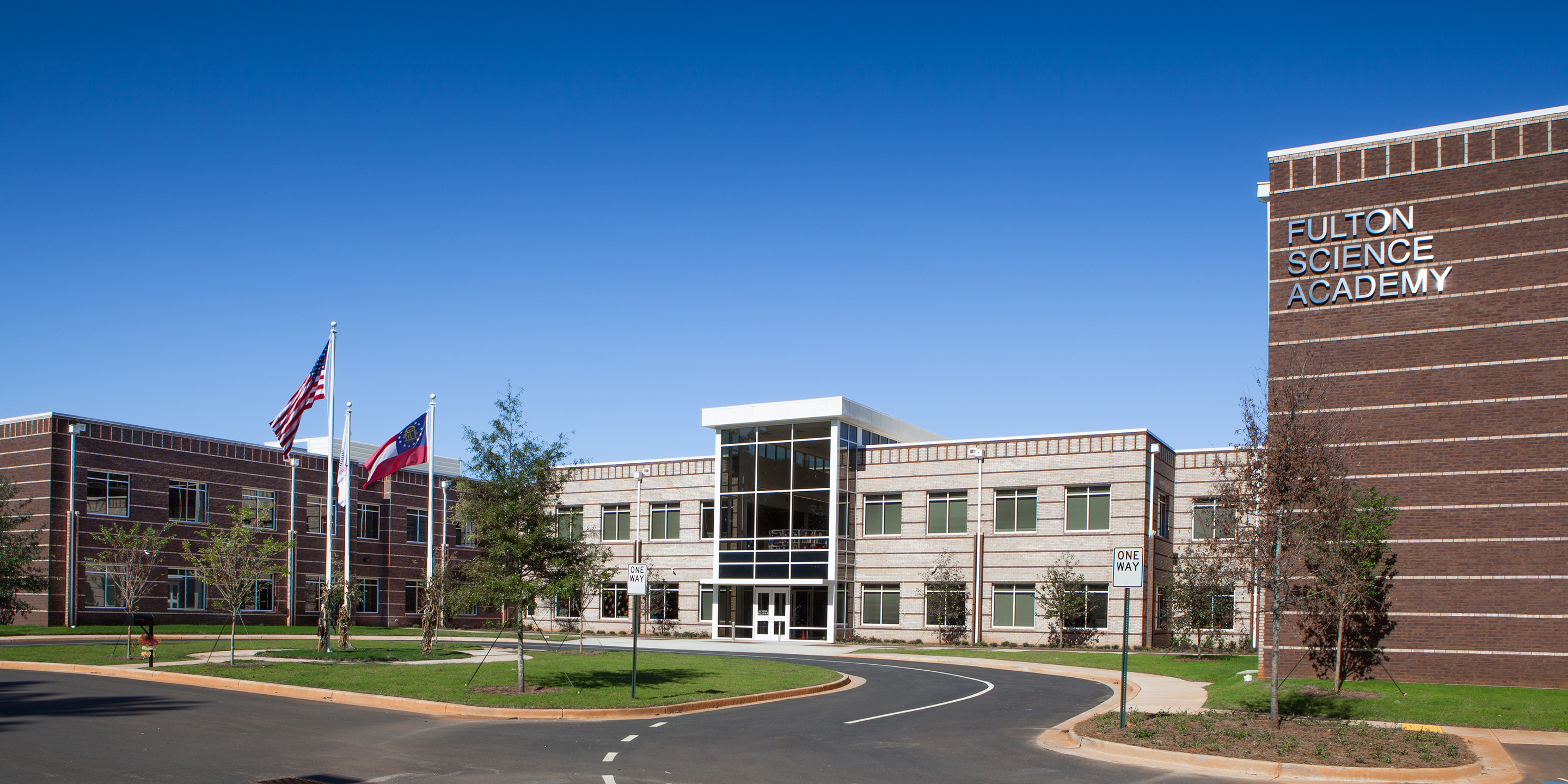 The Fulton Science Academy is a K-12th grade private school located in Alpharetta, Georgia. The 66,000 square foot school consists of classrooms, science labs, administration and core spaces. The core spaces include a gymnasium, cafeteria, and media center. A key design feature for this school was to provide extensive square footage at minimal per square foot cost to the owner. This has been achieved through careful selection of materials, systems and efficient floor plan. The school is a two-story (split level type) building set into the side of a hill, thus working with the current topography and creating an economical balanced site design. The entry is punctuated with a glass tower feature inspired by school administrators and their direct involvement in the design. Furthermore, it has been our design intent to use both hand made materials, such as brick, along with more machined materials, such as crisp metal panels, to accentuate between art and science. The site has been master planned to include several large additions and site improvements.