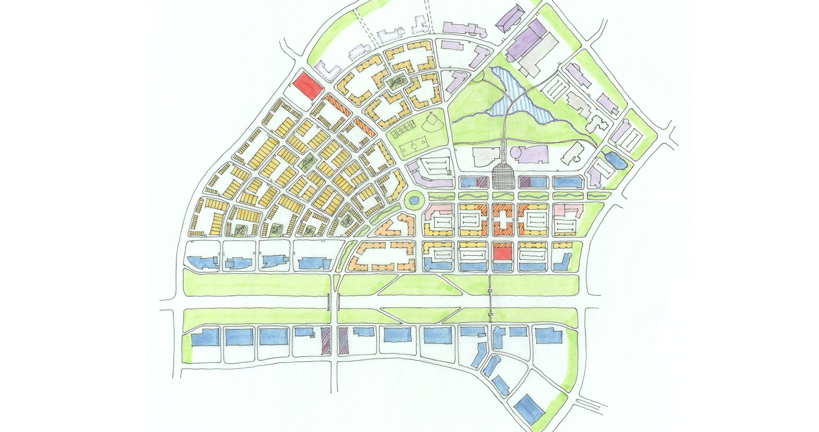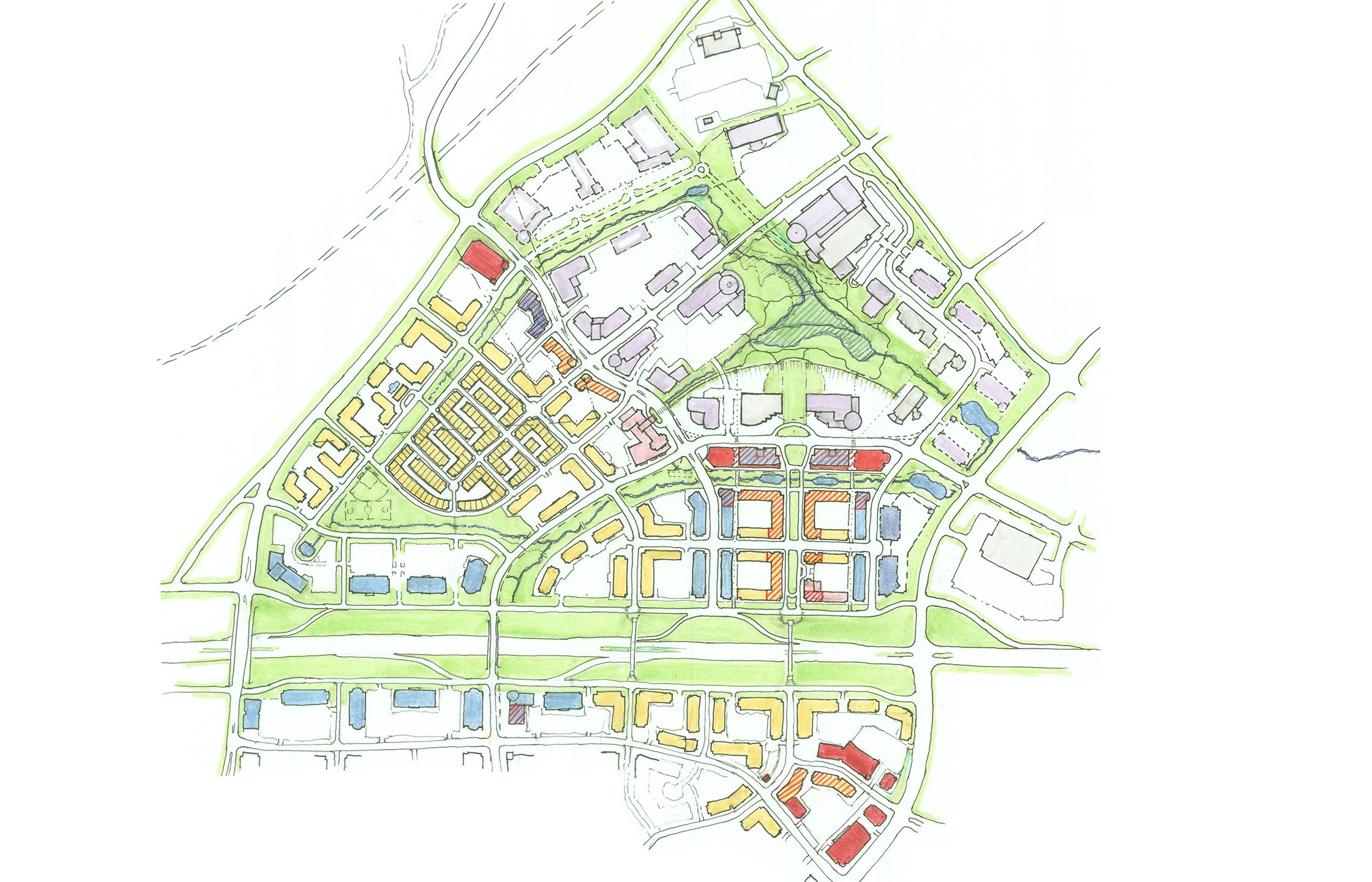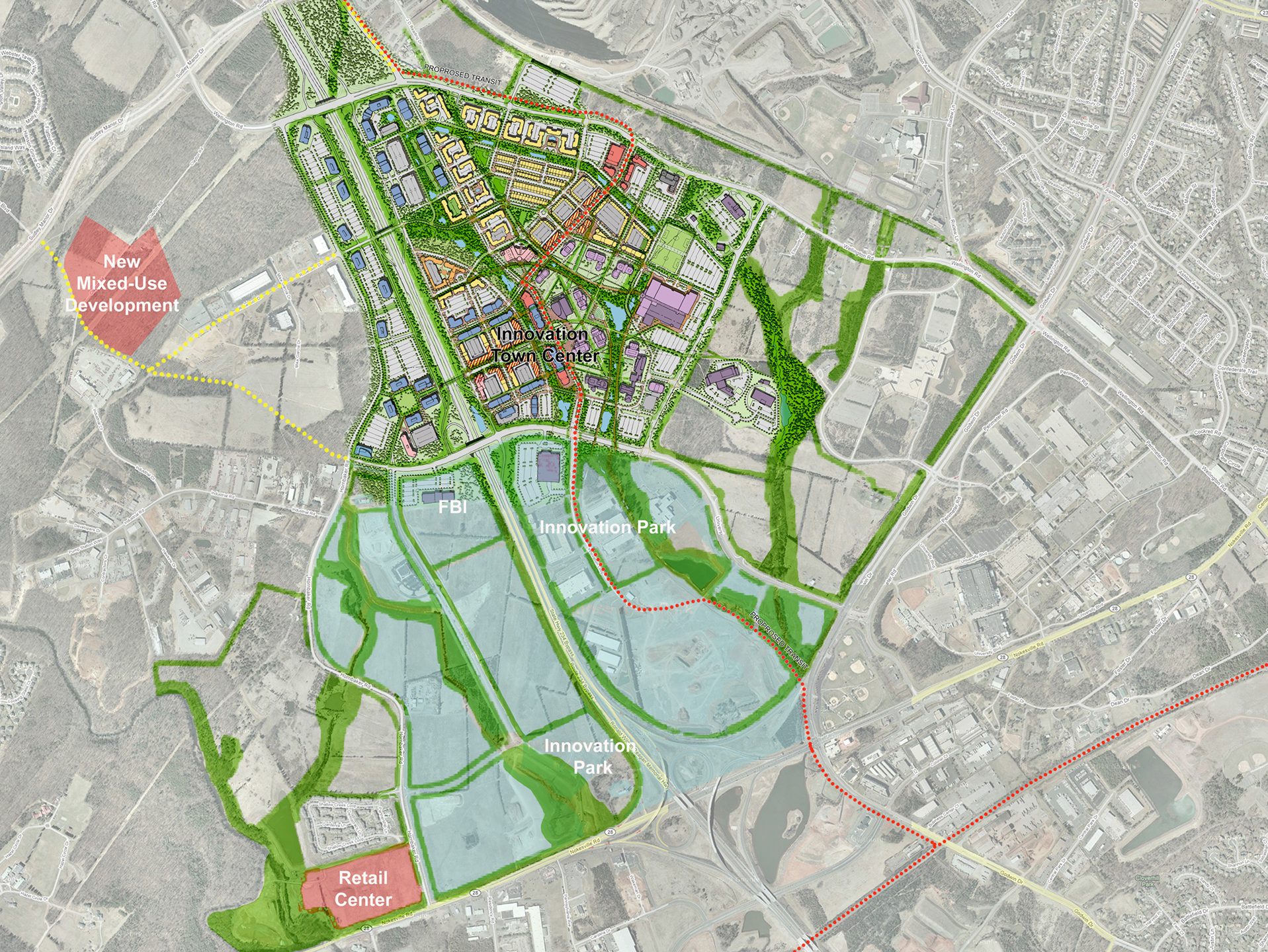 The Innovation Town Center Master Plan is designed to connect the existing suburban-style Prince William campus of George Mason University, neighboring Innovation Technology Park, and surrounding residents to create a unified “communiversity.” Three adjoining property owners: George Mason University, Prince William County Department of Economic Development, and the owners of the Odin/Feldman/Libby property charged the design team with developing a master plan that would draw a community together and encourage social interaction and learning. Through this plan, George Mason University intended to expand its existing Prince William County campus. Prince William County sought to create a cohesive community in the area surrounding the Innovation Technology park. The concept for this plan emerged from the realization that George Mason University and its partner components, Freedom Center and Hylton Performing Arts Center, could create a substantial anchor for such a community. Alone, these institutions are not well integrated as one place; however, combined with a captive audience and an economic engine like a town center, they could mature into a healthy community. Ultimately, the goals of the university, county, and private owners aligned towards a common aspiration to create a master plan that would connect people through fitness, education and culture.