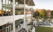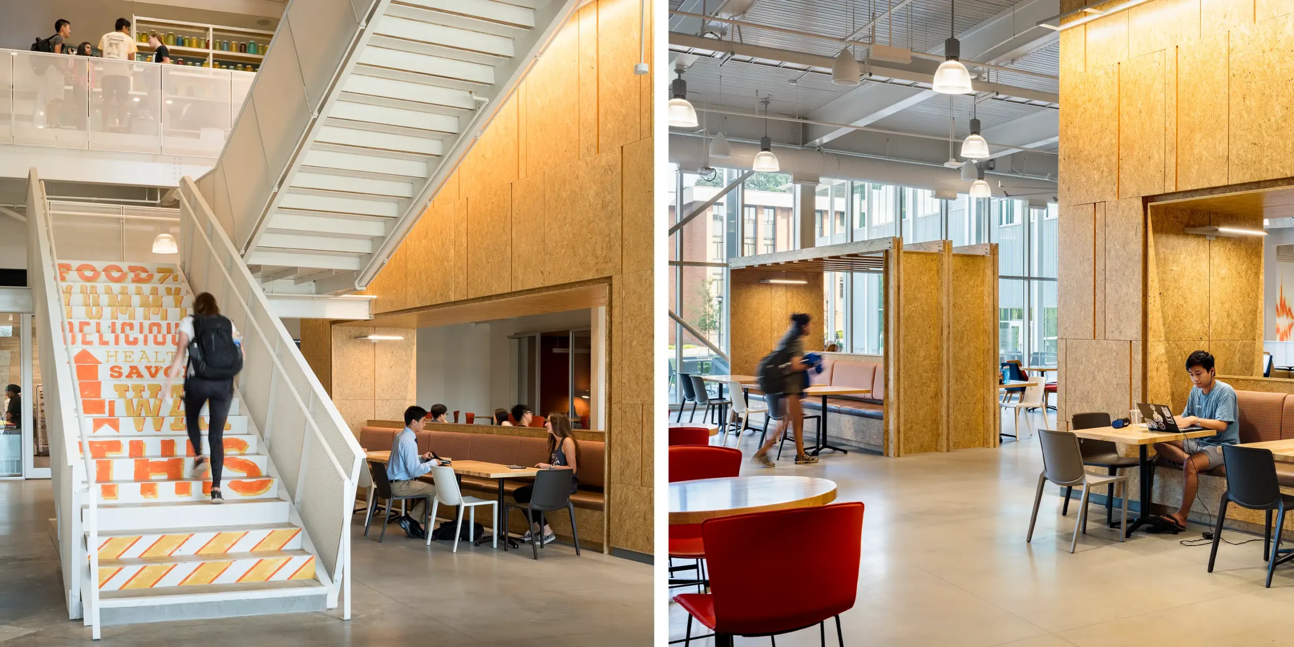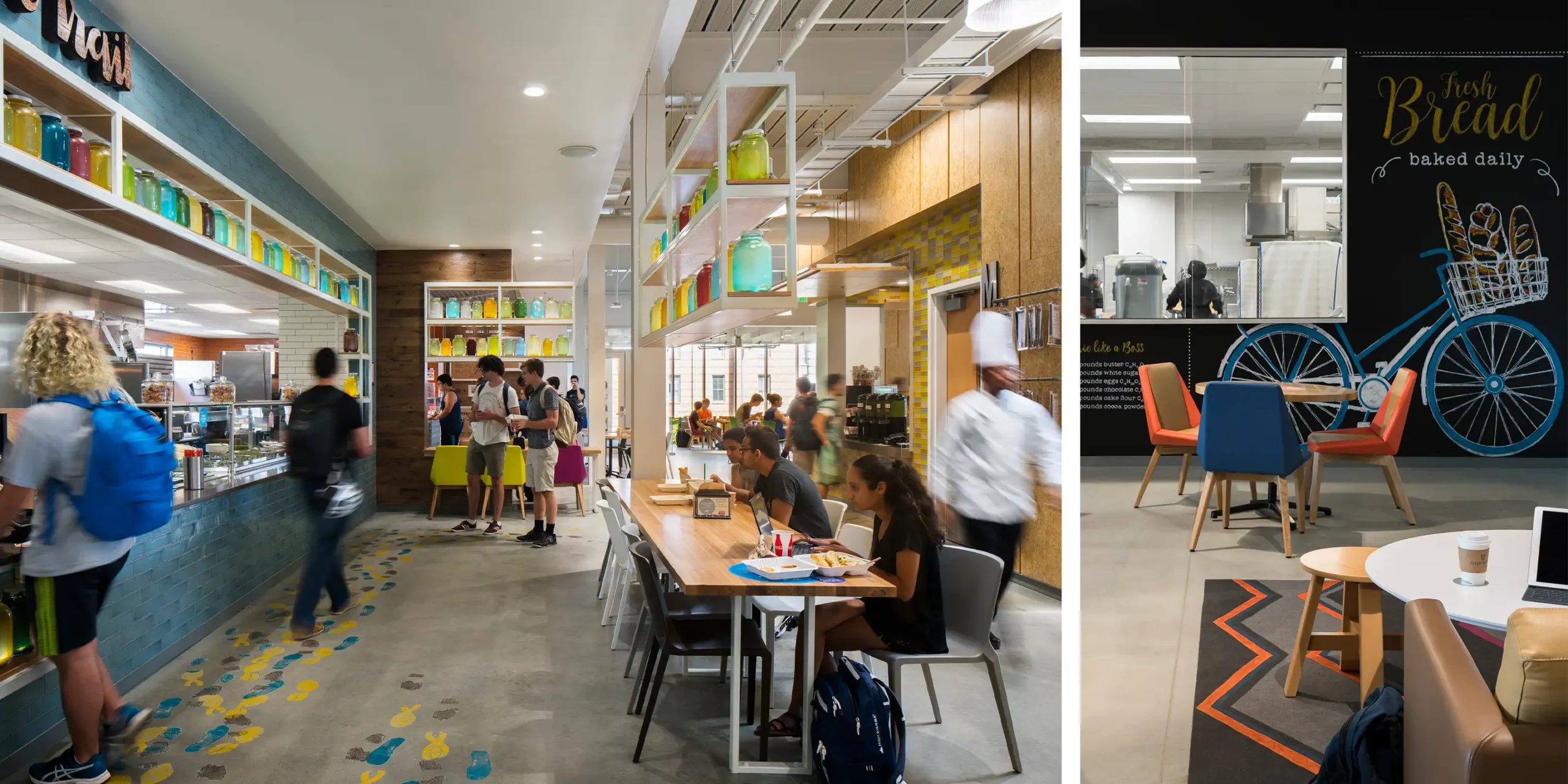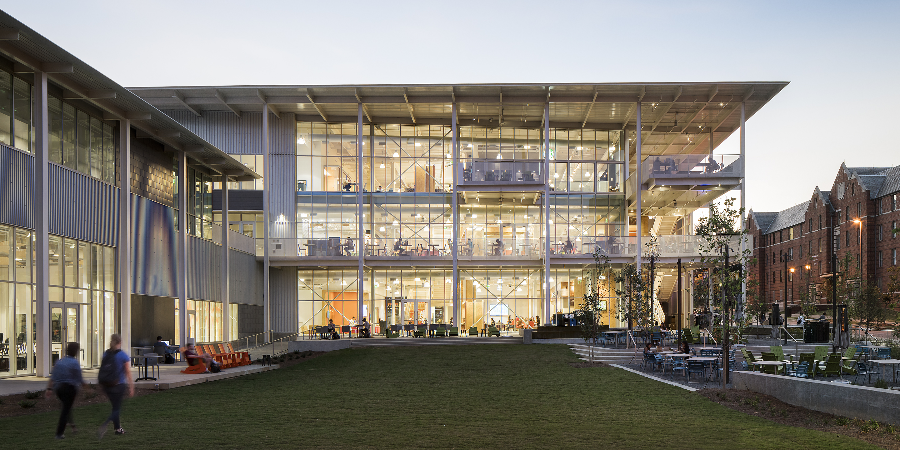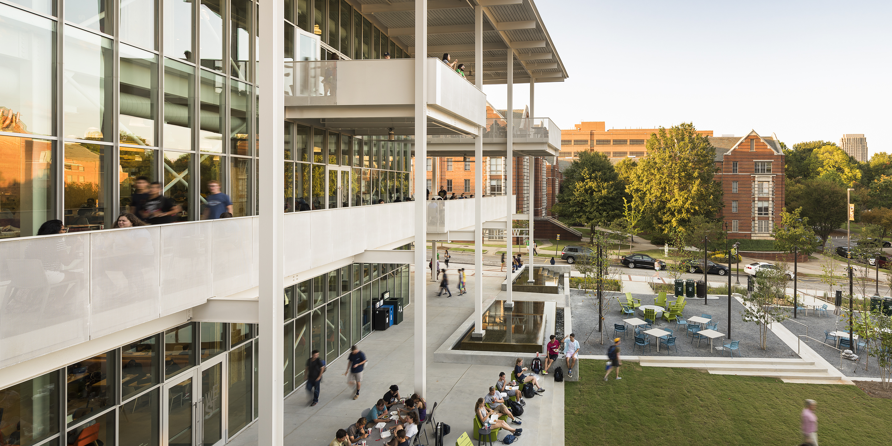 The flexible $23.7 million, 50,000 SF facility includes seven different food venues, support kitchens, offices, four academic classrooms designed for music rehearsal, and ample dining, meeting and study spaces. Blurring the boundaries between inside and out, day lit interiors open directly onto large terraces on all three levels, and bridges from the 2nd and 3rd floors create direct connections to the campus on all sides of the project. The upper levels offer spectacular views of the Atlanta skyline, while the ground floor spills out into the active landscape seamlessly integrated with the architecture. The variety of seating types and locations serves the community throughout the day, transitioning from active to reflective and back again to suit users’ needs.