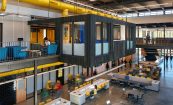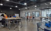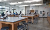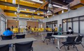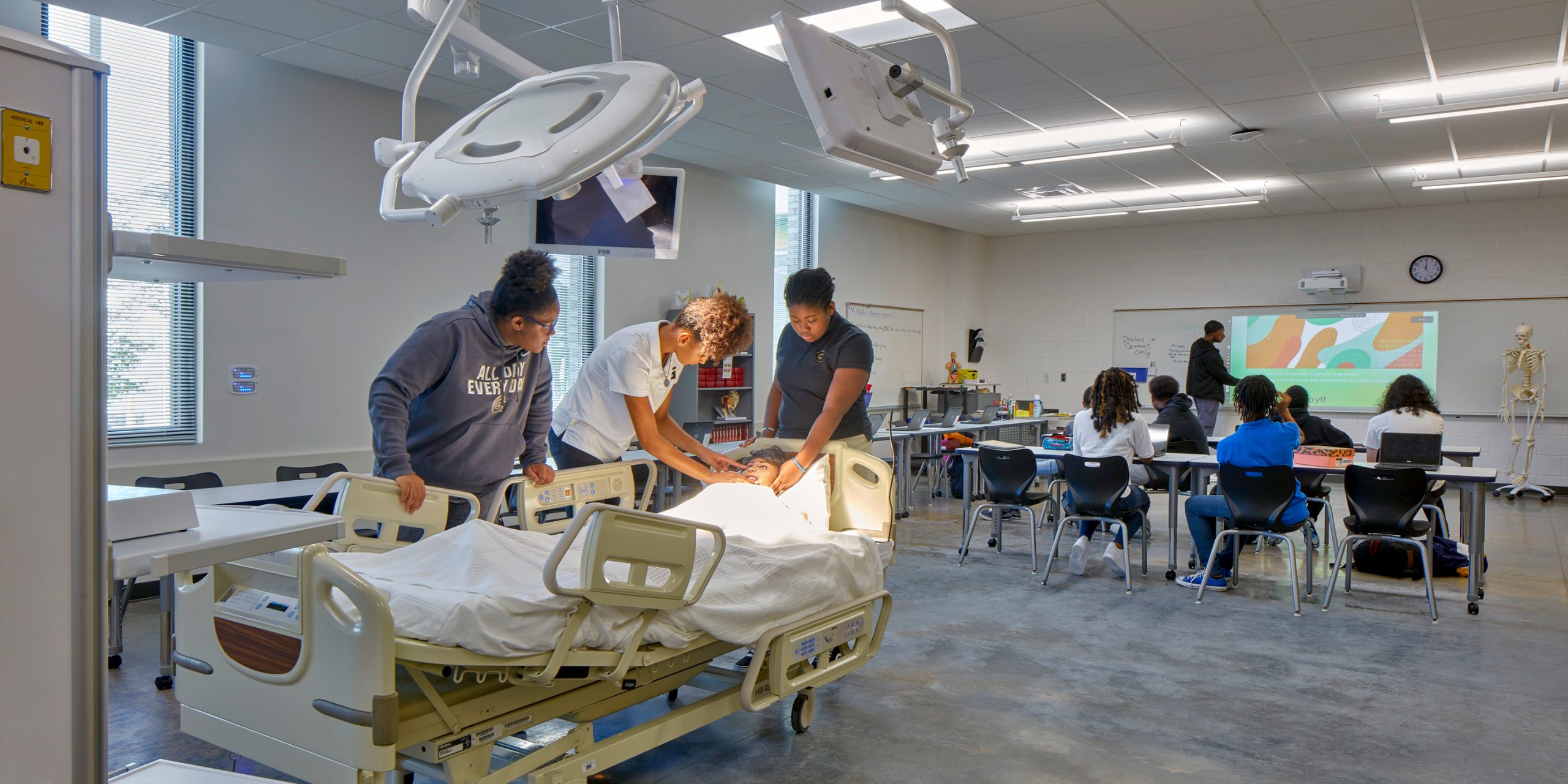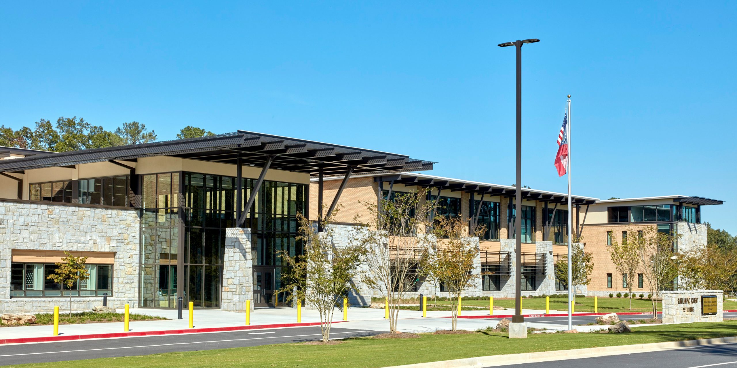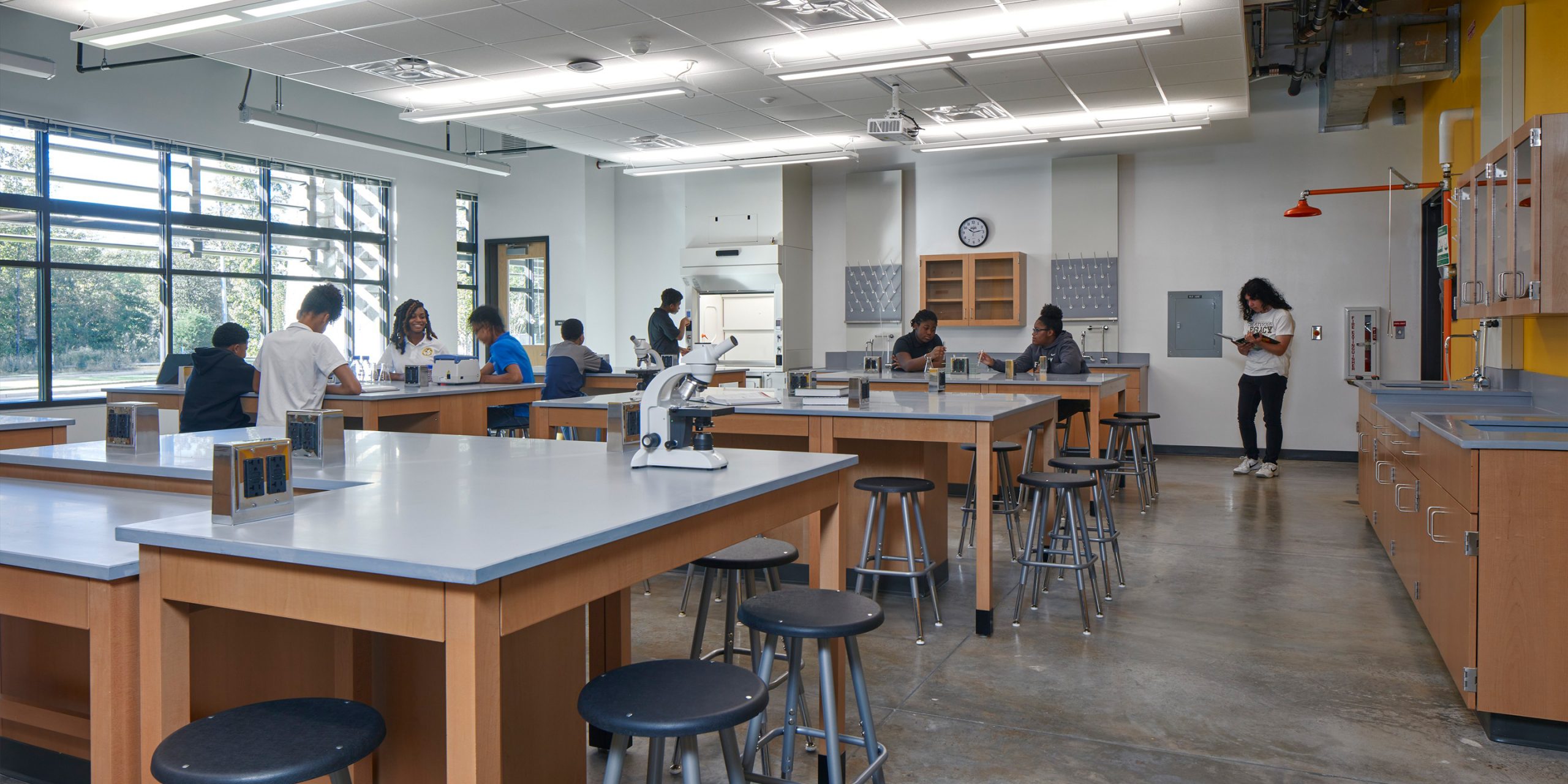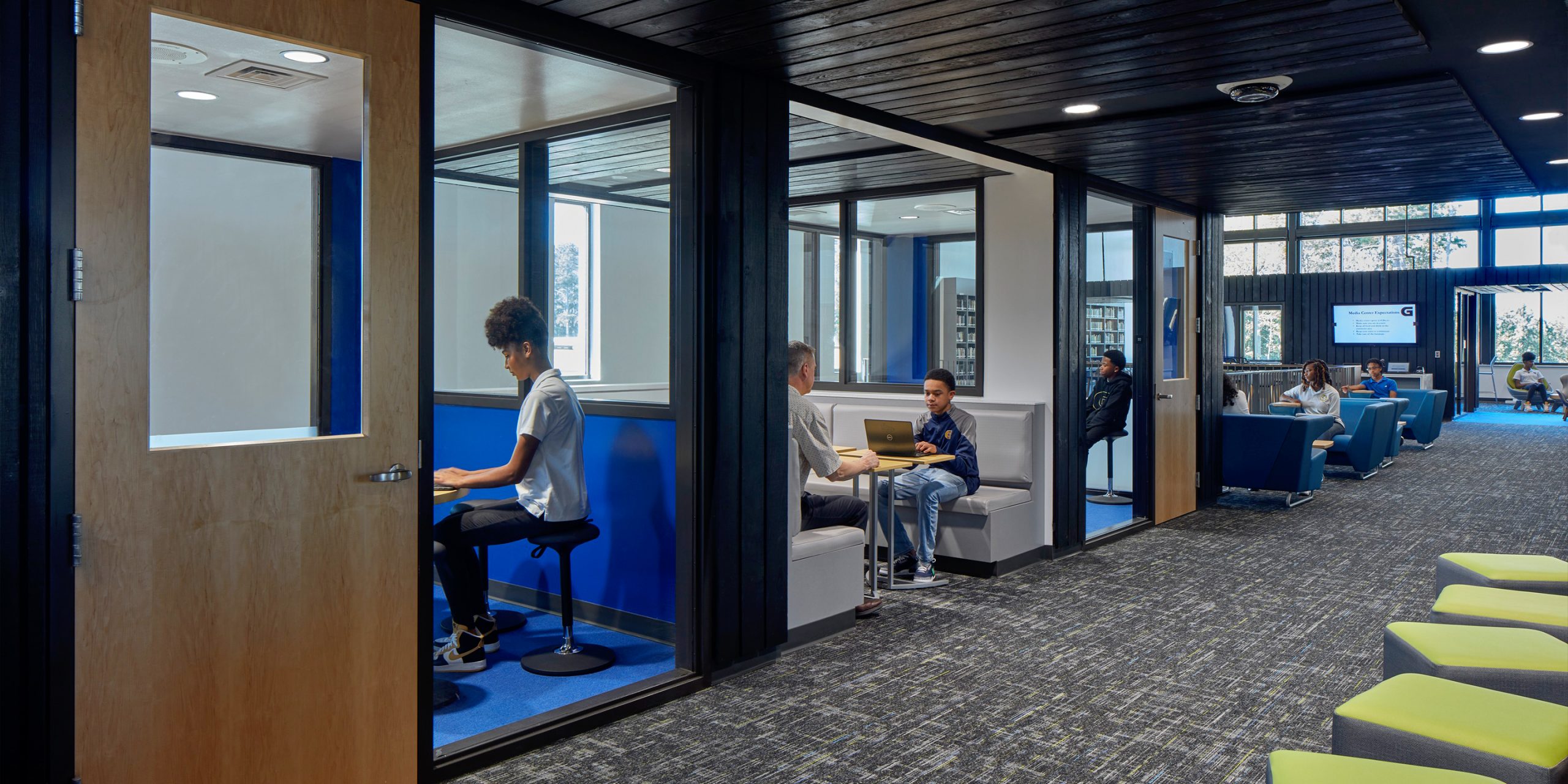 Located south of Atlanta in Fairburn, Global Impact Academy was designed to emulate a modern college setting with a contemporary spin inspired by the surrounding natural environment. The public STEM school provides students with access to cutting-edge amenities, like high-tech laboratories, medical simulation facilities, and a game design and VR hub created to foster inventive ideas and problem-solving techniques. Collaboration pods feature operable partitions for group learning, and independent classrooms are available to encourage team building and support design thinking among students. The double courtyard offers a makerspace, as well as tables and digital screens for teachers to have class outdoors or for business leaders to have information-gathering sessions for students.