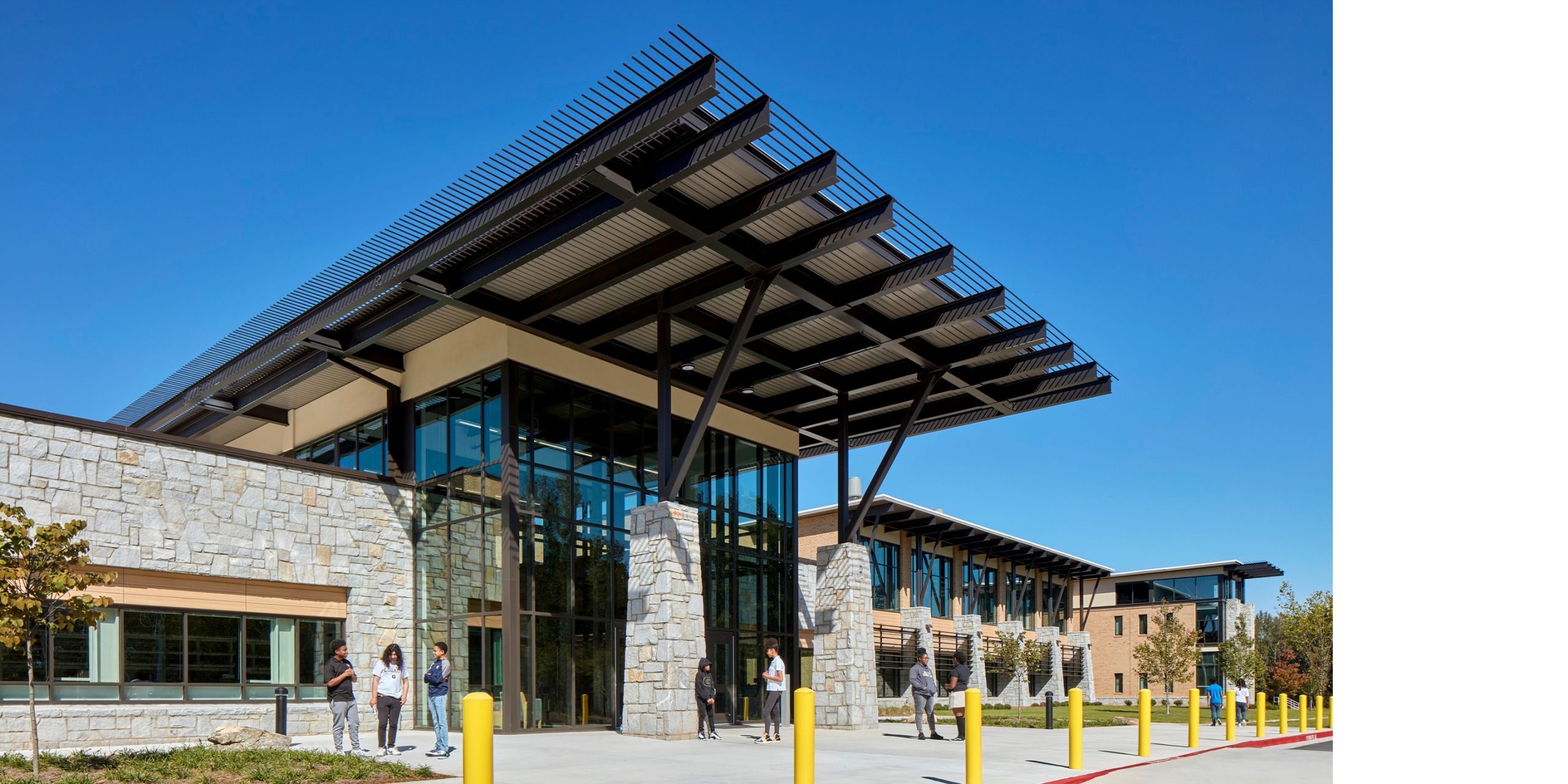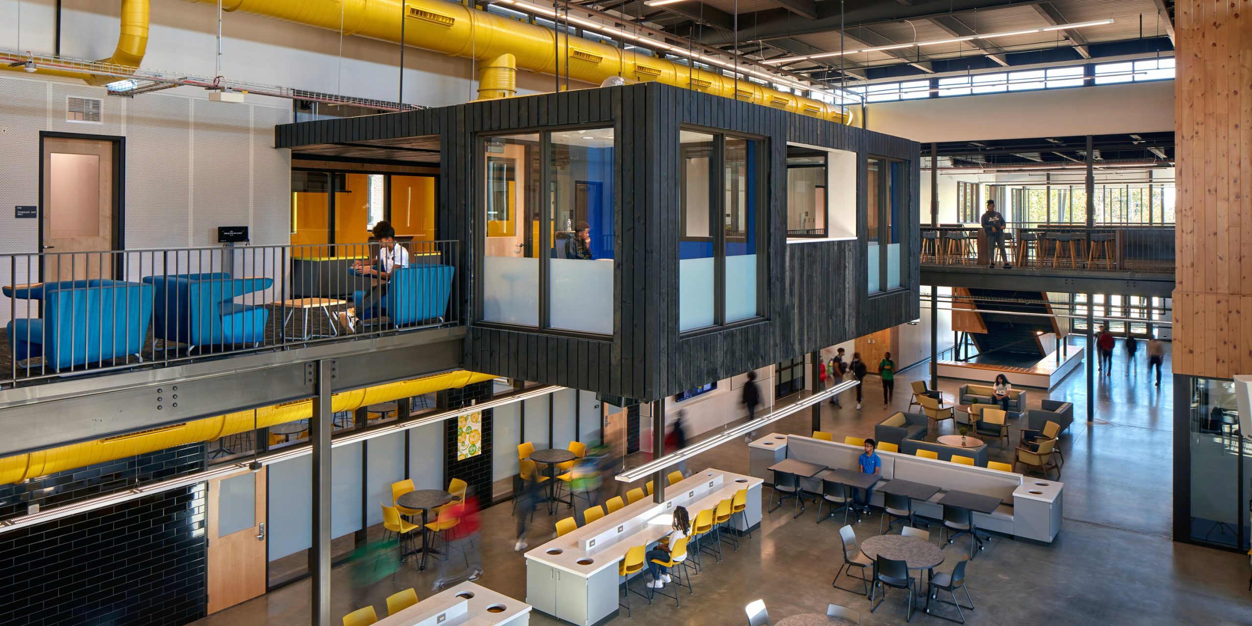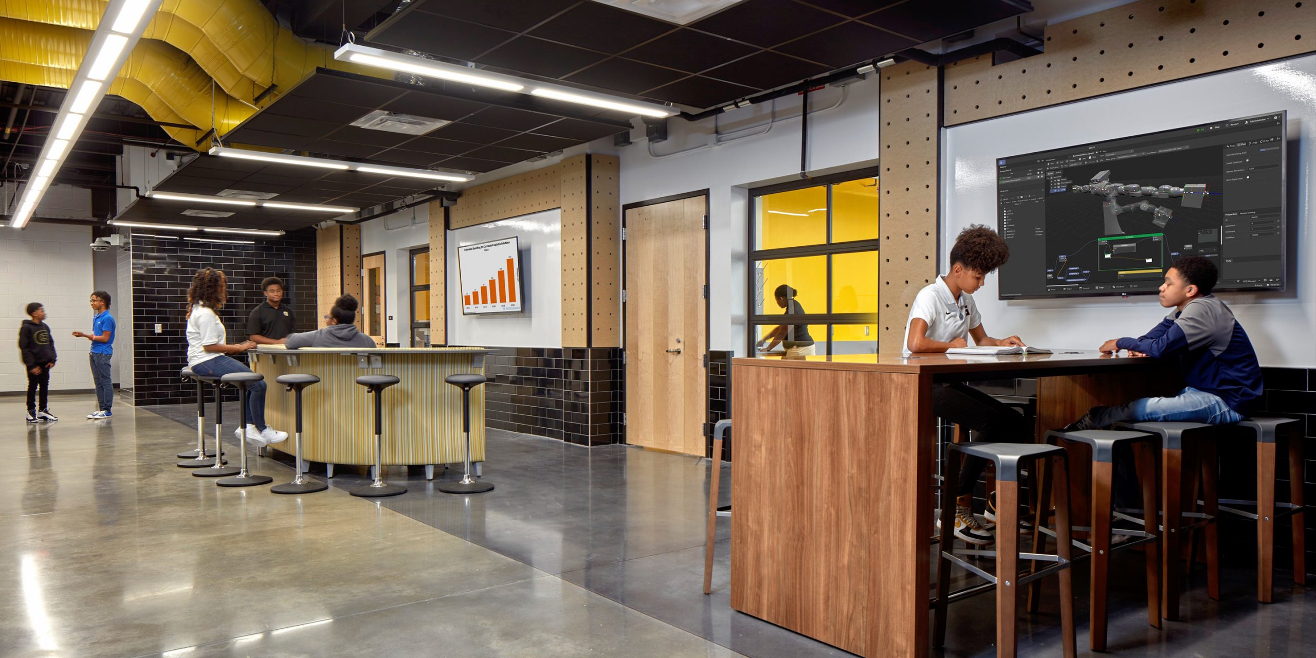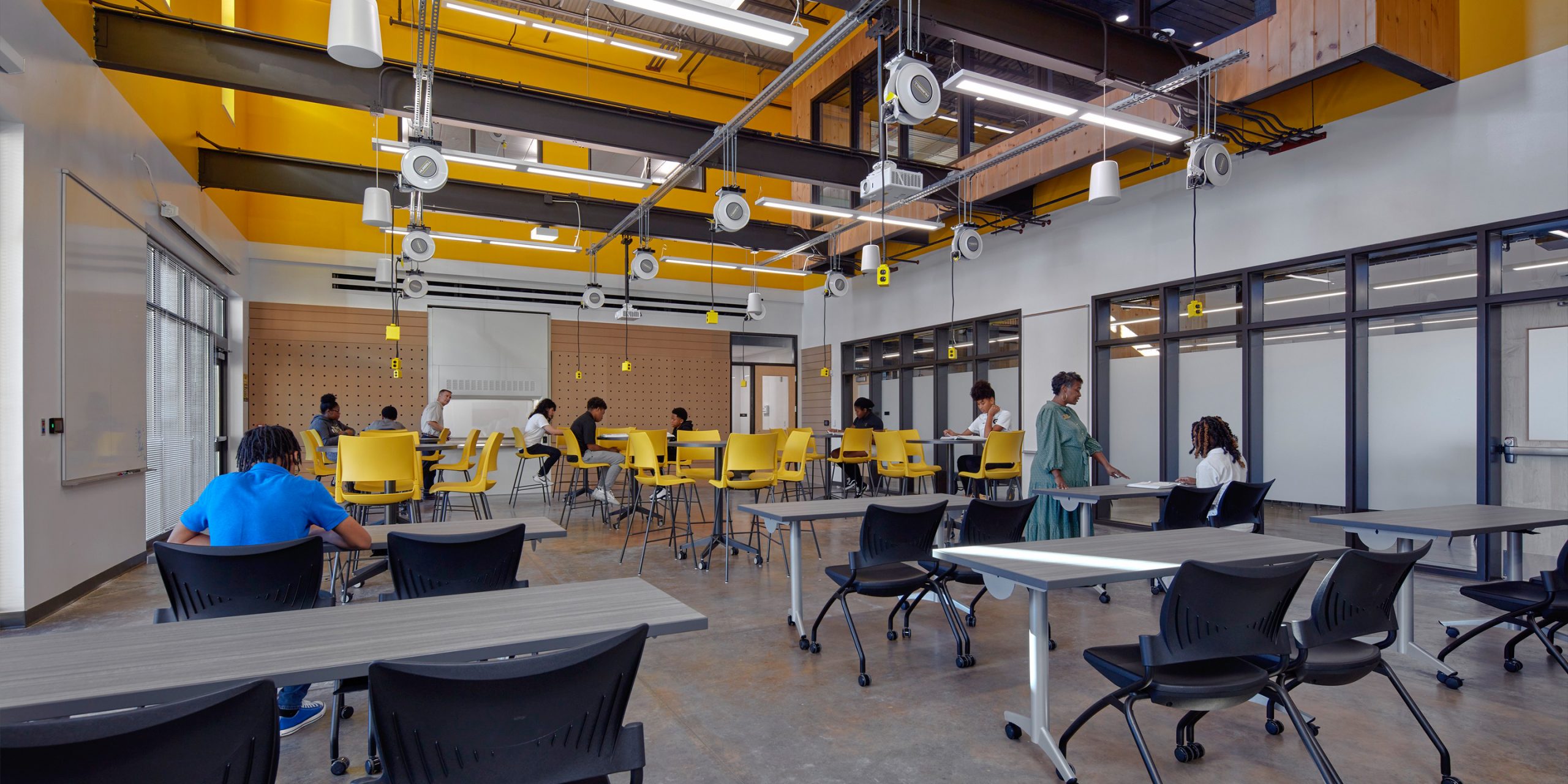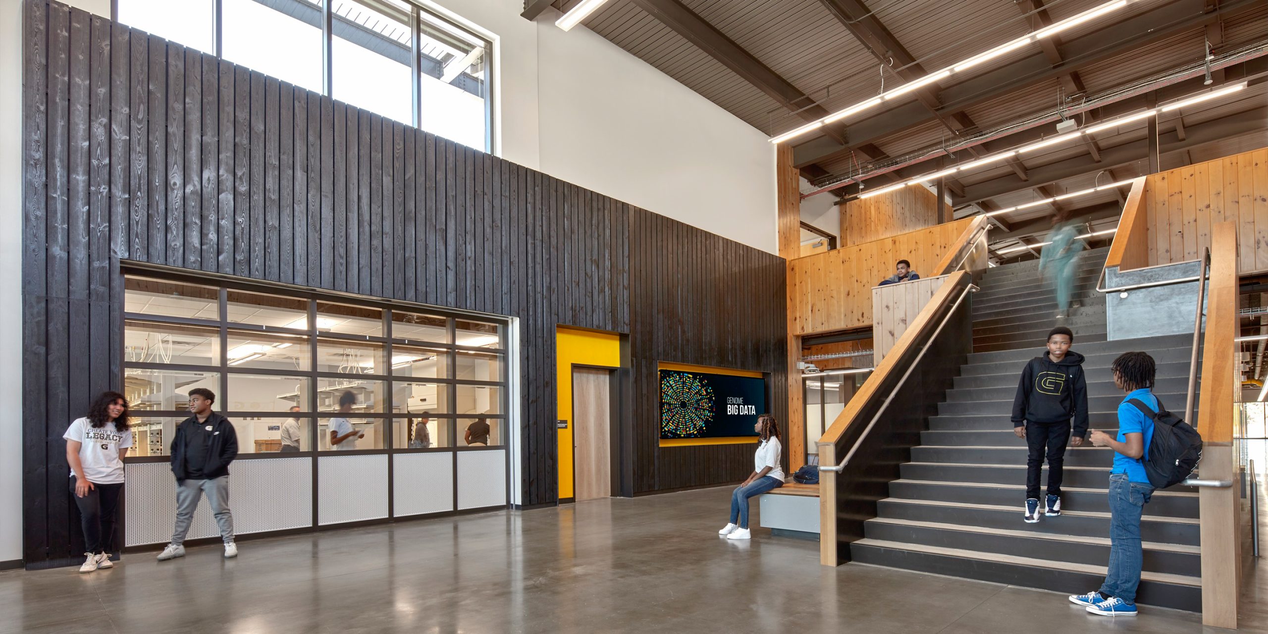 This project was designed by Cooper Carry’s K-12 Studio in collaboration with Cooper Carry’s Higher Education Studio and Science + Technology Studio. This unique blend of experience provided for vocational and career readiness strategies and specialized STEM design. Global Impact Academy’s modern focus is reflected in its industrial aesthetic, with interior exposed wiring and ductwork, prompting students to consider the mechanical components that support building functions. The exterior features materials like wood and stone, juxtaposed with expansive glass windows and steel beams. The Academy ensures that students can learn and grow in environments designed for their success.