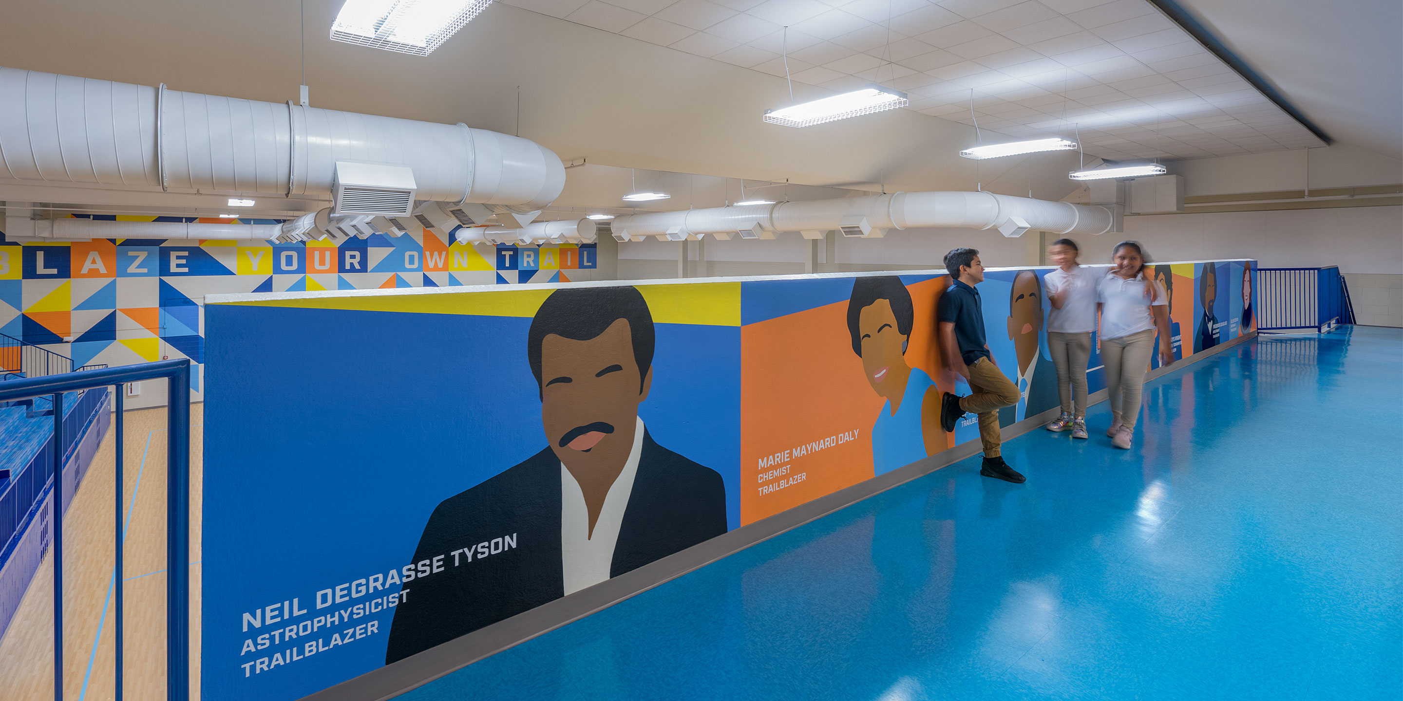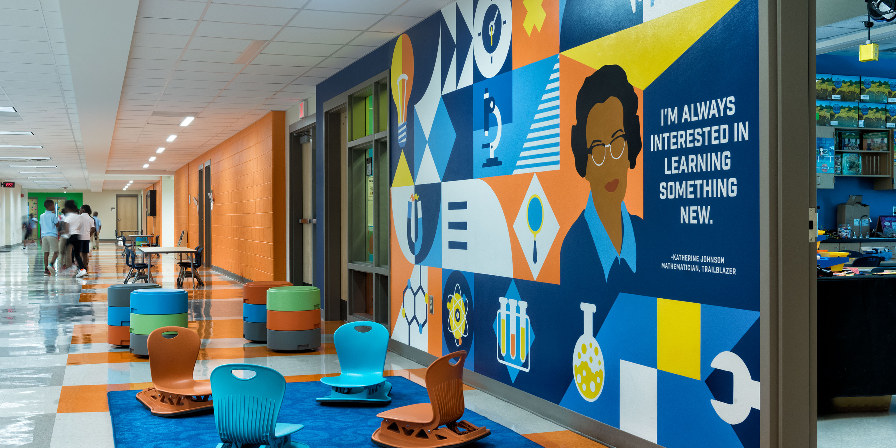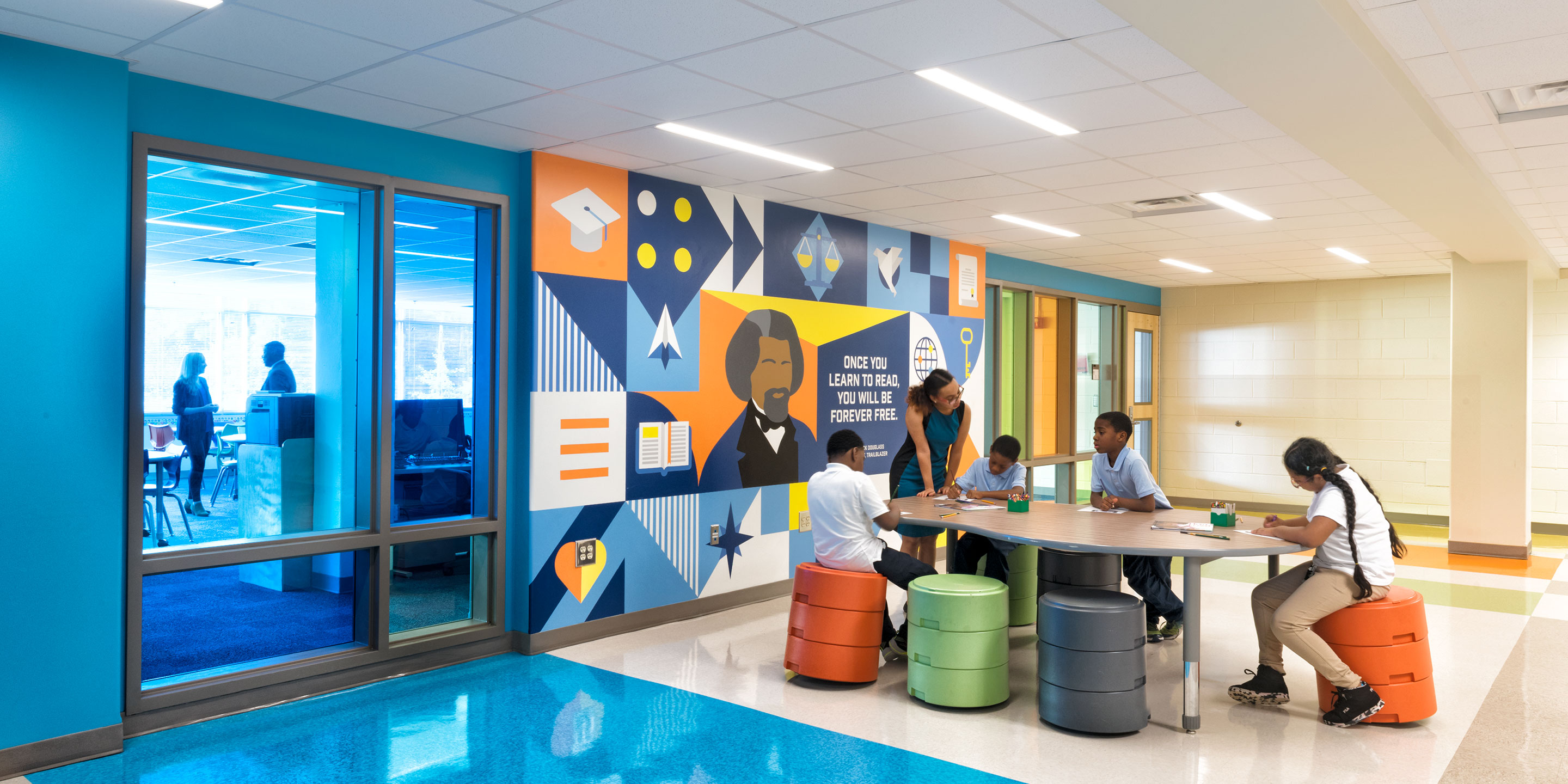 The Harper-Archer project consisted of the conversion of a middle school into a new elementary school for Atlanta Public Schools. The team coordinated closely with  school leadership to understand the joyful spirit of this elementary environment. Bright colors and graphics were designed and strategically incorporated throughout the building to create identity and aid in wayfinding. Created in coordination with the team, the design conveys the warmth and playfulness of early learning experiences and aim to capture the imagination and curiosity of the building’s young occupants.
