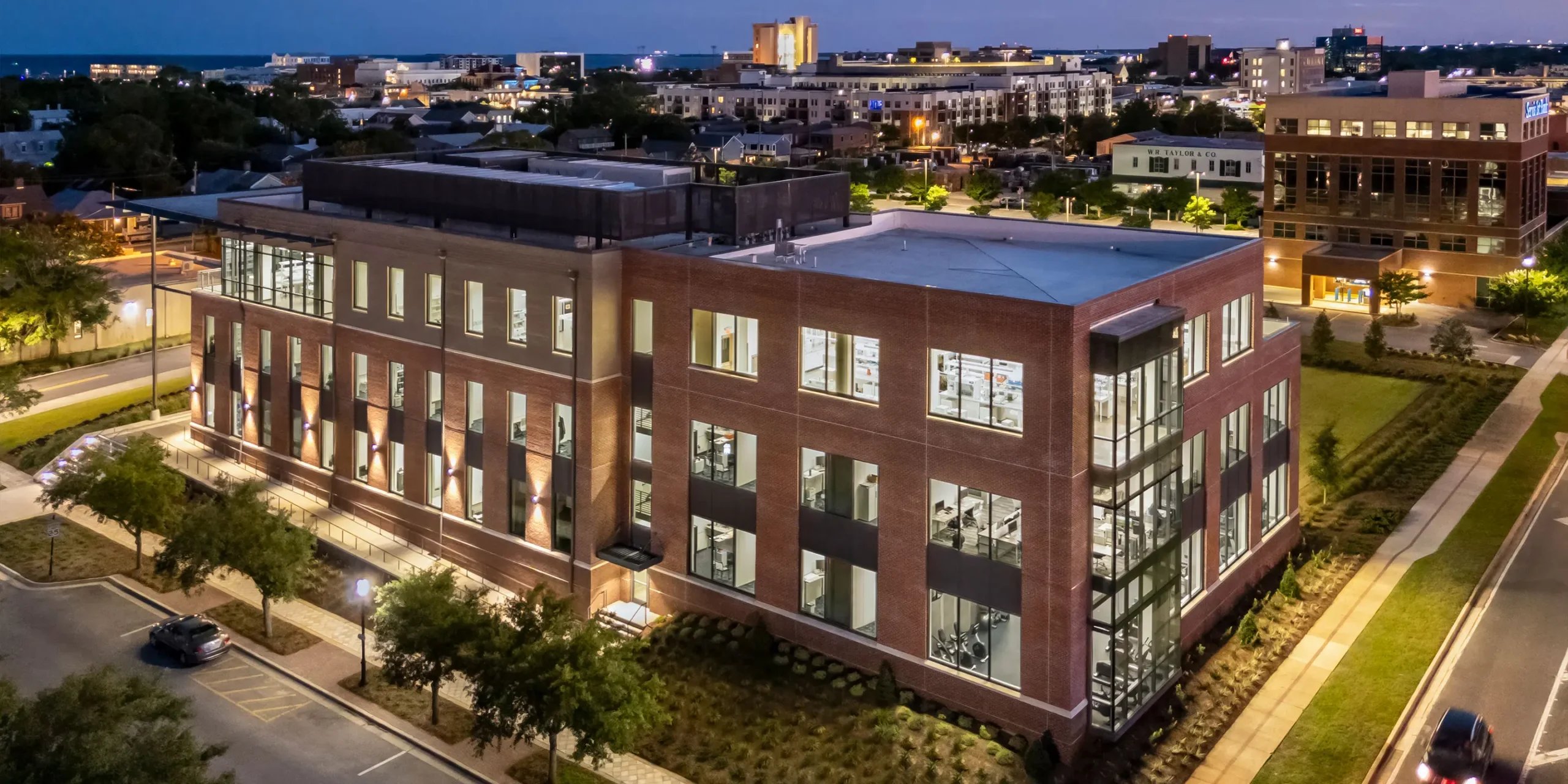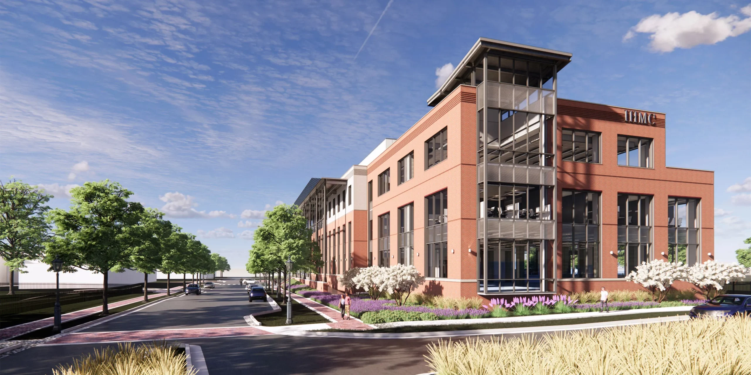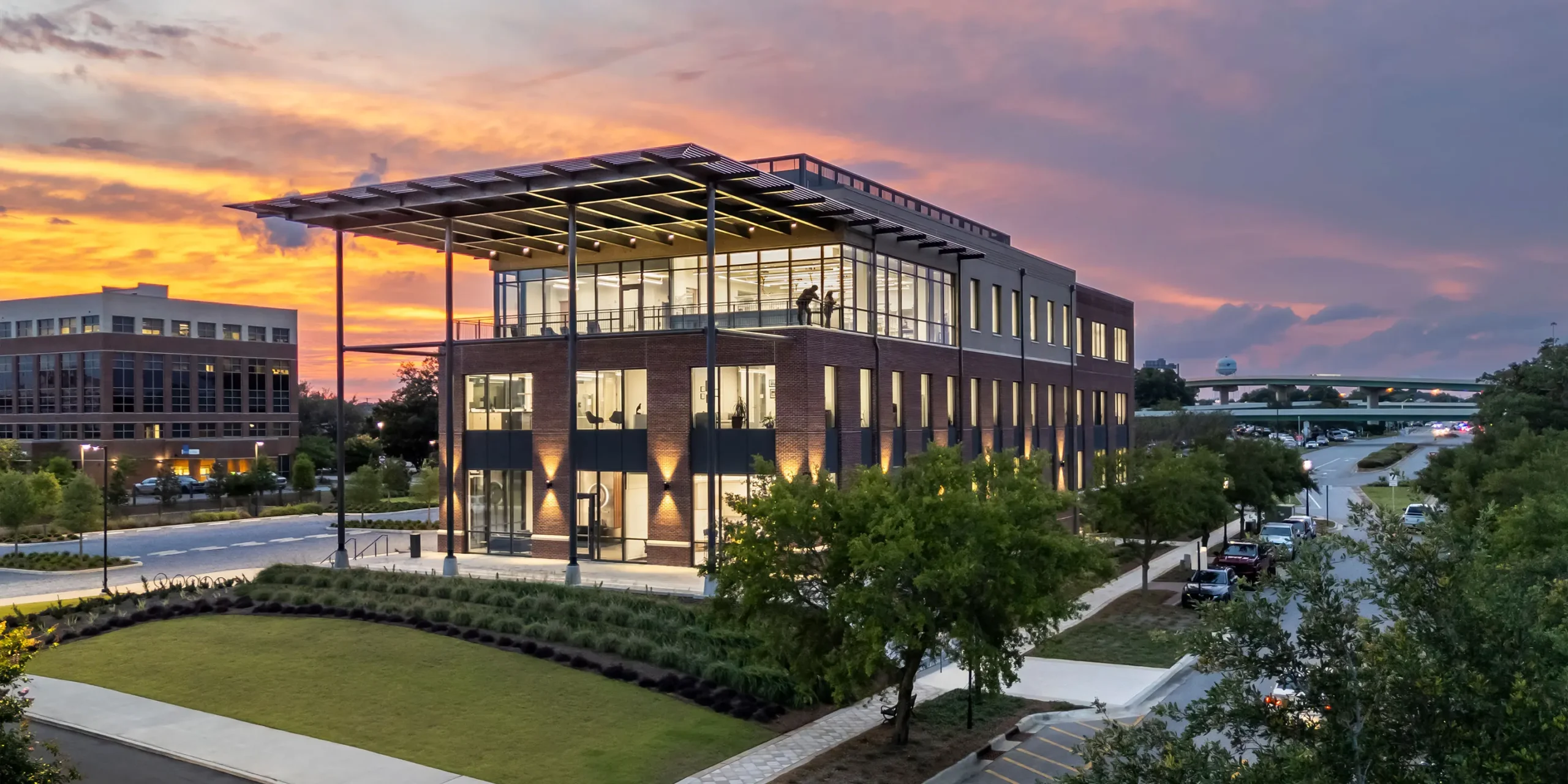 The exterior features a masonry veneer wall system with thermally broken curtainwall, Low-E glazing, and metal accents. A large canopy shades the south and east façades, while the third-floor terrace provides outdoor space with views of Pensacola Bay. The design complements the existing IHMC campus and the surrounding neighborhood.