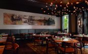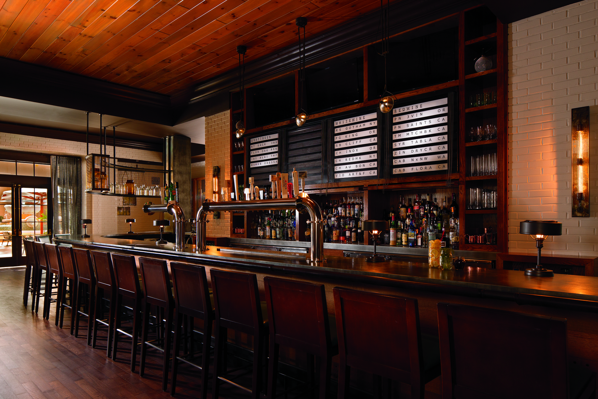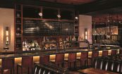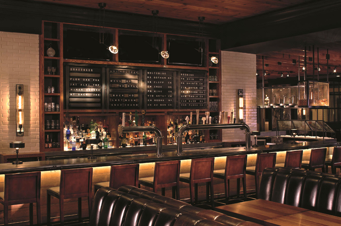 One of the many striking and unique features of Highball & Harvest at the Ritz-Carlton Grande Lakes in Orlando, Florida, is the train-board menu, operated by a steel-chain pulley system. While reminiscent of antique station boards, it rotates and displays a ready selection of craft beers, seasonal cocktails and signature keg wines. The spacious bar and lounge illustrate a sophisticated yet casual charm, with overstuffed leather furniture and a zinc patina bar top.
