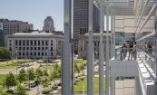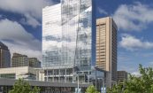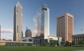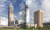 All of the older buildings flanking the Mall have a distinctive cornice line 90 feet above grade. The Hilton Hotel design has a cornice at 90 feet that becomes a tall porch and continues the strong horizontal line of the surrounding buildings. The porch connects the hotel to the Mall. The result is a modern building that connects to the historic context and that is unique to Cleveland. The glass tower of the hotel is articulated as three slender towers. Each of the three towers has a unique expression in the glass metal curtain wall. Near the top of the tower, the glass façade tilts out over the Mall. On the upper most floor a terrace for the rooftop bar is cut out of the glass providing an outdoor area overlooking the lakefront. The tower’s unique sculptural form will create an iconic image for Cleveland’s skyline. The hotel entry is on Lakeside Drive directly adjacent to the entry to the Convention Center to encourage a strong connection both visually and physically. The hotel’s restaurant and public spaces are positioned on the Mall. The project will seek to achieve a LEED-Silver certification.