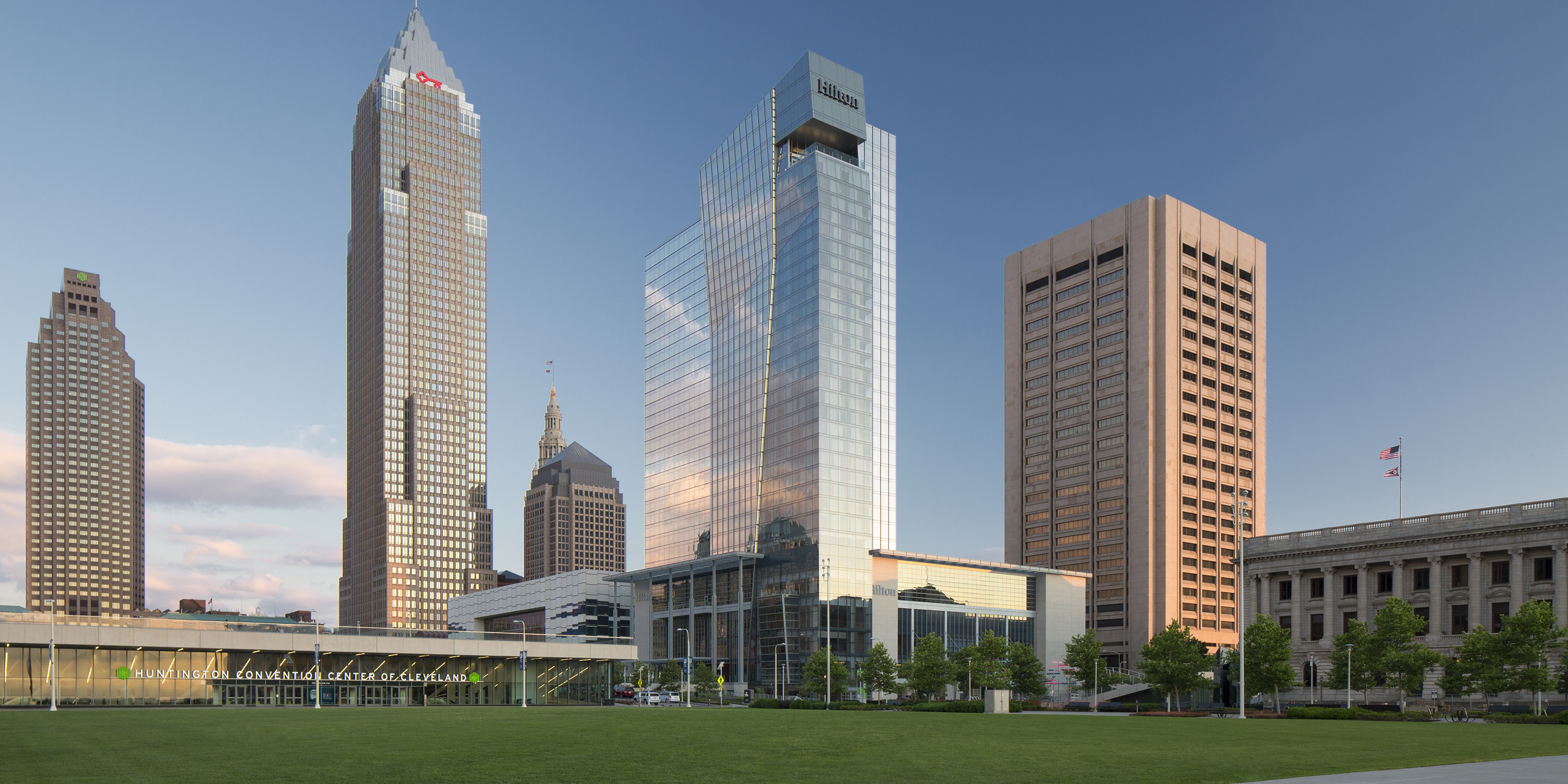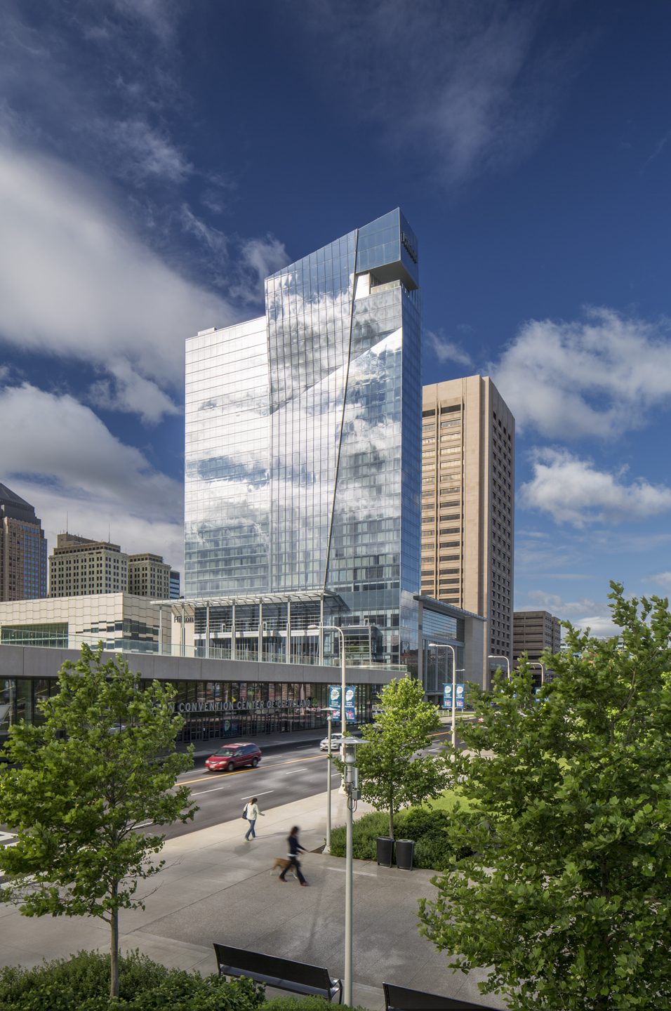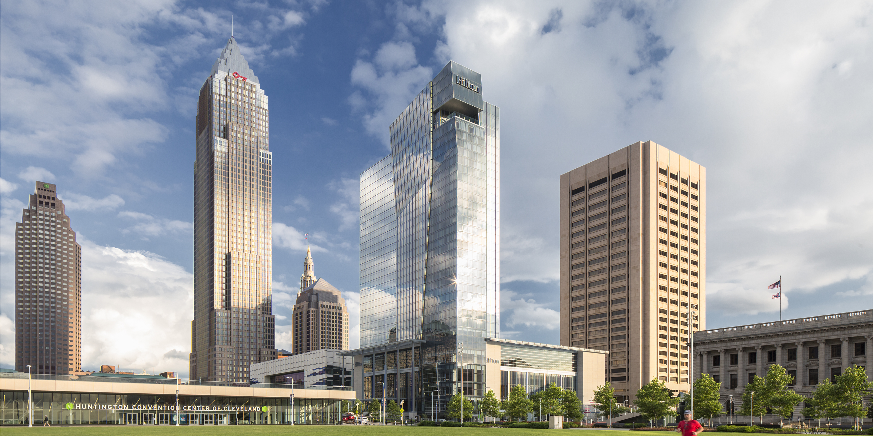 Downtown Cleveland as we know it today was designed in 1903 by Daniel Burnham as a vast green mall flanked by the city’s major government buildings. The Cleveland Mall is considered one of the major urban spaces in the United States (Burnham also completed designs for Washington DC and the Chicago Lakefront). The site for the Hilton Cleveland Downtown Hotel occupies the last available site on that civic green. Cleveland’s newly opened Convention Center is located under two thirds of the Mall. The county’s and city’s challenge to the architects’ team was to design a building respectful of the Burnham Plan that was unique to Cleveland, creating an iconic image for Cleveland’s skyline. The building can be viewed as having two parts: the building base and the building tower. The design for the building base was directly influenced by existing neoclassical buildings flanking the Mall. The shared characteristics of those buildings, base, middle and top, expressed with solid corners, were applied to the hotel base but in a modern architectural language.