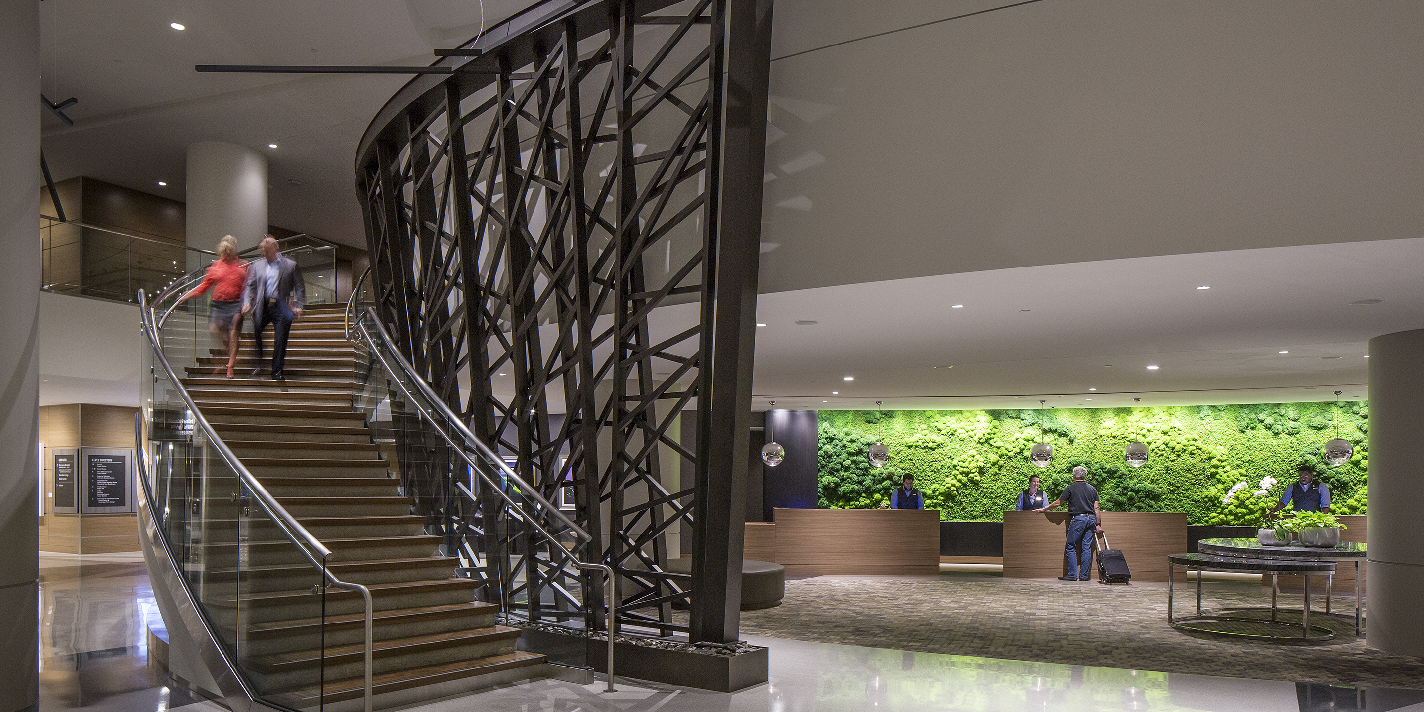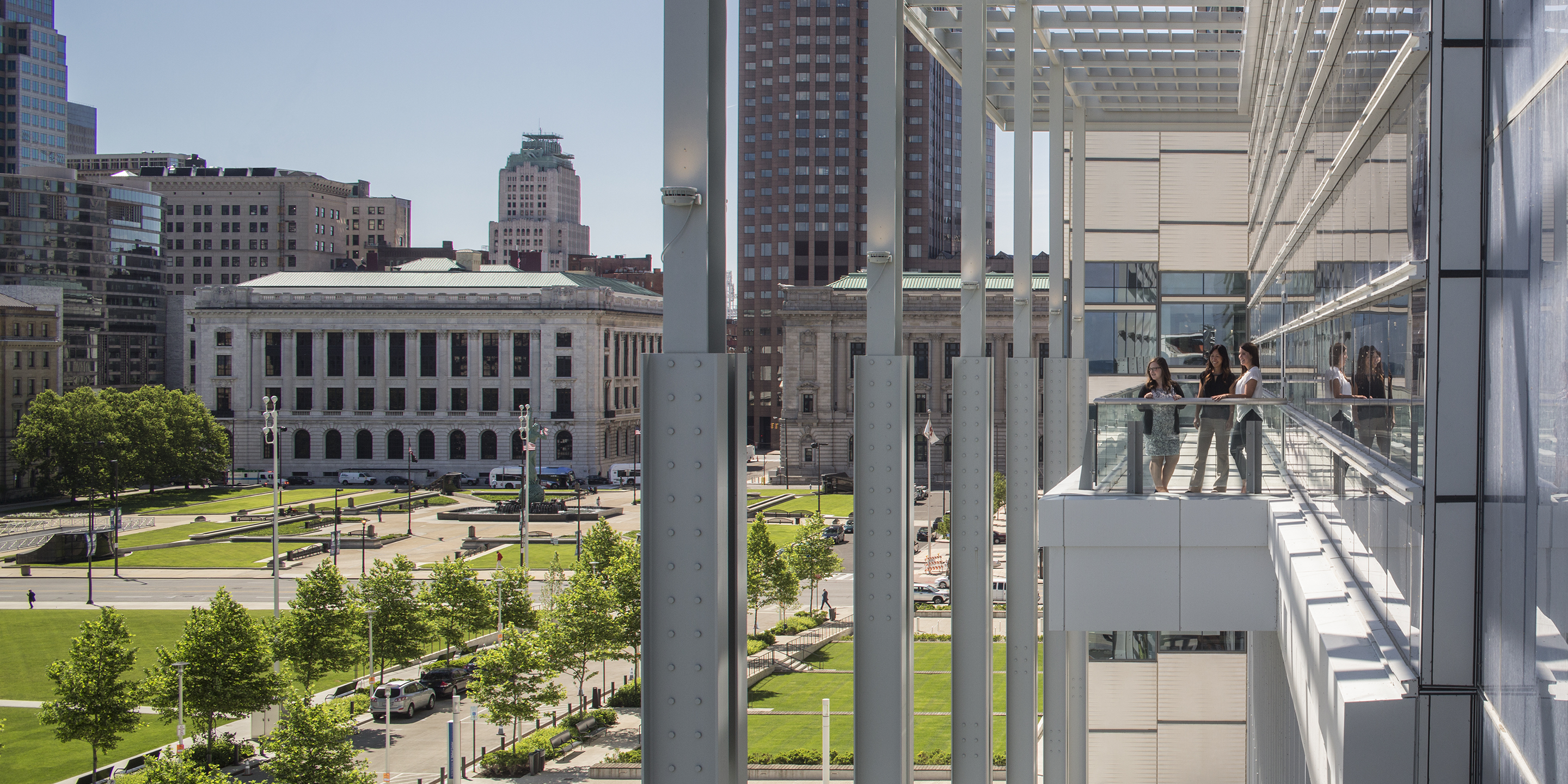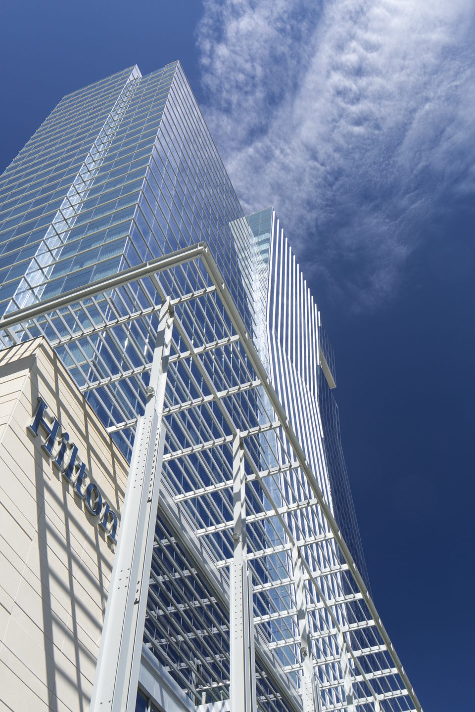 Downtown Cleveland as we know it today was designed in 1903 by Daniel Burnham as a vast green mall flanked by the city’s major government buildings. The Cleveland Mall is considered one of the major urban spaces in the United States (Burnham also completed designs for Washington DC and the Chicago Lakefront). The site for the Hilton Cleveland Downtown Hotel occupies the last available site on that civic green. Cleveland’s newly opened Convention Center is located under two thirds of the Mall. The county’s and city’s challenge to the architects’ team was to design a building respectful of the Burnham Plan that was unique to Cleveland, creating an iconic image for Cleveland’s skyline. The building can be viewed as having two parts: the building base and the building tower. The design for the building base was directly influenced by existing neoclassical buildings flanking the Mall. The shared characteristics of those buildings, base, middle and top, expressed with solid corners, were applied to the hotel base but in a modern architectural language.